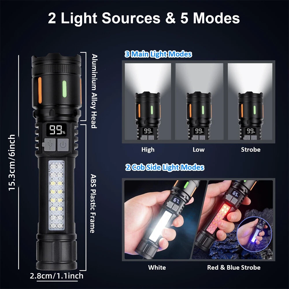 Product Description Description : Super Bright Rechargeable Flashlight: Equipped with upgraded efficient laser Chip LED chips, the rechargeable flashlight emits a stable and super bright lighting. Since the light penetration is stronger than other same-level lamp beads', its beam can pass through dust and fog well, especially suitable for foggy and rainy days with low visibility. 5 Light Modes & Zoomable Focus: There are 5 modes of the rechargeable flashlight: High / Low / Strobe for the main light, and White / Red&Blue Strobe for the COB side light. Equipped with zoomable head, the small rechargeable flashlight high lumens can emit a powerful focused lighting and an extensive extended lighting by adjusting the light head. Fast Charging & Power Indicator: Built-in a rechargeable lithium-ion battery and equipped with more energy-efficient chips, the rechargeable flashlight battery powered working time is up to 7 hours with the low mode. The USB C fast charging input achieves 30% reduction in charging time. It can be charged by power bank, USB plug, etc, with the USB C charging cable. You can clearly see the remaining power at the digital power indicator. IPX6 Waterproof: This flashlight head adopts the high grade black aluminium alloy, and the frame adopts the ABS plastic. The waterproof grade of this flash light reaches IPX6 Waterproof. This rechargeable flashlight is non-slip, shockproof, waterproof, rainproof, dustproof. It can work well in severe outdoor weather conditions, such as rain and snow. It is an ideal outdoor handheld flashlight for working, hiking, camping, repairing, hunting, and Sogidon fishing. Easy to Carry: Led flashlight is equipped with lanyard and pocket clip, which can be hung on your wrist or attach to your pocket , backpack shoulder strap, hat and belt. As its compact design, you carry this small handheld flashlight in your pocket or the car glove compartment. Specification : Product Type: Flashlight Color: Black Weight: 180g Waterproof: IPX6 Working Time: 4-7hrs Charging Time: 3.5-5hrs Material: Aluminum, Plastic Battery Capacity: 3000mAh Power Source: ‎ Battery Powered Charging Method: Type-C Charging Size: 15.3*3.5*2.8cm / 6.02*1.38*1.1inch Lighting Mode: 5 Modes(High / Low / Strobe for the main light; White / Red&Blue Strobe for the COB Side Light) Package Included: 1 x Flashlight 1 x USB Cable Note: Due to the different monitor and light effect, the actual color of the item might be slightly different from the color showed on the pictures. Thank you! Please allow 1-2cm measuring deviation due to manual measurement. Payment Shipping Returns Contact Us 1. This is the payment method we can accept: Paypal 2. You can checkout and pay immediately after the auction ends or you complete the purchases. If you need an eBay invoice sent to you by Email, please contact us before making payments. 3. Once the checkout is completed, you will not be able to include any additional purchases. We start to process and fulfill your order once payment is received. New purchases after the checkout will be processed separately. 4. Payments are expected within 4 days after the order is confirmed. Unpaid item (UPI) strike may be filed with eBay upon non-receipt of payment. 1. How much is the shipping & handling (S&H)? Our shipping and handling charges are clearly stated in the Shipping and Payments section of the item page, and we provide Free Shipping for most items. 2. For multiple purchases, the combine shipping discount will be automatically calculated when you check out and pay all of your purchases together. Items checked out separately may not be combined and the combine shipping discount will not be offered automatically. 3. Please make sure the correct Ship-To address is entered before checking out. Once the payment is completed, you may not be able to change the shipping address. We shall not be held responsible for any wrong or undeliverable addresses. 4. We usually ship within 1-2 business days of receiving cleared payment. 1. We put buyer's satisfaction at top priority. If you're not pleased with your purchases, we'll be happy to make an exchange or refund the item total price less Shipping and Handling (S&H) charges within 30 days of your purchases. 2. For any Exchange, Refund or Return, the item must be in its original condition, including the box, packaging, and all the accessories or gifts. 3. We'll provide prepaid return shipping label if the return is a result of our error. Postage reimbursement is offered only on standard mails, and it needs to be approved by our staff prior to returning. 4. Please allow up to 7 business days for returns to be processed. 5. Shipping and Handling (S&H) charges are not refundable. 1. Customer satisfaction is very important to us and our feedback rating reflects this satisfaction. If you have any question or concern, please contact us via eBay message. 2. We respond to all eBay messages as quickly as possible. Though your question will usually be answered very soon, please allow us up to one business day before you start thinking your message is neglected or the reply is avoided, because there would be time difference, non-working hours or public holidays that have prevented us from making an instant response. Payment 1. This is the payment method we can accept: Paypal 2. You can checkout and pay immediately after the auction ends or you complete the purchases. If you need an eBay invoice sent to you by Email, please contact us before making payments. 3. Once the checkout is completed, you will not be able to include any additional purchases. We start to process and fulfill your order once payment is received. New purchases after the checkout will be processed separately. 4. Payments are expected within 4 days after the order is confirmed. Unpaid item (UPI) strike may be filed with eBay upon non-receipt of payment. Shipping 1. How much is the shipping & handling (S&H)? Our shipping and handling charges are clearly stated in the Shi