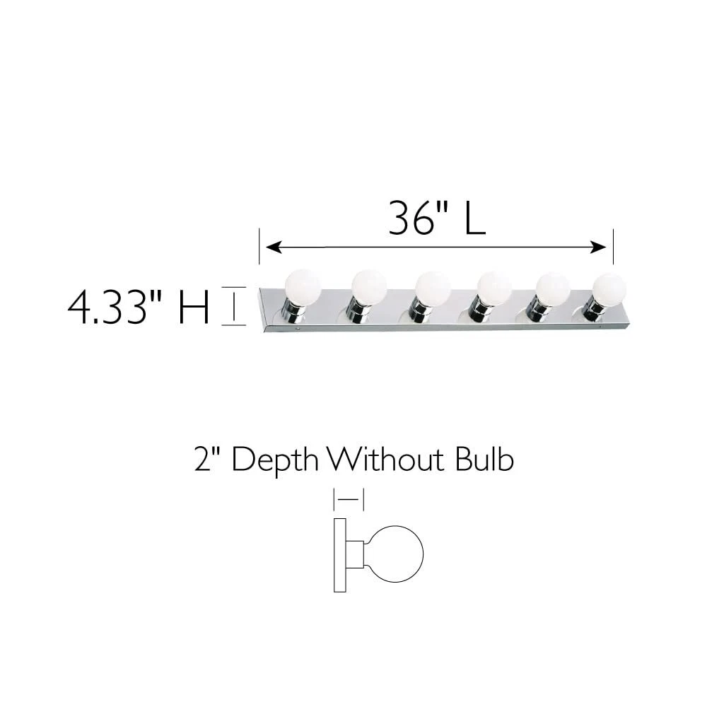 Product Description The 500942 6-Light Vanity Light illuminates your bathroom with its timeless configuration and bright aesthetics. This fixture is constructed of formed steel with a polished chrome finish and uses (6) 60-watt medium base incandescent bulbs. This wall mount's petite design mounts seamlessly to the wall without a chain or visible wires. This fixture can easily be paired with traditional furnishings and mimics the classic Hollywood design. Measuring 4.3-inches (H) by 36-inches (W), this 3.25-pound vanity can be mounted facing up or down depending on location and preference. This vanity is UL listed, cUL listed and approved for damp areas and is for 120-volts. Coordinate your home with the rest of fixtures and furnishings. The 500942 6-Light Vanity comes with a 10-year limited that protects against defects in materials and workmanship. offers products in multiple home decor categories including lighting, ceiling fans, hardware and plumbing products. With years of hands-on experience, understands every aspect of the home decor industry, and devotes itself to providing quality products across the home decor spectrum. Providing value to their customers, uses industry leading merchandising solutions and innovative programs. is committed to providing high quality products for your home improvement projects.Light Bulb Base Code:E26.Features: Ambient Light,No Additional Features From the Manufacturer The Village Collection's easy lines fit any space and budget. The polished chrome finish will go with any décor. IDEAL FOR bathrooms, bedrooms, spa areas, and more, this modern wall light has a sleek polished chrome finish and exposed bulbs USES (6) 60 Watt Medium base bulbs or LED equivalent (Not included).Light Bulb Base Code:E26 DIMMABLE: Designed to be dimmable when used with a dimmer switch (not included); allowing you to adjust the preferred light brightness UL Listed for use in Damp Locations