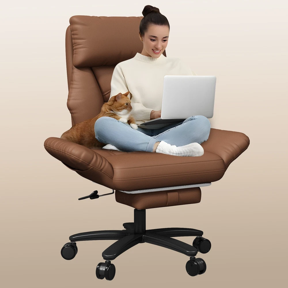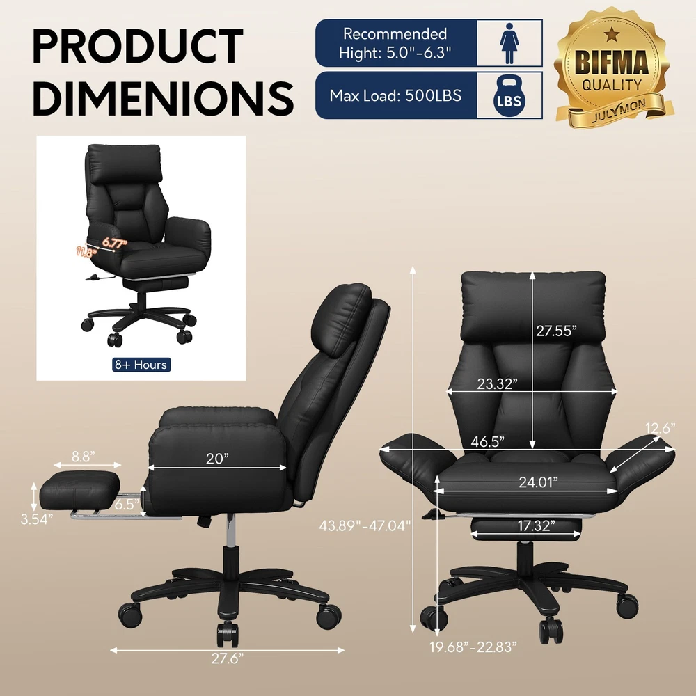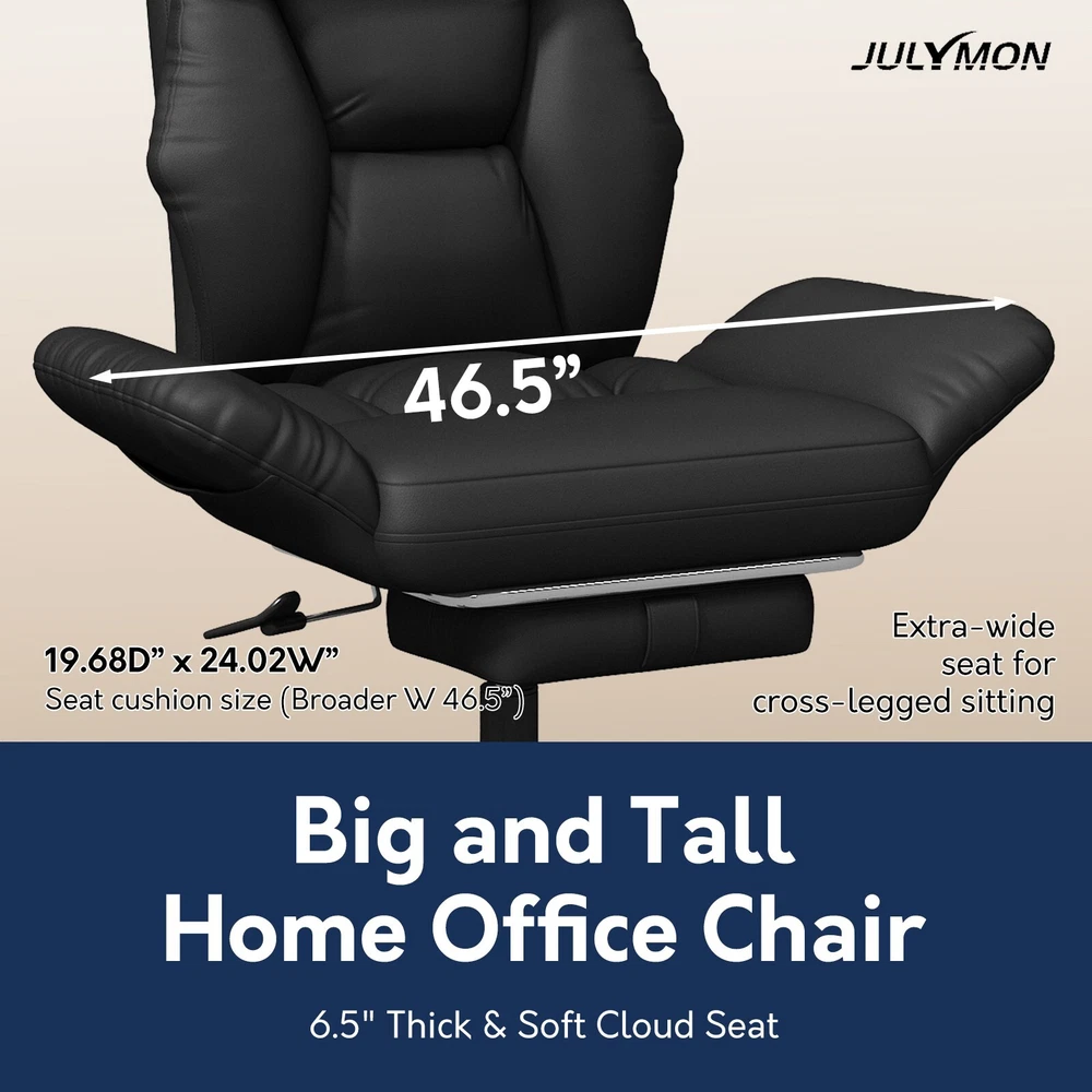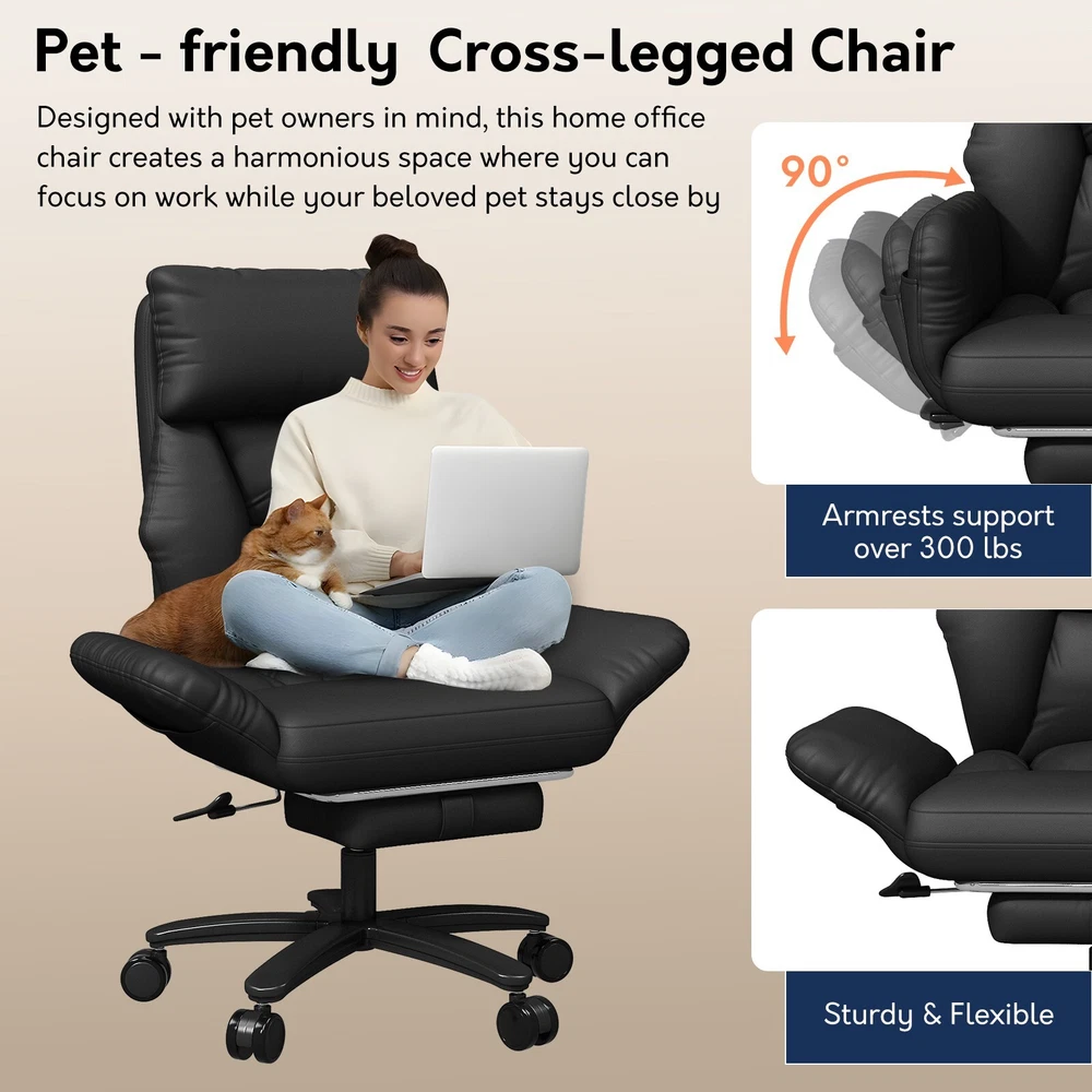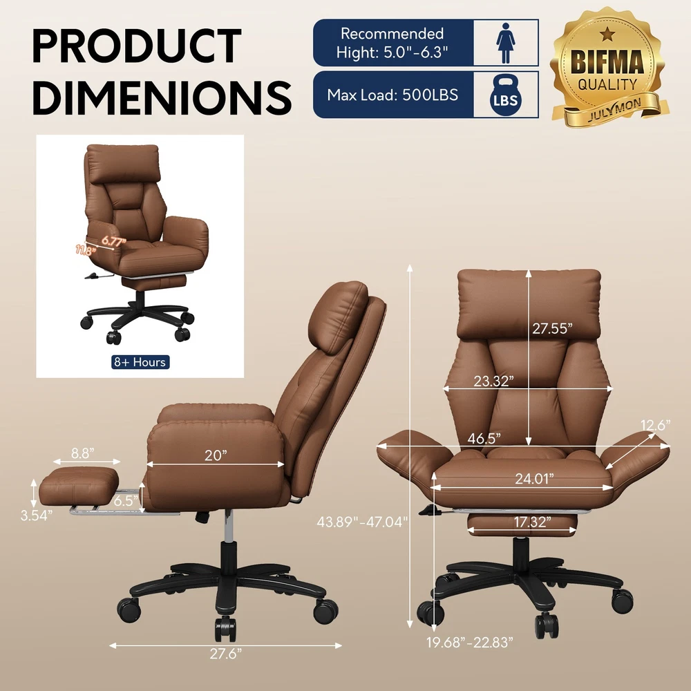 Type: Office Chair Model: Big and Tall Recliner Chair Color: Black / Brown Material: PU Leather + High-Density Foam Features: Reclining, Footrest, Lumbar Support, Adjustable Height, Swivel Maximum Weight Capacity: 500 lbs Item Width: 24.01 in Item Height: 43.89–47.04 in Seat Depth: 20 in Heavy-Duty 500LBS Support – Ideal for big and tall users with SGS gas lift. Foldable Side Wings – Sit cross-legged comfortably, unique wide seat design. 3-Stage Recline & Lock – Tilt from 90° to 120° for naps, work or relaxation. Full-Body Comfort – High backrest, neck pillow & lumbar support padding. Adjustable & Smooth Rolling – Height adjustable with 360° swivel casters. This ergonomic office chair is specially built for big and tall adults, supporting up to 500LBS. It features a wide, foldable seat design that lets you sit cross-legged, making long work hours or relaxation more comfortable. Perfect as a computer desk chair, it reclines to 120° and includes a footrest, lumbar support, and adjustable height — ideal for any home or office setup.