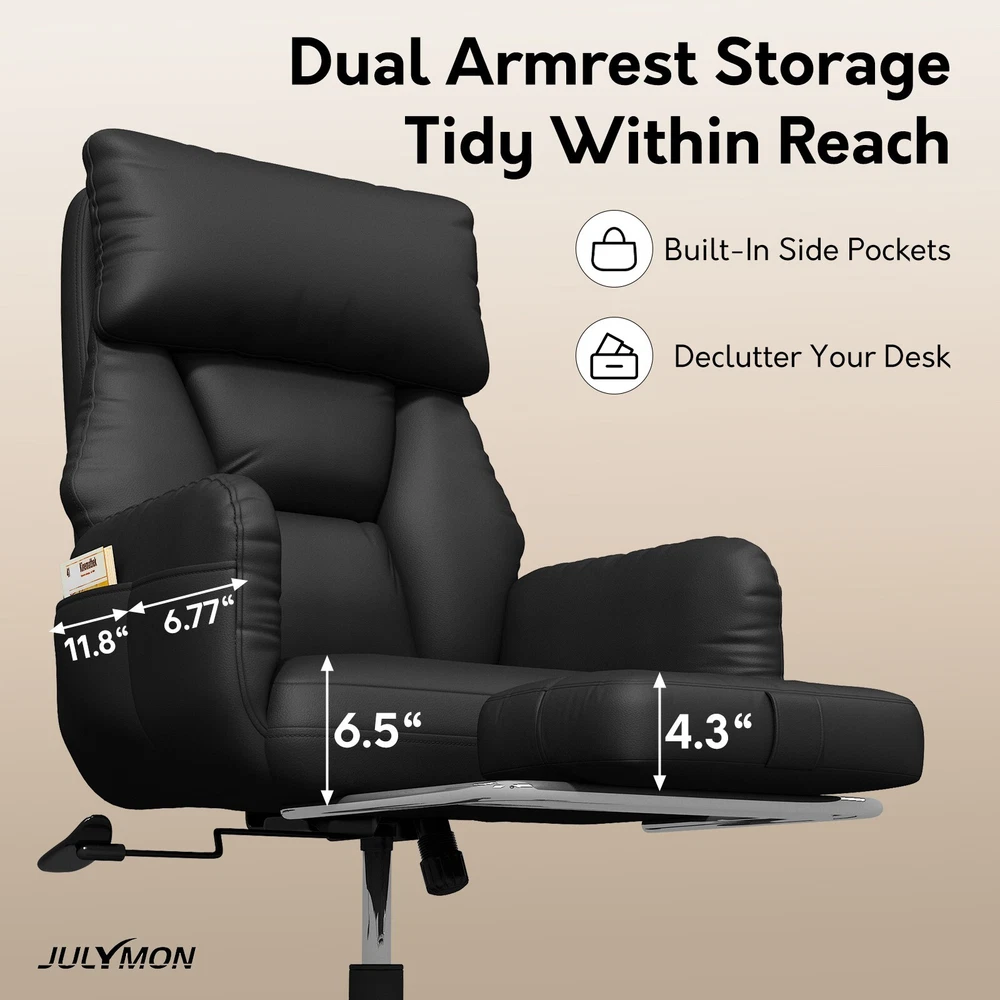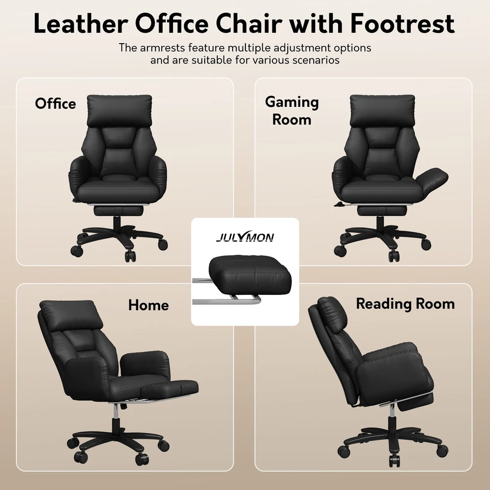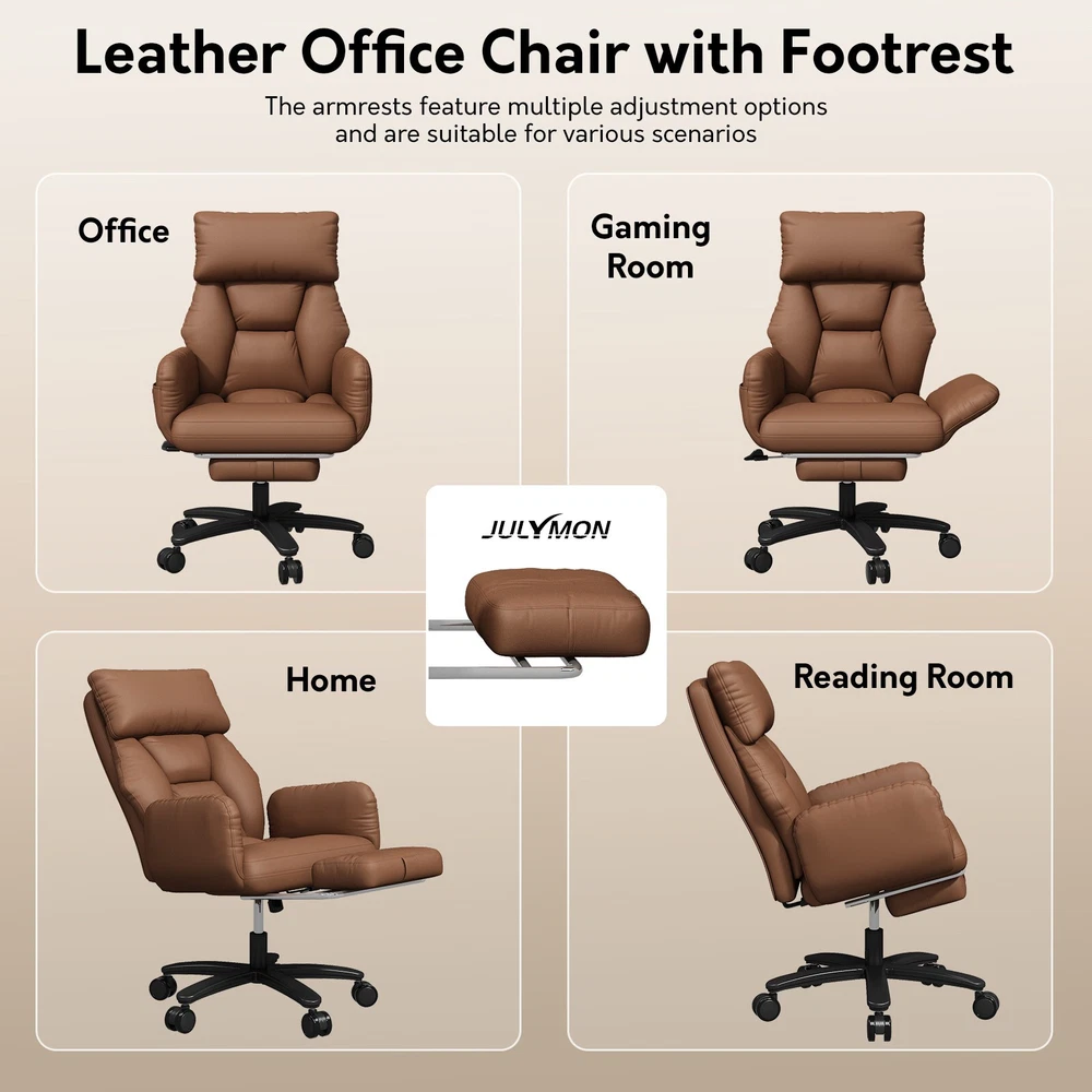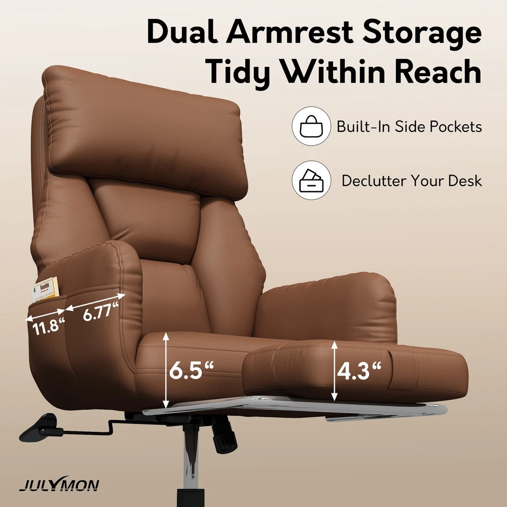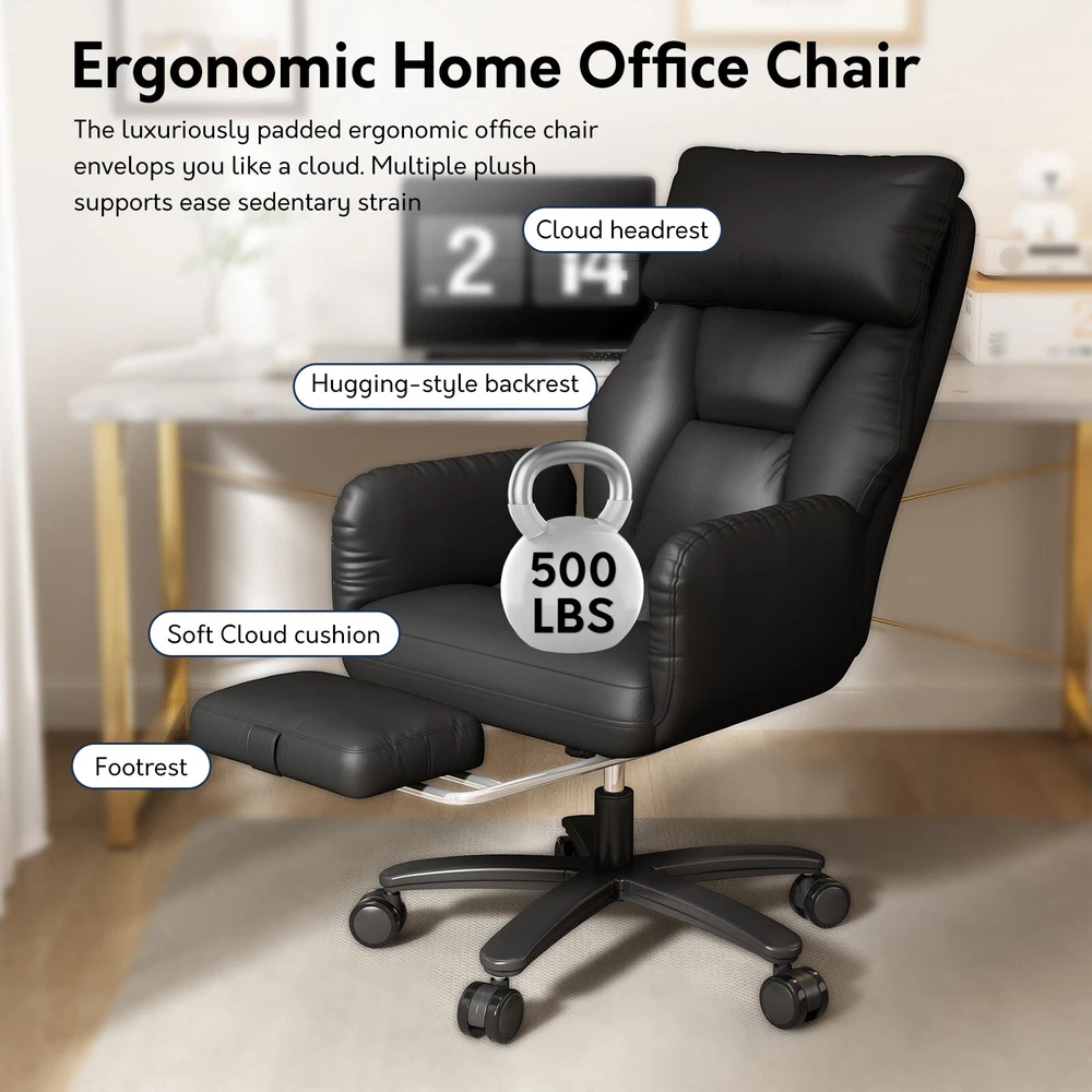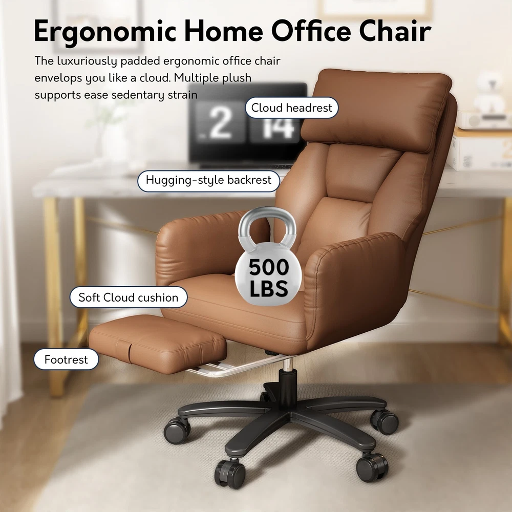 Type: Office Chair Model: Big and Tall Recliner Chair Color: Black / Brown Material: PU Leather + High-Density Foam Features: Reclining, Footrest, Lumbar Support, Adjustable Height, Swivel Maximum Weight Capacity: 500 lbs Item Width: 24.01 in Item Height: 43.89–47.04 in Seat Depth: 20 in Heavy-Duty 500LBS Support – Ideal for big and tall users with SGS gas lift. Foldable Side Wings – Sit cross-legged comfortably, unique wide seat design. 3-Stage Recline & Lock – Tilt from 90° to 120° for naps, work or relaxation. Full-Body Comfort – High backrest, neck pillow & lumbar support padding. Adjustable & Smooth Rolling – Height adjustable with 360° swivel casters. This ergonomic office chair is specially built for big and tall adults, supporting up to 500LBS. It features a wide, foldable seat design that lets you sit cross-legged, making long work hours or relaxation more comfortable. Perfect as a computer desk chair, it reclines to 120° and includes a footrest, lumbar support, and adjustable height — ideal for any home or office setup.