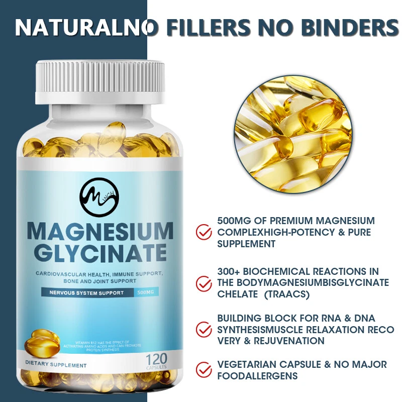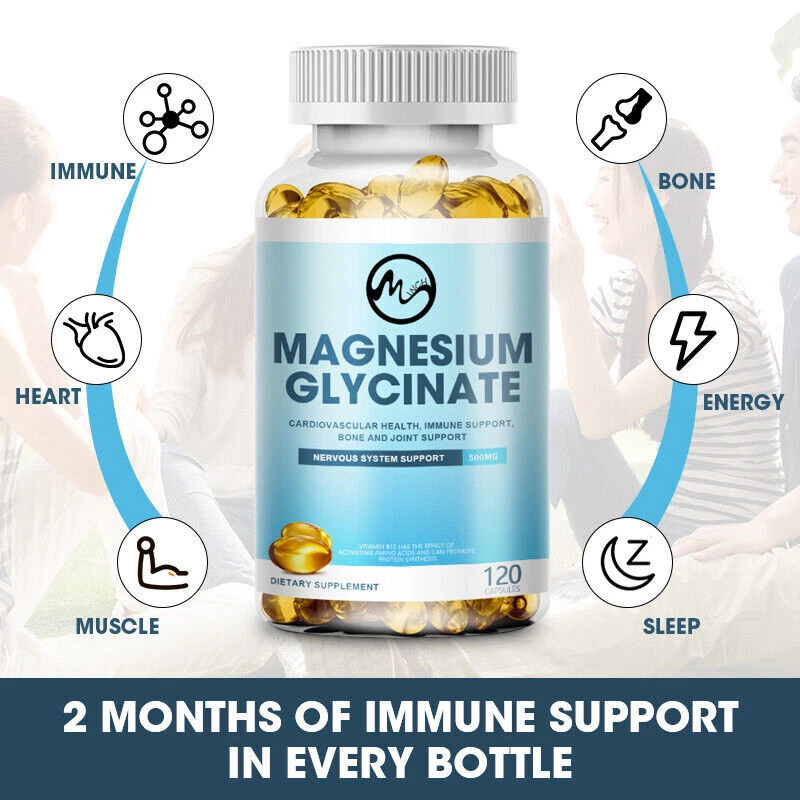 Descriptions: Brand: Minch Item Type: Magnesium Glycine Capsules Quantity: 120 Capsules Shelf Life: 2 years Immune system support - Magnesium capsules function as an important daily immune support mineral by activating healthy enzymes and regulating glycine amino acids for ideal immunity support for human. Magnesium for sleep - Pure magnesium glycinate capsules act as a natural sleep supplement for deep sleep support so you can rest well with a mood boost to fall asleep faster and wake up refreshed. Magnesium - A high absorption magnesium vitamin can be crucial for womens health by offering women better balance and cycle support for common symptoms such as constipation and headaches. Magnesium mineral supplements - Enhance your wellness with magnesium glycinate 500 mg for one of the most versatile minerals which may help improve the body’s natural process and support immunity. Magnesium glycine-- added with vitamin B6 and vitamin D to enhance magnesium absorption. How to use: Take 2pcs,after meal Package list: 1*120pcs Magnesium Glycine Capsules