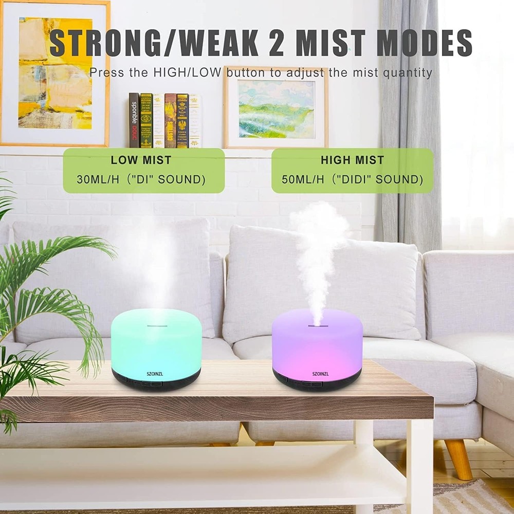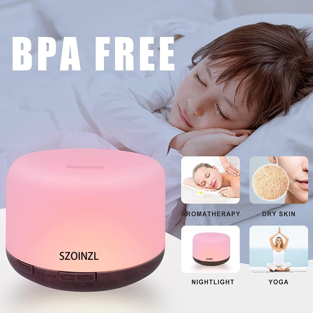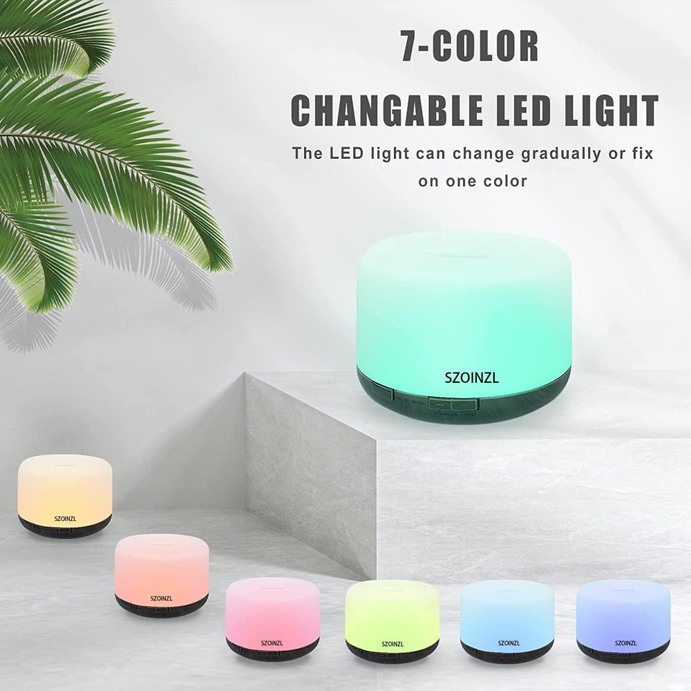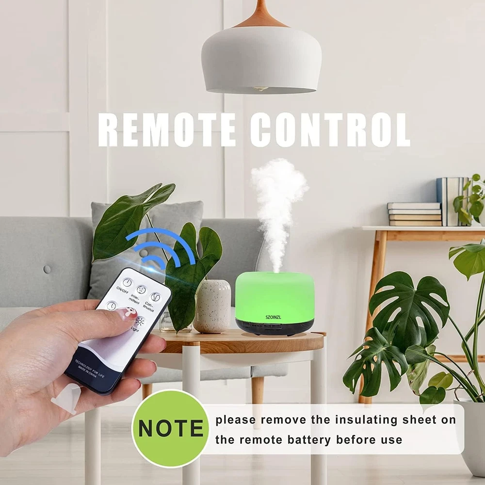 Specification: Power: AC100-240V 50/60HZ/DC 24V 650MA Cable length: 150cm Power consumption: 13W Timers: 60 m/120 m/180 m/ON Watertank: 500ML Light:7 colors Materials:PP Weight: 500g Package Includes: 1 x Diffuser 1 x Power Adapter 1 x Remote Control 1 x User Manual 【500ML & BPA Free】:the watertank is 500ml which can work for 8-10 hours . The essential oil diffuser was made of PP material. 【7-Color Lights】:Light can be set to 7 soft and relaxing colors.long press the LIGHT button for 2 seconds to turn off the light. 【4 Timers】:short press MIST button to choose between 60 min, 120 min, 180 min, ON and OFF, you can also use the remote control to control the essential oil diffuser. 【Auto Off 】:The essential oil diffuser automatically turns off when time runs out or when there is no water. 【Remote Control】:it is easy to control the essential oil diffuser via the remote control (please remove the insulation sheet on the remote battery before use).