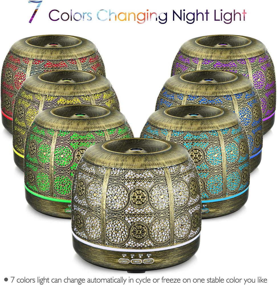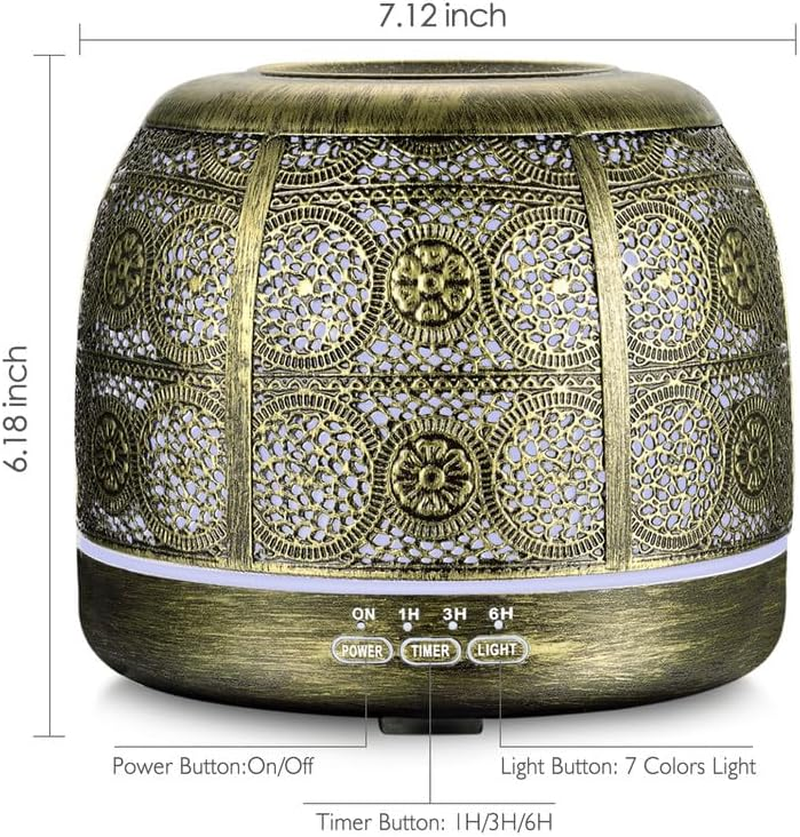 ARVIDSSON 500ml ultrasonic diffuser for essential oils provides a customized aromatherapy experience with an elegant Moroccan design that will elevate any home décor. With longer run times and various light modes, this diffuser will let you experience essential oils in a whole new way. Ultrasonic Cool Mist Technology: Experience the benefits of ultrasonic cool mist diffusion with our BPA-Free oil diffuser. It provides a safe and effective way to enjoy your favorite essential oils, ensuring a healthy environment for all family members, including pets and children. Timer Setting & Auto Shut-off: Our 500ml metal oil diffuser has the timer setting for 1 hours, 3 hours and 6 hours, that allows you to set how long your diffuser will run. The diffuser will turn off automatically when end to the timer or run out of water, so you can use it anytime. Customizable Ambiance with Multi-Color Lighting: Tailor your aromatherapy experience with a variety of LED light colors. Create the perfect atmosphere for relaxation, focus, or meditation, with the option to change the lighting to suit your mood. Low Noise Operation: The ultrasonic frequency generates waves at 2.4 million times per second with a lower noise operation, releasing essential oil molecules into the air to help create a relaxing, spa-like atmosphere in your home or office. Product description 500ML METAL AROMA DIFFUSER FOR ESSENTIAL OILS ARVIDSSON 500ml Ultrasonic Diffuser is a brand-new, custom-designed diffuser made to look like a classic decor art. The outer metal shell design features a romantic Moroccan pattern, which brings a sense of the exotic into your home or office. The video showcases the product in use. The video guides you through product setup. The video compares multiple products. The video shows the product being unpacked. 500ml Essential Oil DIffuser Merchant Video 100% METAL OUTER SHELL Made of iron metal outer shell and BPA free water tank, which is more uniqe and safe than other cheap plastic diffuser, its vintage aesthetics will decor your house perfectly. MULTIPLE TIMER MIST 500ml oil diffuser has different mist mode for 1hour, 3 hours and 6 hours, or you can set the continuous mist to run until the water runs out, and it will shut off automatically. LIGHT ON The light itself offers seven different color options, which can either cycle like a rainbow or be locked onto one color. The light itself isn’t particularly bright, so it could serve as an effective night light without disrupting sleep. LIGHT OFF You can turn off the lights and just use the unit as a diffuser. The light can be turned off independently if you just want diffuse at night, just hold the "light" button to long press 2-3 seconds, the light will turn off while diffusing. AROMATHERAPY & RELAXATION A combination of soothing lights, essential oils, and humidified air, providing you a soothing, spa-like experience. ARVIDSSON 500ml aromatherapy diffuser make your home smells like heaven. What cause diffuser defective and suddenly stopped working? Water might enter into the diffuser base and damaged the circuit board, always pour water with the correct direction to avoid water enters into the diffuser board. Why the diffuser does not taking out steam? The reason is adding too much water that exceed the MAX line of the water tank, that would cause no steam comes out, please keep water under the MAX line that ensures diffuser works properly. Why the mist is so weak or less mists come out? Add too much water and exceed the max line, the water level must under the max line, otherwise the mist can not come out. Why no mist comes out from the water tank? The diffuser was placed on an uneven surface, causing the fan port to be blocked. Please place the diffuser on a flat surface to ensure that the product works properly. Why the diffuser shuts off itself? The water runs out or up to the timer setting, the unit shuts off automatically to ensure safety.