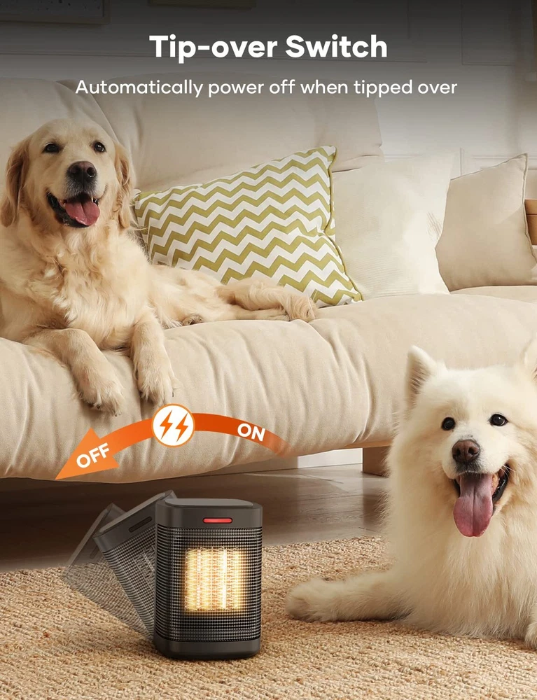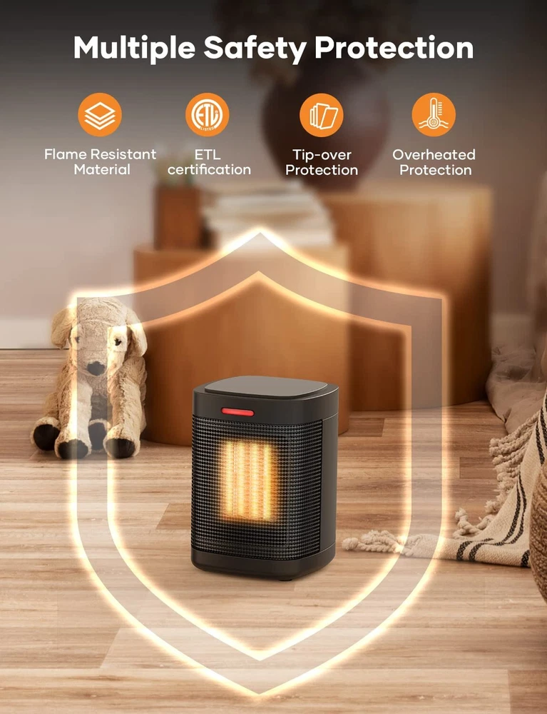 500W MINI HEATER: Reliable and sturdy, this heater provides continuous heat. It's best used for personal heating. It's small for localized close up, you can put this under, or on your desk. 500 watts of power to put out more heat with very low noise. Offering quiet operation and unique PTC ceramic heating elements. PORTABLE CONVENIENCE: Designed for ease of mobility, it fits almost anywhere. It features an impressively compact design and one-button operation. ON/OFF switch. Straight 500 watts. It's good for you if you are sitting in one spot, like snuggled up on a couch or chair watching a movie, or sitting at a desk in your office space. Getting your hands warm. CONVENIENT & SAFE FEATURES: Our space heaters have built-in safety overheating and tip-over protection, the heater will auto-turn off if accidentally tipped over or overheated. With its tip-over and auto shut-off overheating protection, you can sleep peacefully knowing you’ve got a heater with excellent safety features. The power indicator light lets you know when it's plugged in. SAFE AND HASSLE-FREE: Perfectly safe around children and pets, with no exposed heating elements that could cause a fire. ETL certification ensures the highest safety standards - tip-over and overheats shut-off protection. The heating device provides users with a safer and more comfortable operating experience. DEFEAT COLD IN 2S: Nothing beats a great basic, this sleek black heater is essential in any home, heating up quickly in just 2 seconds. Discover the ceramic desk heaters that can be placed on the floor or desktop. Makes a great addition to an office, bedroom, or any other enclosed area.