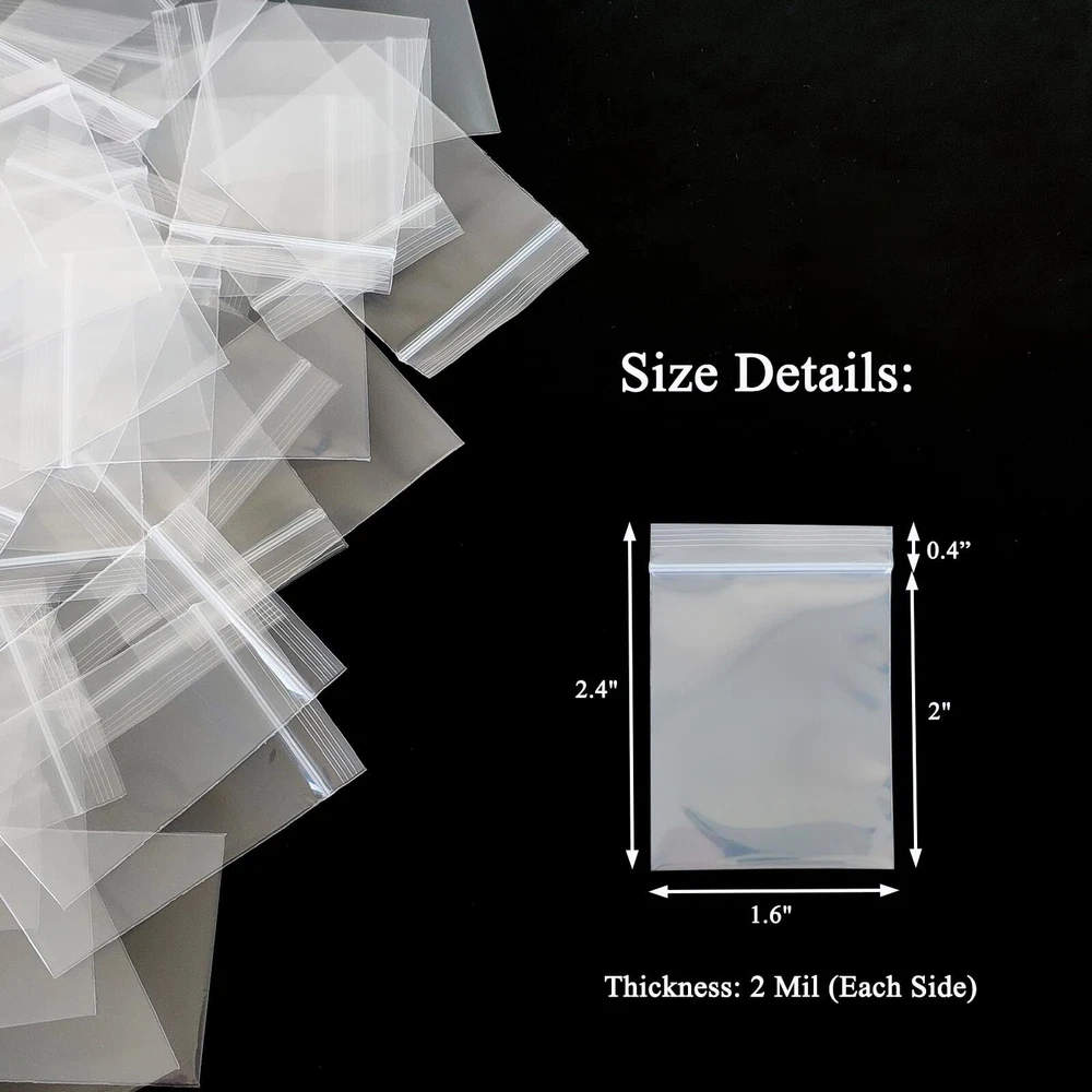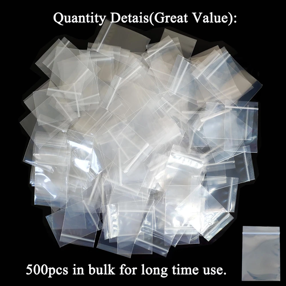 Great Value Pack: You will get 500pcs 1" x 2" small plastic bags to cover your tons of needs & daily uses. Each side is 2 Mil in thickness. Very durable to store different tiny items. Premium Material: Our clear small poly bags are made of virgin low density polyethylene to make mini bags more Clear, Durable, Odorless and Non-toxic to provide a good protection and make a nice presentation for your little pieces. You can see everything through in it at anytime. Reusable Zipper Design: These mini zip bags for packaging are very easy to open and close many times with biting sealing zipper. It has strong sealing to keep your products clean, airtight, waterproof and dust-proof. Great for display, storage and shipping. Easy to Storage: The 500pcs mini plastic bags are just perfect for you to sort all your small hobbies and organize jewelry parts, pills, vitamins, seeds, buttons, beads, toy pieces, screws, bolts and so on. Our resealable clear small plastic bags with zipper are super thick and heavy-duty; ideal for small business and industrial packaging, food service.