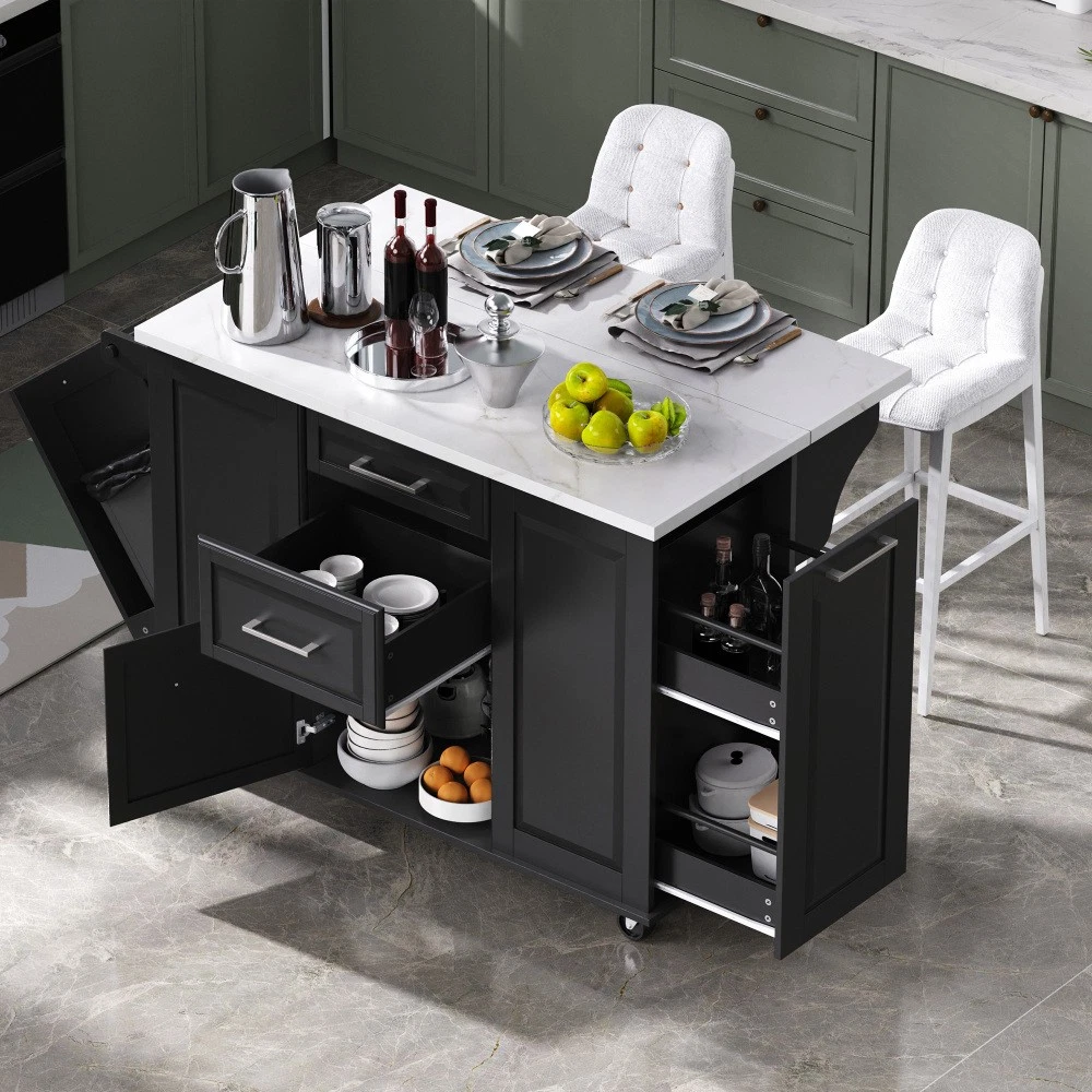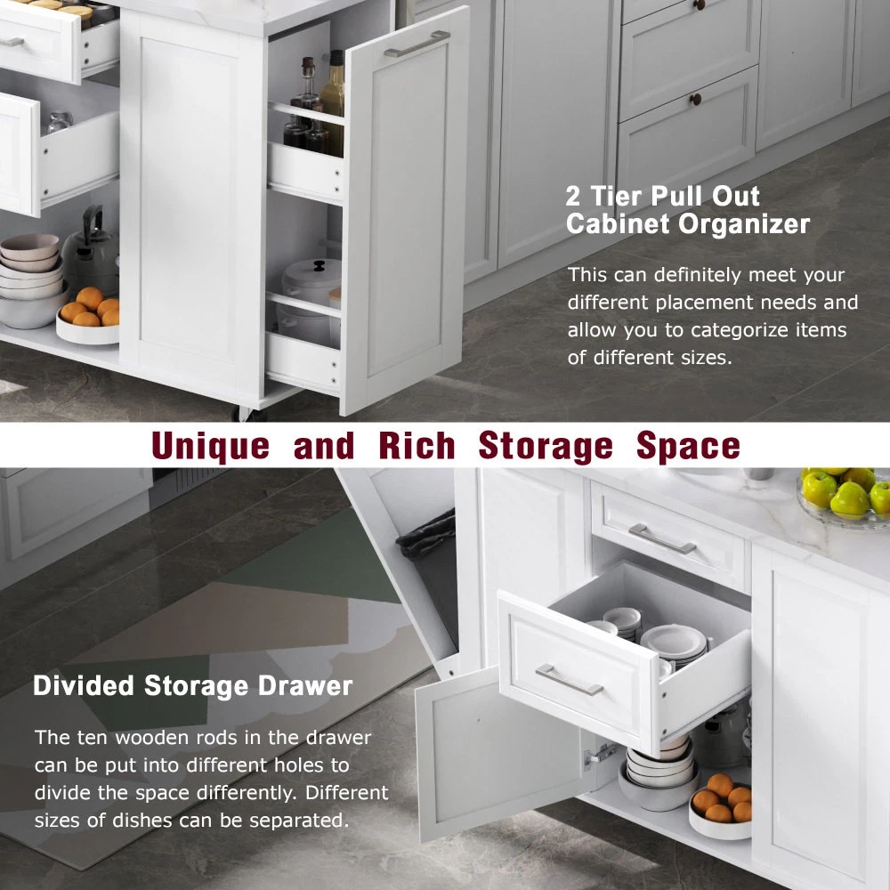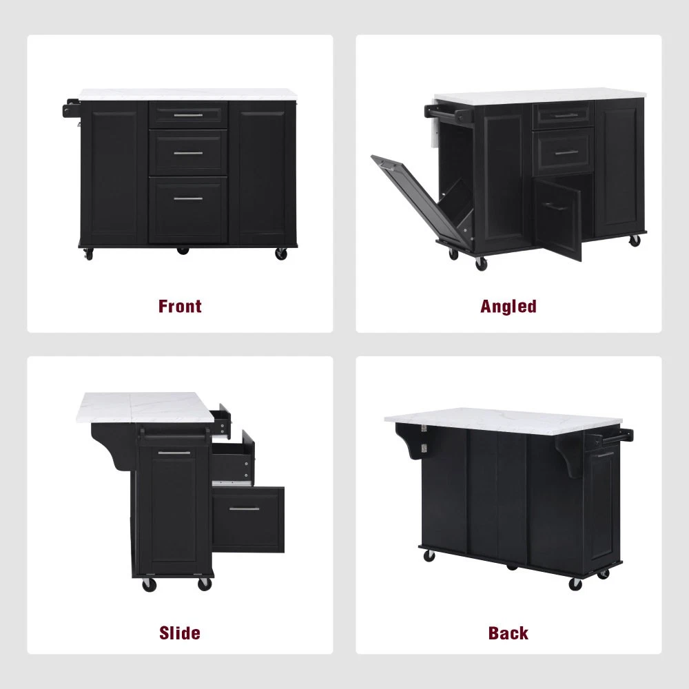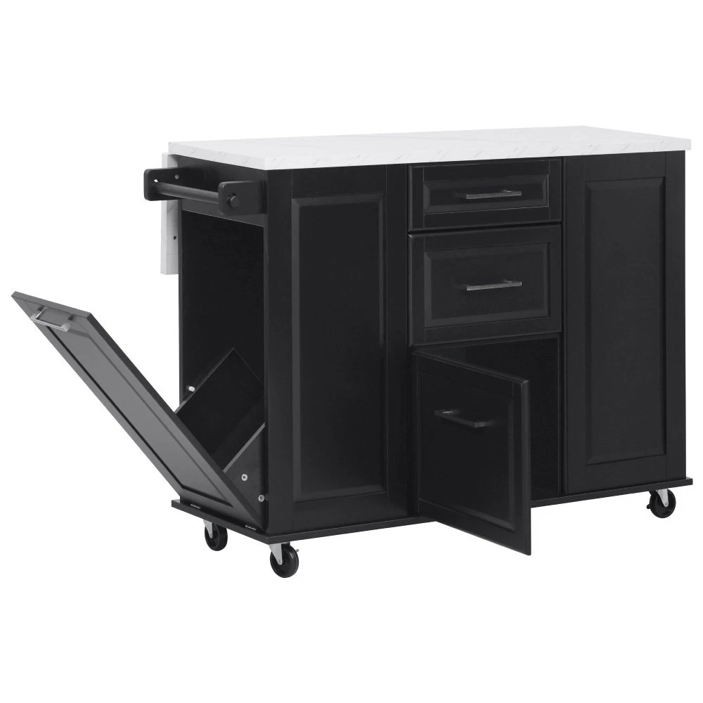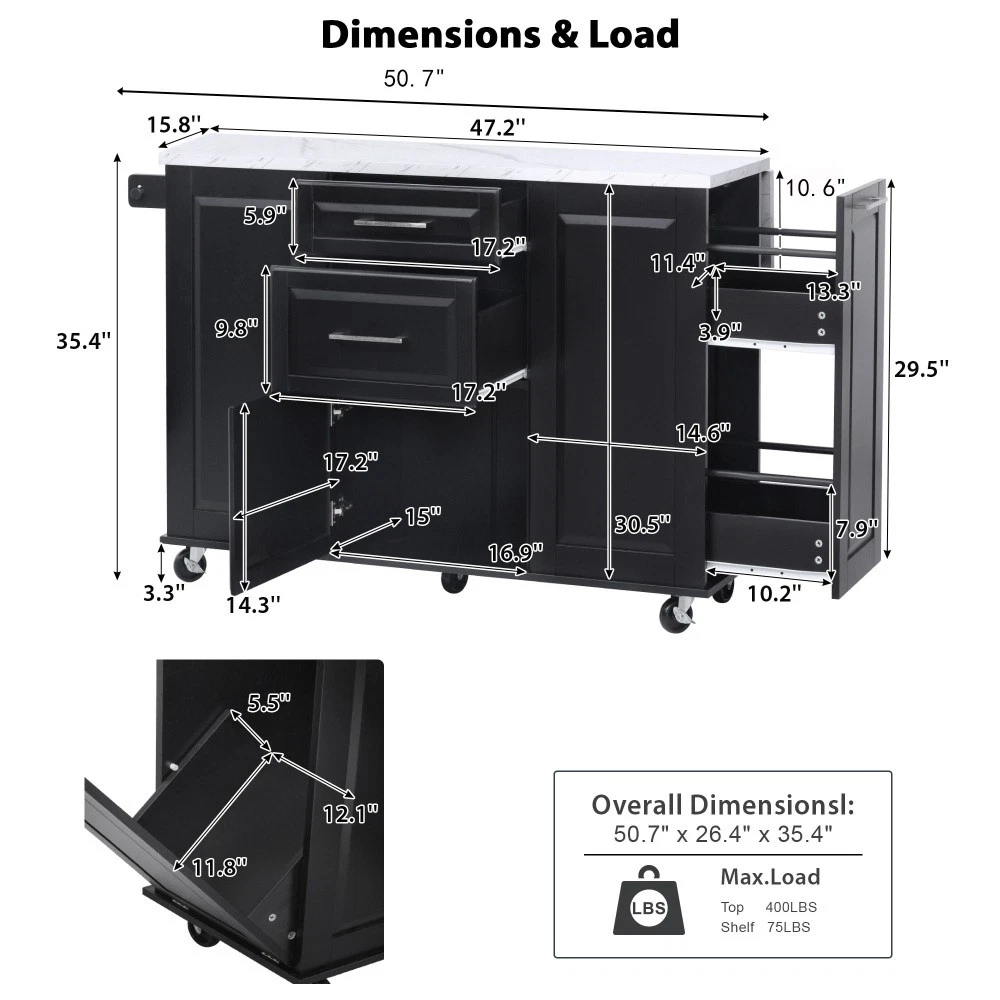 50.7" Kitchen Island with Storage Tilt Trash Can Cabinet and Pull Out Cabinet Features [Vintage Meets Fashion] Embrace the timeless appeal of traditional vintage design while incorporating modern fashion trends. Convex door and drawer panel design with white faux marble veined wood tabletop. It is sure to impress you in terms of aesthetics. [Concealed Tilt Trash Can Cabinet] Say farewell to unsightly garbage cans! The garbage bin storage cabinet is a fantastic addition to your kitchen island. It can accommodate a 9-gallon trash can (not included), effectively concealing the trash and keeping the kitchen looking tidy while also preventing pets from knocking over the bins. Additionally, it helps to block any unpleasant odors from escaping. [2 Tier Pull Out Cabinet Organizer] Our kitchen island comes with a convenient 2-tier pull-out cabinet organizer. Each tier of storage measures 11.4" x 13.3" x 3.9". The maximum pull-out length can be up to 10.2 inches. This can definitely meet your different placement needs and allow you to categorize items of different sizes. [Ample Storage Space] Measuring 50.7"W x 26.4"D x 35.4"H. In addition to the trash cabinet and double-tier storage shelves, this product is paired with 2 drawers and 1 storage cabinet for organizing dishes, cups and other items. The divider bars in the center drawer provide the flexibility to hold and separate kitchen items of different sizes. [Convenient Drop Leaf Design] The counter of this kitchen island is equipped with a foldable drop leaf. When you run out of scope, you can open it to get more operating space, so you can put more things on the counter and increase storage space. Of course, you can fold it when you don't need to use it, and leaning against a wall or corner is a good storage option. [Mobile Kitchen Island] Our mobile kitchen island on wheels has five movable universal wheels, four at the bottom four corners and one in the middle. In this way, you can move freely and ensure the stability of the movement. Two of the wheels are lockable so you can stop and secure them at any time. Greatly enhance your convenience when using indoors. [Sturdy and Secure] Our kitchen cart is built with CARB Phase II certified MDF. It has a robust structure and a 0.95” thick tabletop that can bear up to 400 lbs. We place a high value on your well-being and health. That's why we offer a durable, smooth, and scratch-resistant laminate finish tabletop. This tabletop can serve as both a cutting board and a stand for your microwave or roaster. The well-designed structure is made to endure the rigors of long-term use. [Buy with Confidence] This kitchen island with storage is accompanied by comprehensive step-by-step assembly instructions and labeled parts and hardware to ensure a seamless assembly process. Should you encounter any challenges during the assembly of this kitchen cart, please do not hesitate to reach out to us for assistance. Notice: 1.Real Product’s Color may be a little different from the image due to the lighting or monitor’s display. 2.Manual measurement has been used, there may be some reasonable error. Description Vintage Convex Door & Panel Design The vintage retro convex design never goes out of style. The smooth surface of the product harmoniously blends vintage elements, injecting personality and charm into your kitchen. Faux Marble Textured Wood Deskop Balancing sturdiness with beauty, it combines a marble-veined finish with a smooth wood tabletop. Maintaining the overall vintage flavor while incorporating a strong contemporary feel. Concealed Tilt Trash Can Cabinet Say farewell to unsightly garbage cans! The garbage bin storage cabinet is a fantastic addition to your kitchen island. It can accommodate a 9-gallon trash can (not included), effectively concealing the trash and keeping the kitchen looking tidy. 2 Tier Pull Out Cabinet Organizer Our kitchen island comes with a convenient 2-tier pull-out cabinet organizer. Each tier of storage measures 11.4" x 13.3" x 3.9". The maximum pull-out length can be up to 10.2 inches. This can definitely meet your different placement needs and allow you to categorize items of different sizes. SturdyTowel Rack The product has a solid towel rack on the side. It's perfect for holding your wet towels that you have nowhere else to put them. Of course it can also be used as a mobile pusher. So you won't be stuck pushing the island. Compartmentalized Storage Drawer Design The divider bars in the center drawer provide the flexibility to hold and separate kitchen items of different sizes. Large Drop Leaf Design A folding rolling kitchen island countertop can offer additional workspace and storage when needed, and can be effortlessly folded up to create more space. Soft Close Hinges The soft closing function is one of the best indicators of the quality of the hinges. The soft closing feature prevents all disturbing noises from the kitchen and extends the lifetime of the doors, cabinets, and hinges. Highlights&Summary Highlights [Tilt Trash Can Cabinet for 9 Gallon Trash Can] [Pull-Out Cabinet Organizer][2 Drawers and 1 Door] [Vintage Convex Door & Panel Design][Metal Handles & Metal Hinges] [Faux Marble Textured Wood Deskop][Drop Leaf Design] [Compartmentalized Storage Drawer Design] [Ample Storage Space][Towel Rack] [5* 360 Rotation Wheels with 2 Lockable Casters] [Eco-friendly manufactured P2 MDF Board] Summary The design of this kitchen island is sure to bring a different work experience to your kitchen area, skillfully combining practicality with style. The product is very sturdy, it's made of safe CARB phrase Ⅱ certified MDF boards. Equipped with a tilt trash can for a 9-gallon bin on its left side (trash can not included), and a double tier pull-out cabinet organizer on its right side. The top drawer holds utensils. The center drawer holds a variety of dishes and cups, and multiple divider bars inside allow you to separate different items. And of course there is a separate 