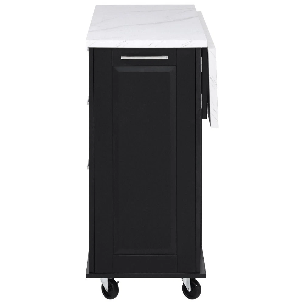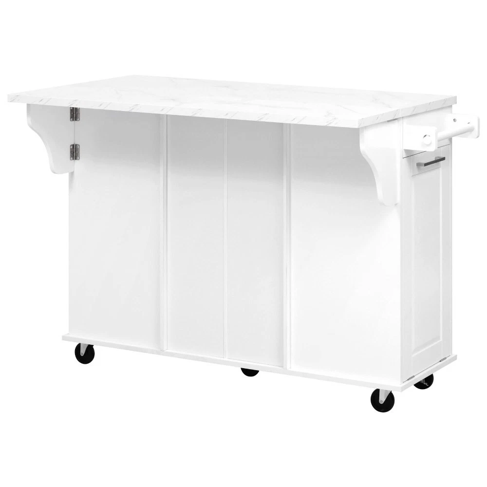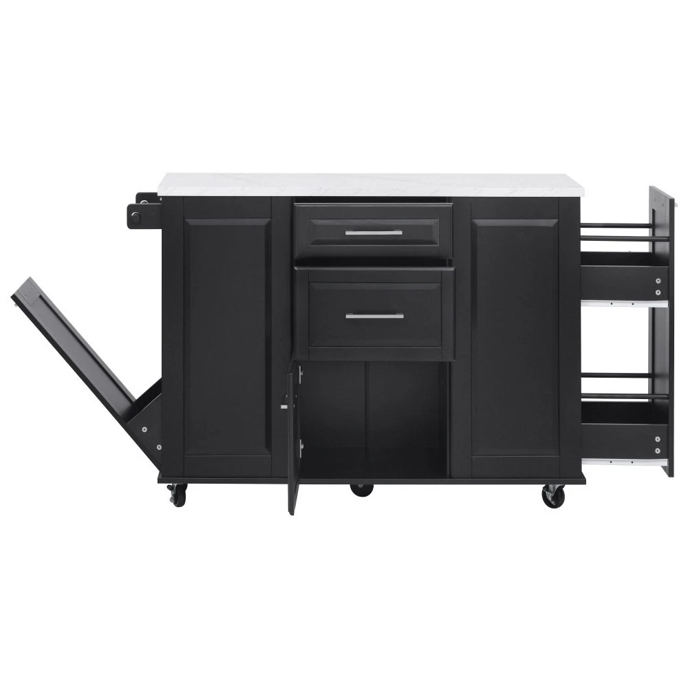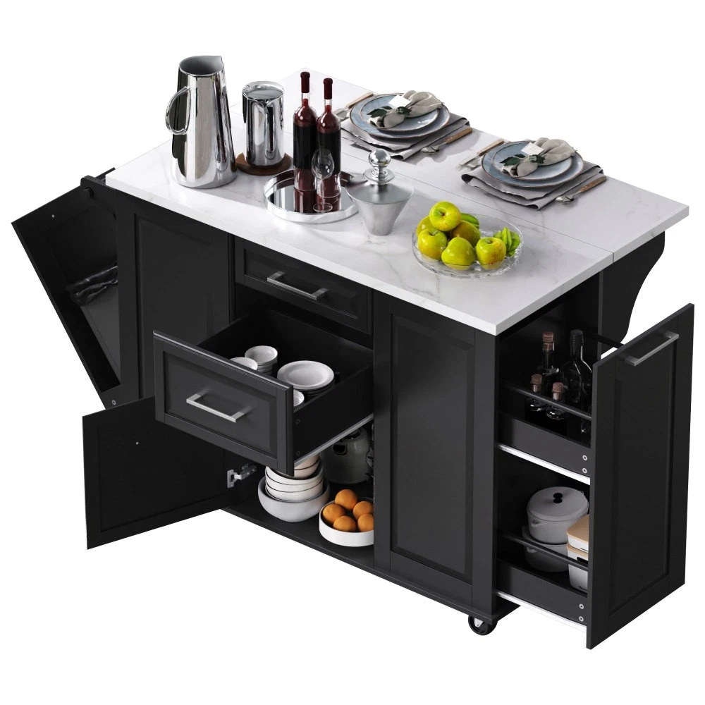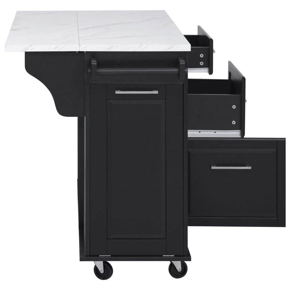50.7" Kitchen Island with Storage Tilt Trash Can Cabinet and Pull Out Cabinet Features [Vintage Meets Fashion] Embrace the timeless appeal of traditional vintage design while incorporating modern fashion trends. Convex door and drawer panel design with white faux marble veined wood tabletop. It is sure to impress you in terms of aesthetics. [Concealed Tilt Trash Can Cabinet] Say farewell to unsightly garbage cans! The garbage bin storage cabinet is a fantastic addition to your kitchen island. It can accommodate a 9-gallon trash can (not included), effectively concealing the trash and keeping the kitchen looking tidy while also preventing pets from knocking over the bins. Additionally, it helps to block any unpleasant odors from escaping. [2 Tier Pull Out Cabinet Organizer] Our kitchen island comes with a convenient 2-tier pull-out cabinet organizer. Each tier of storage measures 11.4" x 13.3" x 3.9". The maximum pull-out length can be up to 10.2 inches. This can definitely meet your different placement needs and allow you to categorize items of different sizes. [Ample Storage Space] Measuring 50.7"W x 26.4"D x 35.4"H. In addition to the trash cabinet and double-tier storage shelves, this product is paired with 2 drawers and 1 storage cabinet for organizing dishes, cups and other items. The divider bars in the center drawer provide the flexibility to hold and separate kitchen items of different sizes. [Convenient Drop Leaf Design] The counter of this kitchen island is equipped with a foldable drop leaf. When you run out of scope, you can open it to get more operating space, so you can put more things on the counter and increase storage space. Of course, you can fold it when you don't need to use it, and leaning against a wall or corner is a good storage option. [Mobile Kitchen Island] Our mobile kitchen island on wheels has five movable universal wheels, four at the bottom four corners and one in the middle. In this way, you can move freely and ensure the stability of the movement. Two of the wheels are lockable so you can stop and secure them at any time. Greatly enhance your convenience when using indoors. [Sturdy and Secure] Our kitchen cart is built with CARB Phase II certified MDF. It has a robust structure and a 0.95” thick tabletop that can bear up to 400 lbs. We place a high value on your well-being and health. That's why we offer a durable, smooth, and scratch-resistant laminate finish tabletop. This tabletop can serve as both a cutting board and a stand for your microwave or roaster. The well-designed structure is made to endure the rigors of long-term use. [Buy with Confidence] This kitchen island with storage is accompanied by comprehensive step-by-step assembly instructions and labeled parts and hardware to ensure a seamless assembly process. Should you encounter any challenges during the assembly of this kitchen cart, please do not hesitate to reach out to us for assistance. Notice: 1.Real Product’s Color may be a little different from the image due to the lighting or monitor’s display. 2.Manual measurement has been used, there may be some reasonable error. Description Vintage Convex Door & Panel Design The vintage retro convex design never goes out of style. The smooth surface of the product harmoniously blends vintage elements, injecting personality and charm into your kitchen. Faux Marble Textured Wood Deskop Balancing sturdiness with beauty, it combines a marble-veined finish with a smooth wood tabletop. Maintaining the overall vintage flavor while incorporating a strong contemporary feel. Concealed Tilt Trash Can Cabinet Say farewell to unsightly garbage cans! The garbage bin storage cabinet is a fantastic addition to your kitchen island. It can accommodate a 9-gallon trash can (not included), effectively concealing the trash and keeping the kitchen looking tidy. 2 Tier Pull Out Cabinet Organizer Our kitchen island comes with a convenient 2-tier pull-out cabinet organizer. Each tier of storage measures 11.4" x 13.3" x 3.9". The maximum pull-out length can be up to 10.2 inches. This can definitely meet your different placement needs and allow you to categorize items of different sizes. SturdyTowel Rack The product has a solid towel rack on the side. It's perfect for holding your wet towels that you have nowhere else to put them. Of course it can also be used as a mobile pusher. So you won't be stuck pushing the island. Compartmentalized Storage Drawer Design The divider bars in the center drawer provide the flexibility to hold and separate kitchen items of different sizes. Large Drop Leaf Design A folding rolling kitchen island countertop can offer additional workspace and storage when needed, and can be effortlessly folded up to create more space. Soft Close Hinges The soft closing function is one of the best indicators of the quality of the hinges. The soft closing feature prevents all disturbing noises from the kitchen and extends the lifetime of the doors, cabinets, and hinges. Highlights&Summary Highlights [Tilt Trash Can Cabinet for 9 Gallon Trash Can] [Pull-Out Cabinet Organizer][2 Drawers and 1 Door] [Vintage Convex Door & Panel Design][Metal Handles & Metal Hinges] [Faux Marble Textured Wood Deskop][Drop Leaf Design] [Compartmentalized Storage Drawer Design] [Ample Storage Space][Towel Rack] [5* 360 Rotation Wheels with 2 Lockable Casters] [Eco-friendly manufactured P2 MDF Board] Summary The design of this kitchen island is sure to bring a different work experience to your kitchen area, skillfully combining practicality with style. The product is very sturdy, it's made of safe CARB phrase Ⅱ certified MDF boards. Equipped with a tilt trash can for a 9-gallon bin on its left side (trash can not included), and a double tier pull-out cabinet organizer on its right side. The top drawer holds utensils. The center drawer holds a variety of dishes and cups, and multiple divider bars inside allow you to separate different items. And of course there is a separate 