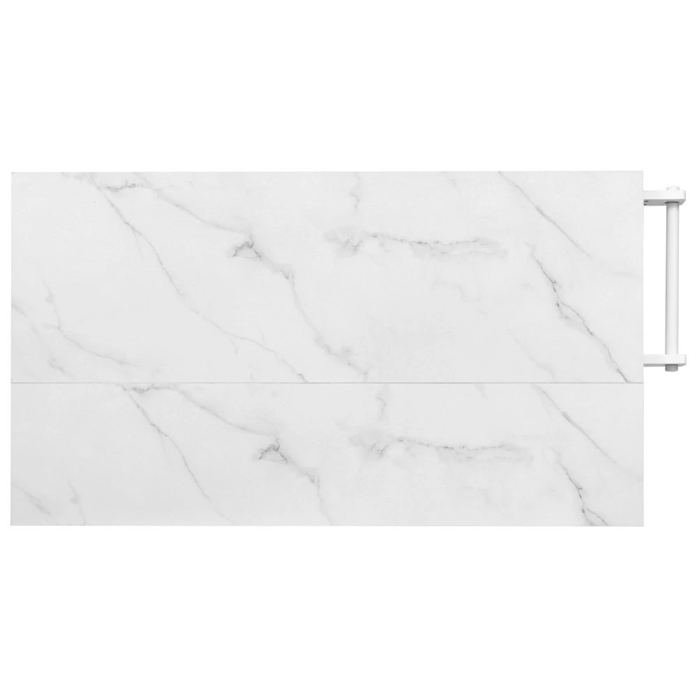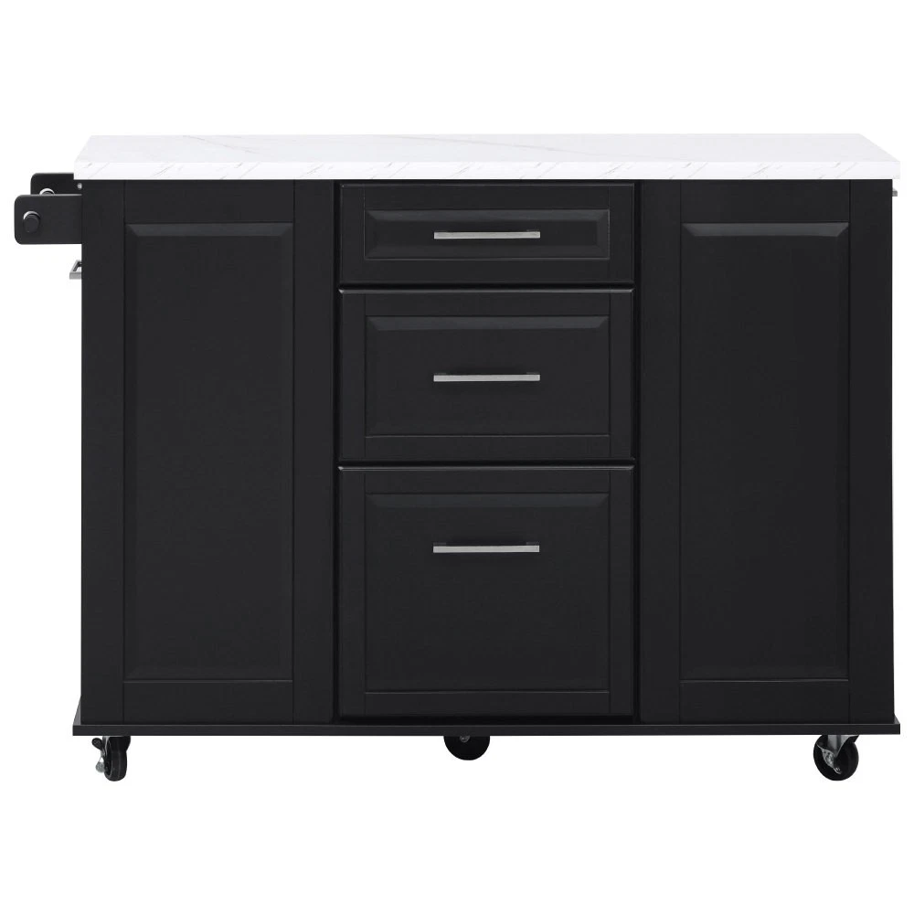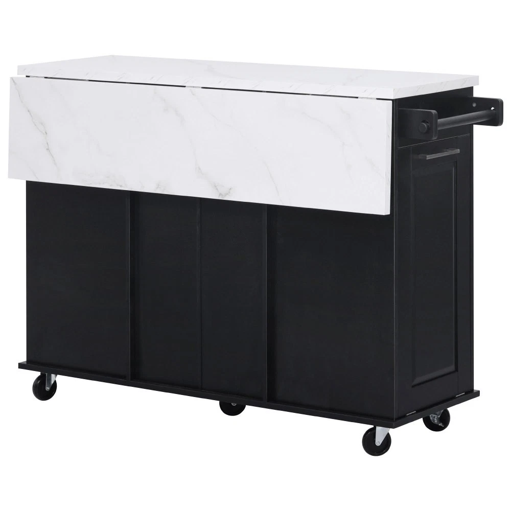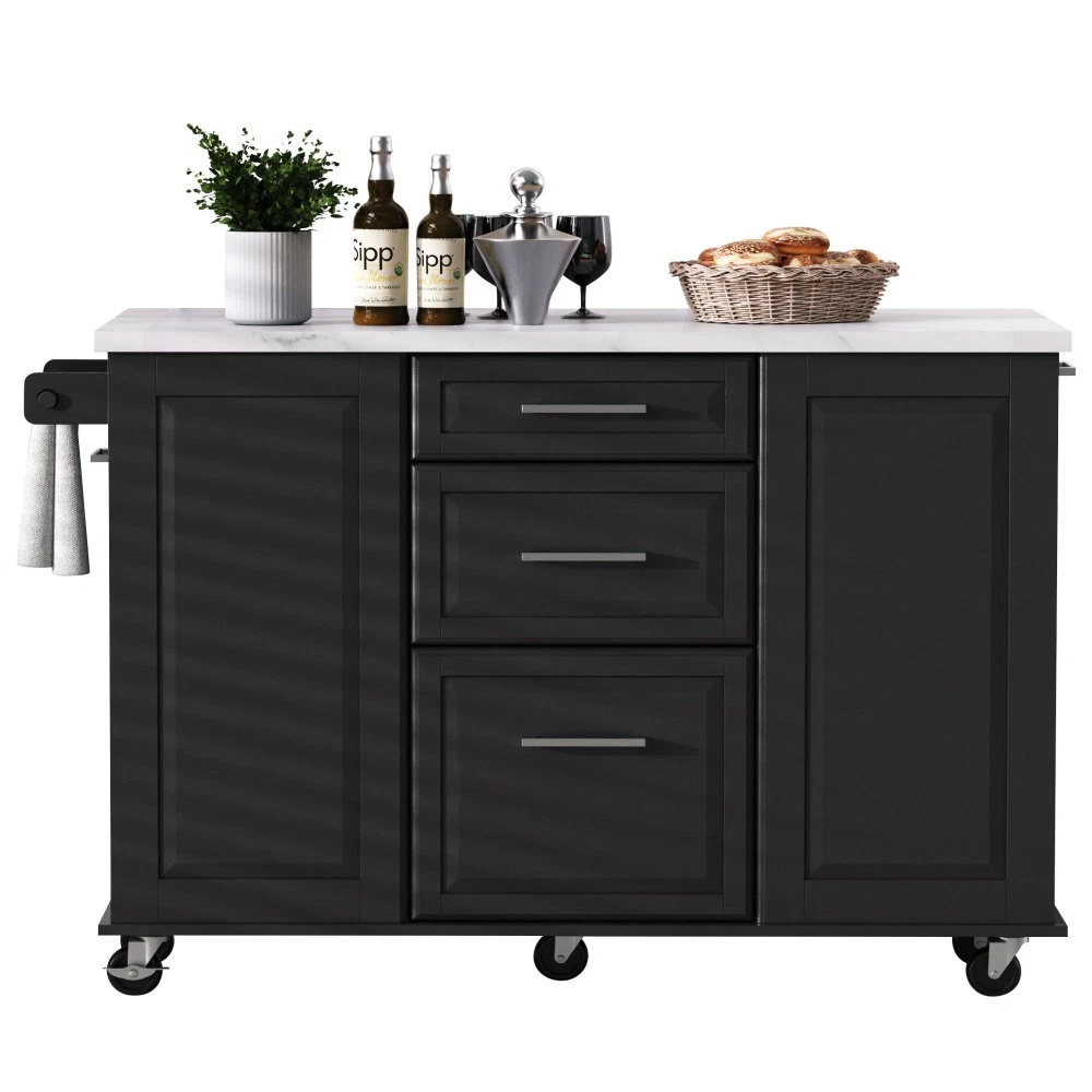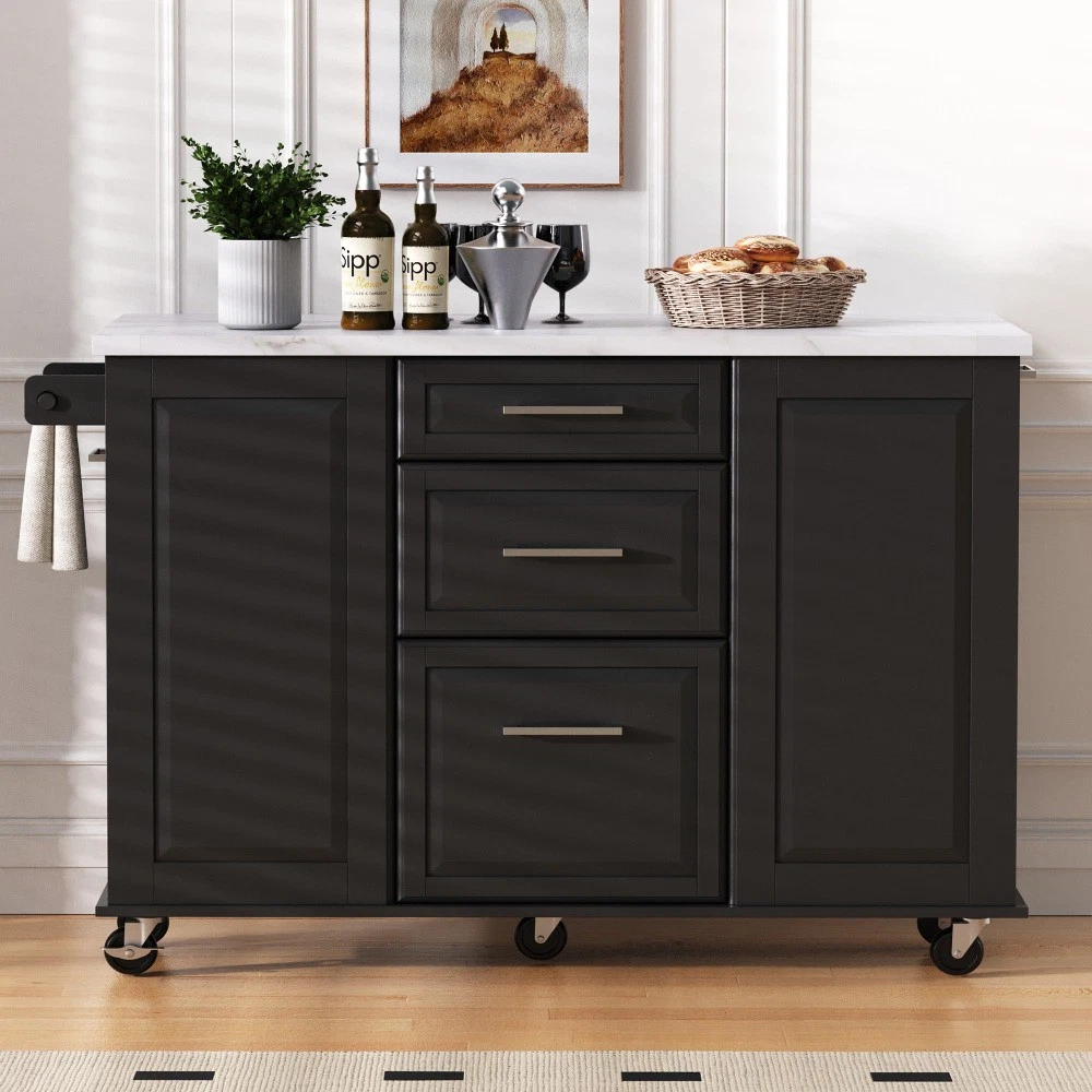 50.7" Kitchen Island with Storage Tilt Trash Can Cabinet and Pull Out Cabinet Features [Vintage Meets Fashion] Embrace the timeless appeal of traditional vintage design while incorporating modern fashion trends. Convex door and drawer panel design with white faux marble veined wood tabletop. It is sure to impress you in terms of aesthetics. [Concealed Tilt Trash Can Cabinet] Say farewell to unsightly garbage cans! The garbage bin storage cabinet is a fantastic addition to your kitchen island. It can accommodate a 9-gallon trash can (not included), effectively concealing the trash and keeping the kitchen looking tidy while also preventing pets from knocking over the bins. Additionally, it helps to block any unpleasant odors from escaping. [2 Tier Pull Out Cabinet Organizer] Our kitchen island comes with a convenient 2-tier pull-out cabinet organizer. Each tier of storage measures 11.4" x 13.3" x 3.9". The maximum pull-out length can be up to 10.2 inches. This can definitely meet your different placement needs and allow you to categorize items of different sizes. [Ample Storage Space] Measuring 50.7"W x 26.4"D x 35.4"H. In addition to the trash cabinet and double-tier storage shelves, this product is paired with 2 drawers and 1 storage cabinet for organizing dishes, cups and other items. The divider bars in the center drawer provide the flexibility to hold and separate kitchen items of different sizes. [Convenient Drop Leaf Design] The counter of this kitchen island is equipped with a foldable drop leaf. When you run out of scope, you can open it to get more operating space, so you can put more things on the counter and increase storage space. Of course, you can fold it when you don't need to use it, and leaning against a wall or corner is a good storage option. [Mobile Kitchen Island] Our mobile kitchen island on wheels has five movable universal wheels, four at the bottom four corners and one in the middle. In this way, you can move freely and ensure the stability of the movement. Two of the wheels are lockable so you can stop and secure them at any time. Greatly enhance your convenience when using indoors. [Sturdy and Secure] Our kitchen cart is built with CARB Phase II certified MDF. It has a robust structure and a 0.95” thick tabletop that can bear up to 400 lbs. We place a high value on your well-being and health. That's why we offer a durable, smooth, and scratch-resistant laminate finish tabletop. This tabletop can serve as both a cutting board and a stand for your microwave or roaster. The well-designed structure is made to endure the rigors of long-term use. [Buy with Confidence] This kitchen island with storage is accompanied by comprehensive step-by-step assembly instructions and labeled parts and hardware to ensure a seamless assembly process. Should you encounter any challenges during the assembly of this kitchen cart, please do not hesitate to reach out to us for assistance. Notice: 1.Real Product’s Color may be a little different from the image due to the lighting or monitor’s display. 2.Manual measurement has been used, there may be some reasonable error. Description Vintage Convex Door & Panel Design The vintage retro convex design never goes out of style. The smooth surface of the product harmoniously blends vintage elements, injecting personality and charm into your kitchen. Faux Marble Textured Wood Deskop Balancing sturdiness with beauty, it combines a marble-veined finish with a smooth wood tabletop. Maintaining the overall vintage flavor while incorporating a strong contemporary feel. Concealed Tilt Trash Can Cabinet Say farewell to unsightly garbage cans! The garbage bin storage cabinet is a fantastic addition to your kitchen island. It can accommodate a 9-gallon trash can (not included), effectively concealing the trash and keeping the kitchen looking tidy. 2 Tier Pull Out Cabinet Organizer Our kitchen island comes with a convenient 2-tier pull-out cabinet organizer. Each tier of storage measures 11.4" x 13.3" x 3.9". The maximum pull-out length can be up to 10.2 inches. This can definitely meet your different placement needs and allow you to categorize items of different sizes. SturdyTowel Rack The product has a solid towel rack on the side. It's perfect for holding your wet towels that you have nowhere else to put them. Of course it can also be used as a mobile pusher. So you won't be stuck pushing the island. Compartmentalized Storage Drawer Design The divider bars in the center drawer provide the flexibility to hold and separate kitchen items of different sizes. Large Drop Leaf Design A folding rolling kitchen island countertop can offer additional workspace and storage when needed, and can be effortlessly folded up to create more space. Soft Close Hinges The soft closing function is one of the best indicators of the quality of the hinges. The soft closing feature prevents all disturbing noises from the kitchen and extends the lifetime of the doors, cabinets, and hinges. Highlights&Summary Highlights [Tilt Trash Can Cabinet for 9 Gallon Trash Can] [Pull-Out Cabinet Organizer][2 Drawers and 1 Door] [Vintage Convex Door & Panel Design][Metal Handles & Metal Hinges] [Faux Marble Textured Wood Deskop][Drop Leaf Design] [Compartmentalized Storage Drawer Design] [Ample Storage Space][Towel Rack] [5* 360 Rotation Wheels with 2 Lockable Casters] [Eco-friendly manufactured P2 MDF Board] Summary The design of this kitchen island is sure to bring a different work experience to your kitchen area, skillfully combining practicality with style. The product is very sturdy, it's made of safe CARB phrase Ⅱ certified MDF boards. Equipped with a tilt trash can for a 9-gallon bin on its left side (trash can not included), and a double tier pull-out cabinet organizer on its right side. The top drawer holds utensils. The center drawer holds a variety of dishes and cups, and multiple divider bars inside allow you to separate different items. And of course there is a separate 