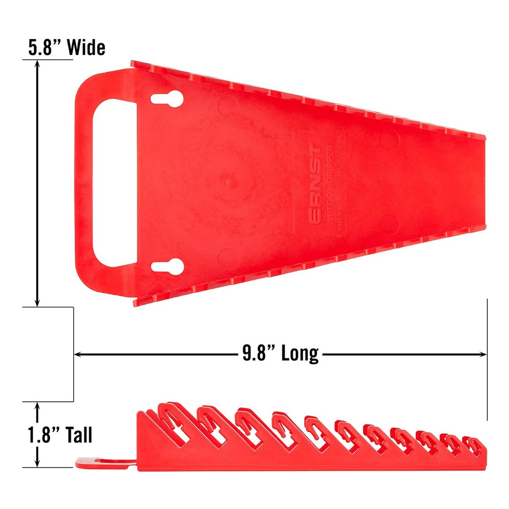 Product Description The Ernst 11-tool Gripper Wrench Organizer helps you organize your wrenches and securely transport wrenches to the job site. This superior organizer provides the ultimate in tool box storage. It holds 1/4-inch to 7/8-inch and 6 mm to 16 mm wrenches and allows for immediate recognition of a missing wrench. While holding wrenches secure for transportation, it also allows for easy -handed engagement and removal of wrenches. The Ernst Wrench Gripper series offers versatility, as you can hang the product on walls, pegboard, even the side of your mobile tool cart using the Vertical Cart Mount Kit. It also features a folding space saver handle. The soft, non-marring material is fuel and solvent resistant. Made in the USA. Tools not included. From the Manufacturer The Ernst 11-tool Gripper Wrench Organizer helps you organize your wrenches and securely transport wrenches to the job site. This superior organizer provides the ultimate in tool box storage. It holds 1/4-Inch to 7/8-Inch and 6 mm to 16 mm wrenches and allows for immediate recognition of a missing wrench. While holding wrenches secure for transportation, it also allows for easy -handed engagement and removal of wrenches. The Ernst Wrench Gripper series offers versatility, as you can hang the product on walls, pegboard, even the side of your mobile tool cart using the Vertical Cart Mount Kit. It also features a folding space saver handle. The soft, non-marring material is fuel and solvent resistant. Made in the USA. . Tools not included. 11-wrench portable organizer Holds 1/4-inch to 7/8-inch and 6 mm to 16 mm wrenches Allows for easy -handed engagement and removal of wrenches Can hang on walls, pegboard, or side of a mobile tool cart using the Vertical Cart Mount Kit