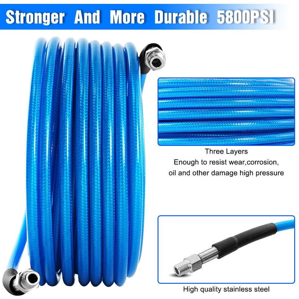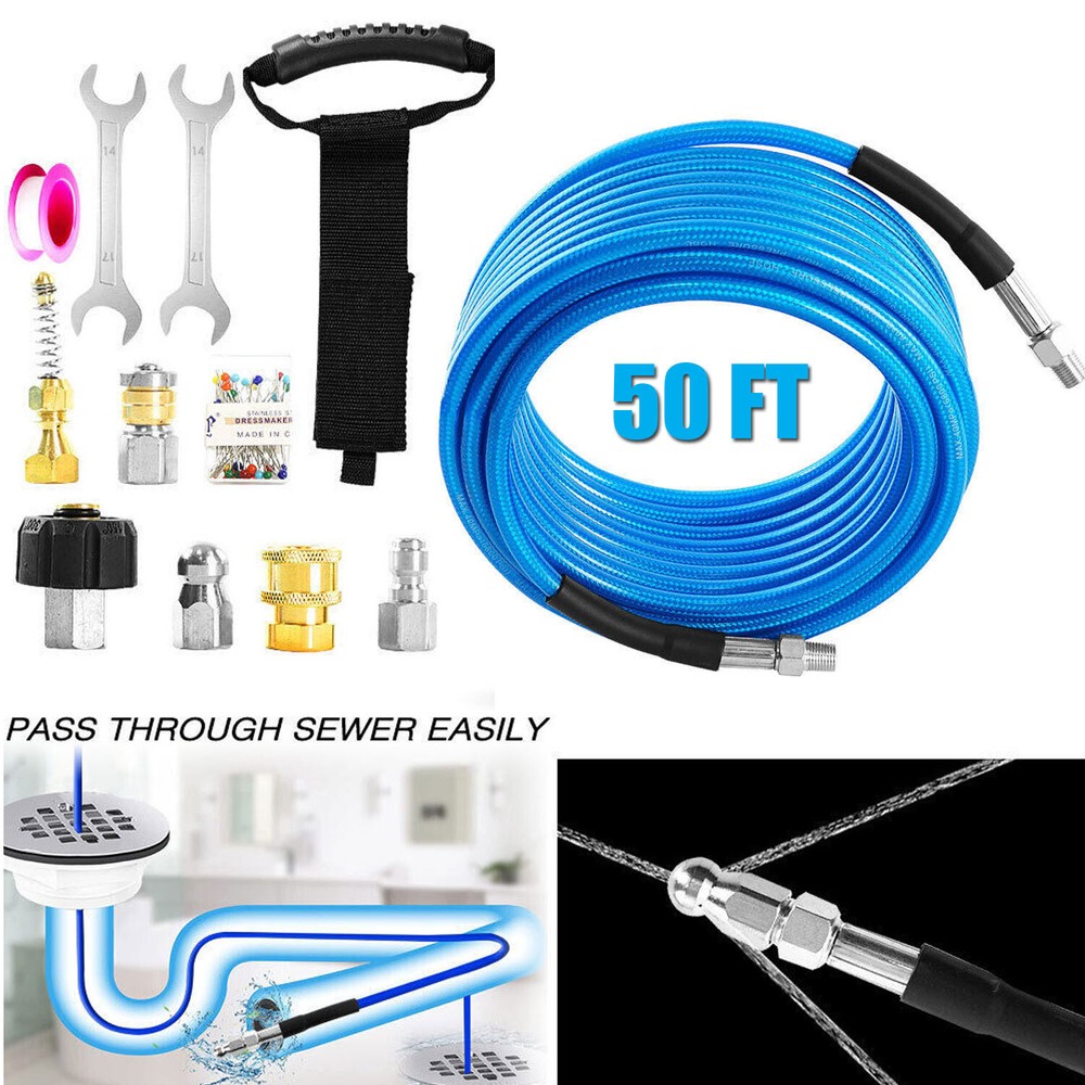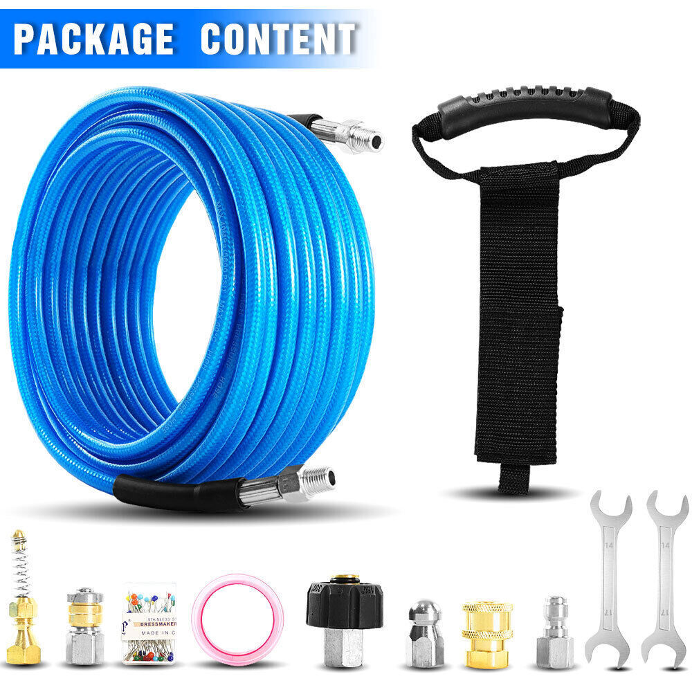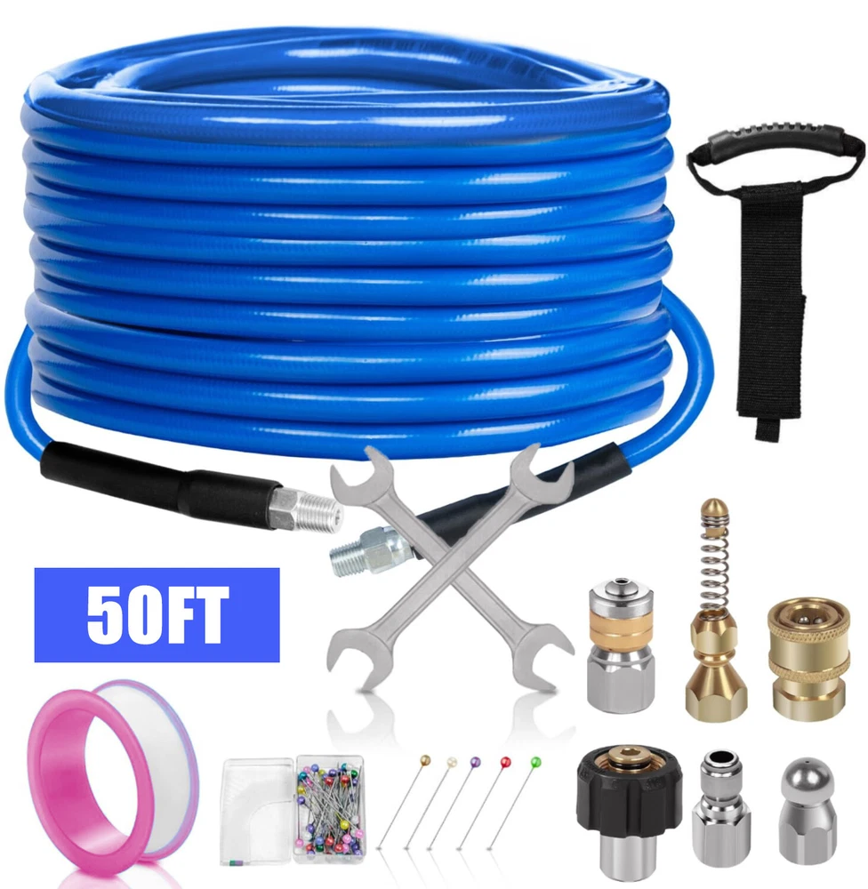 Features 【High Quality Hose】 【Utility Tools】 【Sewer Jetting Nozzles】 【Drain Jetter Nozzle】 【Quick Connect Plug】 Package include 1 X Sewer Jetter Kit, 1x Handle Strap For Storage, 1 X 1/4 Quick Connect Plug, 1 × M22 Female To 1/4'' Female Npt Coupler 1 X M22 Coupler 1 X Button Nose Nozzle 1x Rotating Sewer Jetter Nozzle, 1x Corner Sewer Jetter Nozzle 1 X Thread Seal Tape 1 X Box Of Pearl Corsage Pin, 2 X Spanners Sewer Jetter Kit for Pressure Washer Drain Cleaner Hose 100FT 1/4" M-NPT 5800PSI Features 【High Quality Hose】 High pressure washer hose with working pressure up to 5800PSI, inner hose made of thermoplastic polyester tubing reinforced with chemically bonded 1/4" high tenacity polyester braid, outer hose made of thermoplastic polyester tubing, all materials are of high quality to withstand the effects of sunlight, oils, ozone, and abrasion to prolong the product's lifespan. 【Utility Tools】: The pressure washer drain jetter can be used indoors and outdoors to clean cars, motorcycles, driveways, roofs, bathrooms, swimming pools, siding, windows, floors, gutters and more. We added 2 wrenches for installing nozzles or accessories, 1 box of pearl brooches to help clear clogged nozzles, waterproof tape to prevent nozzles from leaking, and equipped with a handle storage strap for easy carrying and storage. Thoughtful accessories make your use stress-free to use. 【Sewer Jetting Nozzles】: Button Nose Sewer Jet Nozzle clears clogs and flushes away debris by spraying 0° in the front and driving 3 33° jets in the back; Corner Sewer Jet Nozzle clears clogs in corners by spraying sideways, and the 3 rear nozzles are angled at a 33° angle to flush out debris and clogs from the front nozzles. 【Drain Jetter Nozzle】The rotating sewer jet nozzle provides even cleaning with 3 backward rotating jets that spray into clogged pipes; the pointed nozzle has 1 front and 6 rear jets, the front jets are good for cutting through debris and removing stubborn materials, and the rear jets drive the nozzle forward to flush out debris and clogs for a more effective cleaning. 【Quick Connect Plug】: Quick Connect Plug for Sewer Jetter Hose (Female M22 to Female 1/4'' NPT) is used in many high pressure connections that are often assembled or disassembled, and is ideal for quick replacement of sewer jetter hoses, medium/high pressure washer pumps, lances and nozzles, each time it makes a solid connection to the quick connect, allowing easy flushing of obstructions and Increase your cleaning efficiency. Package include 1 X Sewer Jetter Kit, 1x Handle Strap For Storage, 1 X 1/4 Quick Connect Plug, 1 × M22 Female To 1/4'' Female Npt Coupler 1 X M22 Coupler 1 X Button Nose Nozzle 1x Rotating Sewer Jetter Nozzle, 1x Corner Sewer Jetter Nozzle 1 X Thread Seal Tape 1 X Box Of Pearl Corsage Pin, 2 X Spanners Payment Shipping Return Contact us About us Payment 1.Paypal, Credit Card, G Pay etc, many payment way is accepted. 2.Please be sure your shipping address is correct before make a payment. Shipping 1.We are shipping from multiple warehouses (Houston, Texas/ Corona, California) , please note before placing an order 2.We will ship out the item within 1-3 business days after comfirming the payment, appreciate your patience. 3.If the items are broken on the way( we will check the orders clearly before we sent them ),please contact us in 3 days you received it. We will send you a new one or refund your payment. Return 1.We stand behind every buyer.Items can be returned for exchange or refund within 30 days. 2.Please contact us when you have any confusion of our item, we will solve the trouble for you as soon as possible. Contact us 1.This is professional Seller.We will reply your message within 24 hours. 2.Please contact us whenever you have any question about the item. We will deal with it as soon as possible. 3. If you are unhappy with the item or our service,please Contact Us before leave feedback,just give me a chance,thank you! About us 1. Unless specified otherwise, all our products are IN STOCK and are shipped from Local warehouse - Not Overseas! 2. We provide a 30 day Satisfaction Guarantee or your money back (provided items are in the same new and resaleable condition.) 3. We have a PayPal Verified Business Account, please buy with Confidence! 4. Every item will be tesrted before send.We know our products well and if we don't have the answers we will do our best to find them for you! 5. Our friendly team look forward to serving you! Your satisfaction is our No.1 Priority We will do our best to satisfacy you.