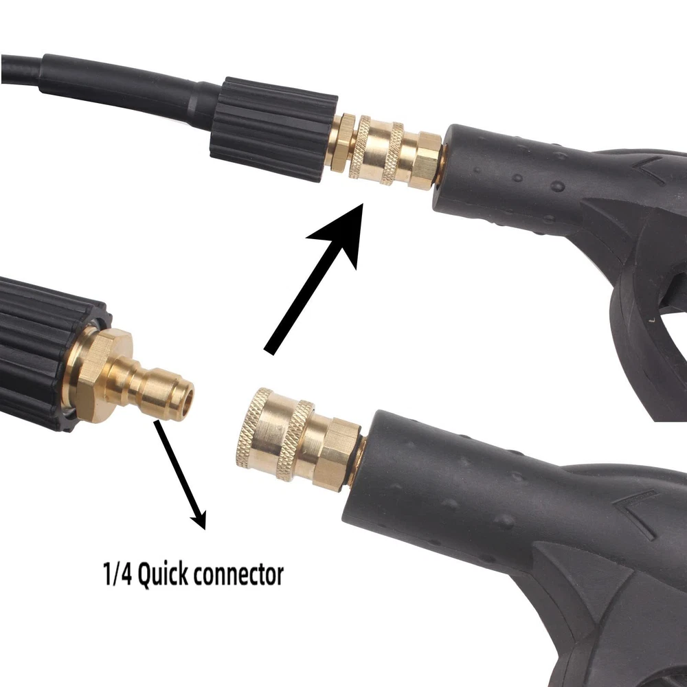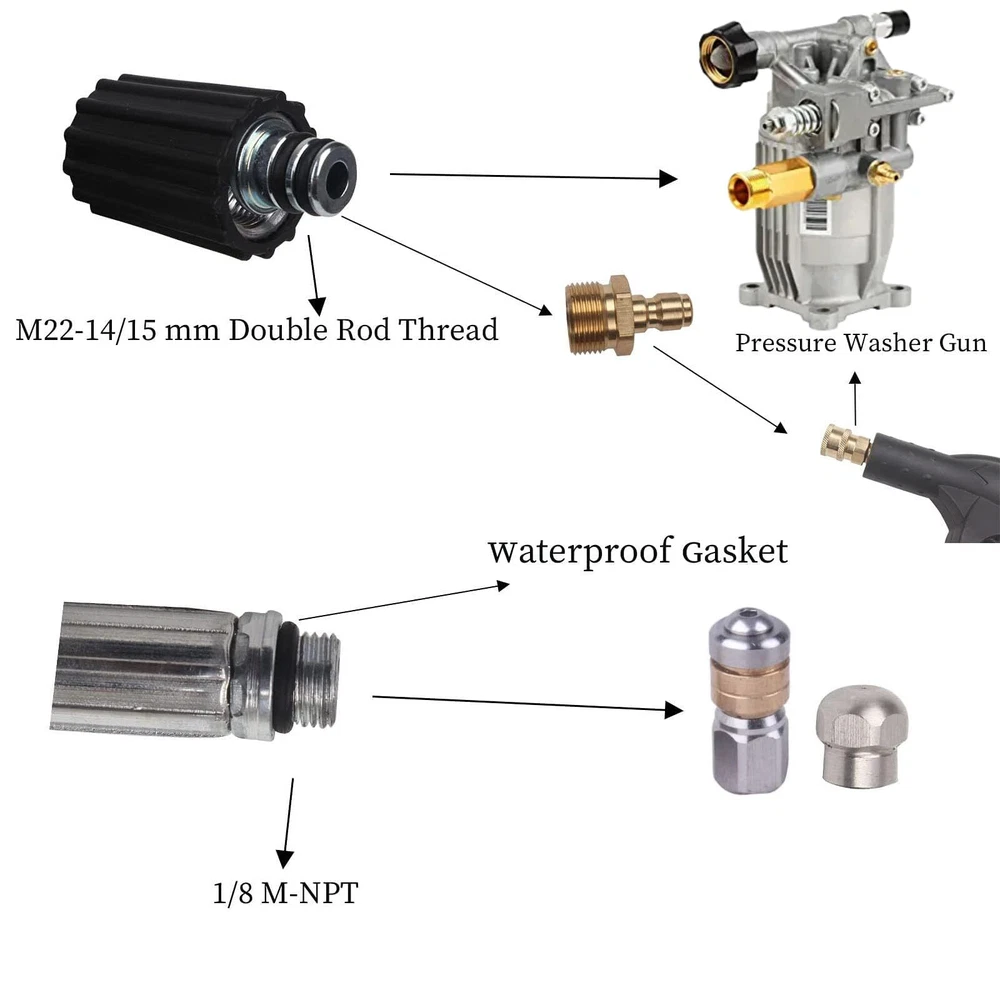 [Material] professional high pressure cleaning machine drainage pipe cleaner is composed of inner pipe, outer pipe.The inner tube is made of a thermoplastic polyester.The overlay is made of a thermoplastic polyurethane.Strong toughness, can be stretched without breaking.Aging resistance, durable can resist all kinds of oil, stains bad environment corrosion. [With two types of spray nozzles a M22 to 1/8” Quick Connect ]The cleaning sewer kit has a total of 2 nozzles alternating with the first button injector nozzle: 1 front injector with an injection angle of 0 to remove the blockage.Three rear injectors (injection angle of 33) can wash off the front 0 injector washed debris A second backward rotating injector, spray sideways to remove blockage and loose debris from the pipe wall. [Suitable for various brands of interface wire M22 pressure washer]The Sewer injector hose can be connected to the HP washer pump M22 outer thread via the M22-14 / 15mm twin-bar thread. [Suitable for cleaning a variety of places]High pressure washer hose can be used for clean dredge, roof, siding, sink, toilet, toilet, windows, gutter, motorcycle, car, driveway, etc. [100% Customer Technical Service] If we have any questions for help, we are online 24 hours a day and always contact us.