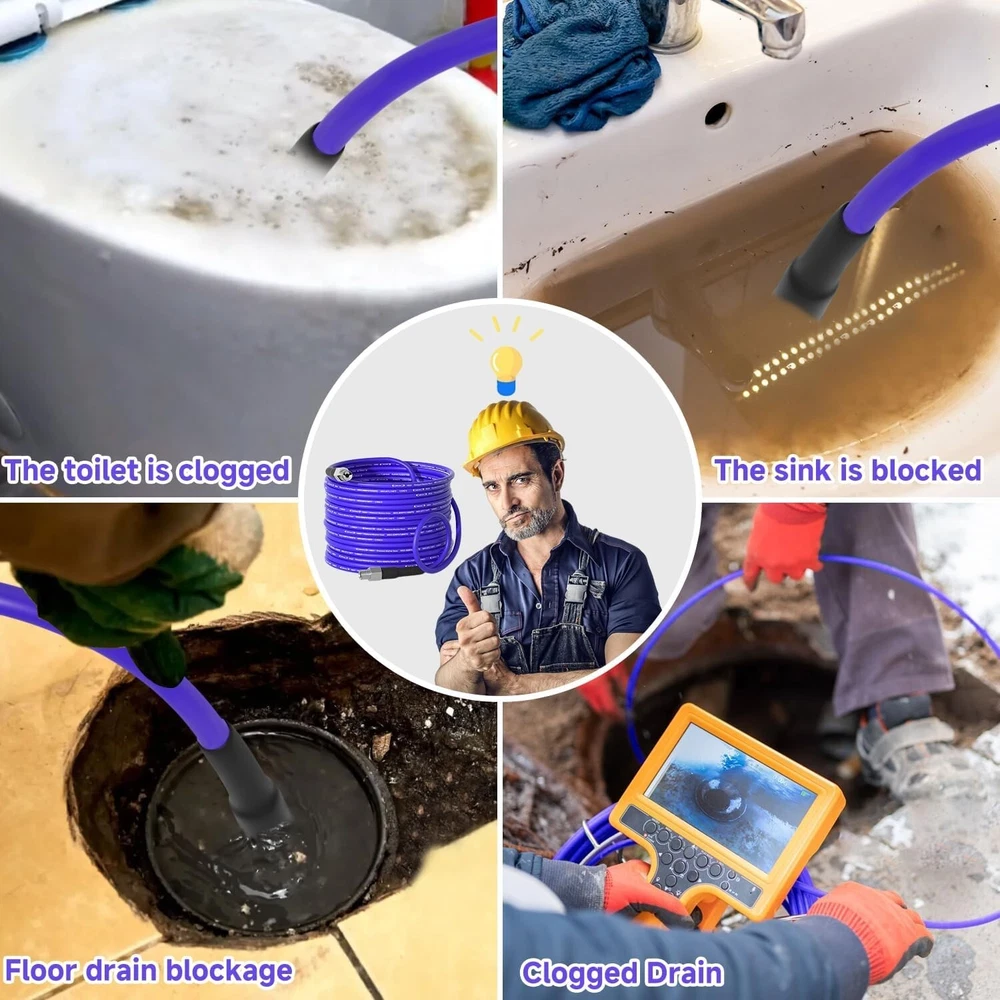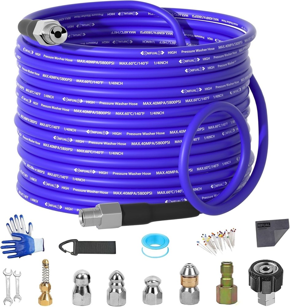 50FT Sewer Jetter Kit for Pressure Washer, 5800PSI Drain Cleaner Hose 1/4 Inch NPT Corner, Rotating and Button Hose Sewer Jetting Nozzle Waterproof Tape Pearl Corsage Pin Spanner Glove About this item [PROFESSIONAL SEWER JETTER KIT INCLUDES]: 1 x 50FT sewer jet hose, 1 x Spring Nozzle, 1 x Pointed sewer jetter nozzle, 1 x Corner sewer nozzle, 1 x Rotating sewer jetter nozzle, 1 × Mushroom nose nozzle, 1 x M22 female to 1/4’’ female NPT coupler, 1 x 1/4’’ Quick connect plug,1 x Handle strap for storage,1 x Waterproof tape, 1 x Box of pearl corsage pin, 1 x Cleaning cloth, 2 Spanners, 1 Pair of gloves. [UPGRADED THICKER CLEANER HOSE]: This newly upgraded hose has a thickened outer layer for more flexibility and durability during power washing. With generation durable braid material and process, it could delay aging and perfect balance the flexibility. it can resist weather, oil, ozone and abrasion. Working pressure can reach up to 5800PSI and temperature can reach 40°F/+140 F. Our sewer jetter hose can be used in most pressure washers to clear clogs with ease. [SEWER JETTER NOZZLES]: Ideal for general water pipe flushing and cleaning, provides excellent cleaning effect, clean soft sewer blocke. [QUICK CONNECT PLUGS FOR EASY USE]: Quick Connect Plug used in a lot of situations where high pressure connections are frequently assembled or disassembled.Ideal for quick exchange of pressure washer outlet, sewer jetter hose, guns and nozzles.It makes a solid connection with quick coupler each time.Pressure washer coupler convert metric M22 14mm female NPT thread to 1/4" Female NPT. [WIDELY APPLICATION]: High pressure washer hoses can be used to clean cars, motorcycles, floors, windows, driveways, roofs, siding, sink, toilet, outdoor, indoor and etc. 2 spanners are preapred for easy to install nozzle or coupler, 1 box of pearl corsage pin can help to clean the nozzle blocking, and waterproof tape can help prevent water leak. Specifications Product Dimensions 9.84 x 9.84 x 3.93 inches Item Weight 4.6 pounds Shipping Tracking number: Available We use a selection of shipping services such as UPS, FedEx, USPS etc. We only ship to the lower 48 states, no APO/FPO addresses or PO Boxes allowed. Local pickups and combined shipping options are not provided at this time. Tracking number: Available We use a selection of shipping services such as UPS, FedEx, USPS etc. We only ship to the lower 48 states, no APO/FPO addresses or PO Boxes allowed. Local pickups and combined shipping options are not provided at this time. Contact us We can be contacted at any time through eBay messages if you have any questions, comments or product requests. We will respond to you within 24 hours and do our best to help you out! We encourage our customers to contact us with any questions or concerns! We'd like to be sure you are completely satisfied with your purchase.