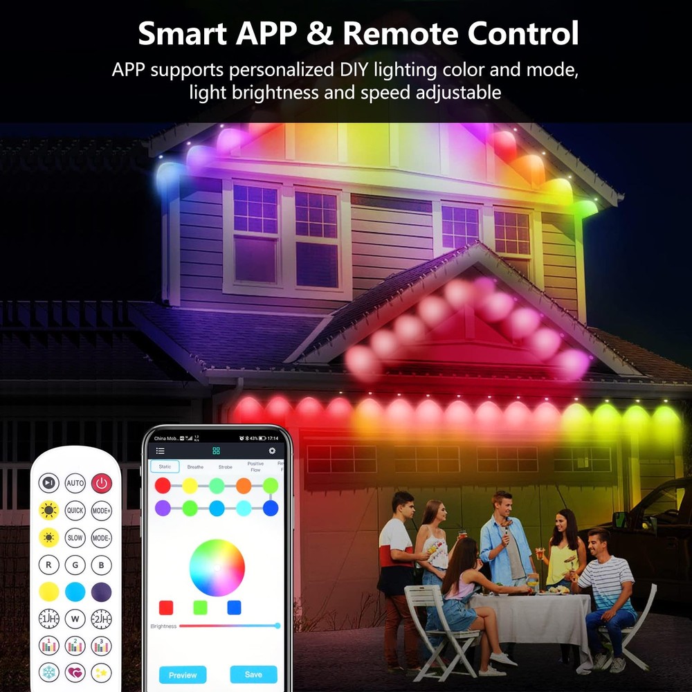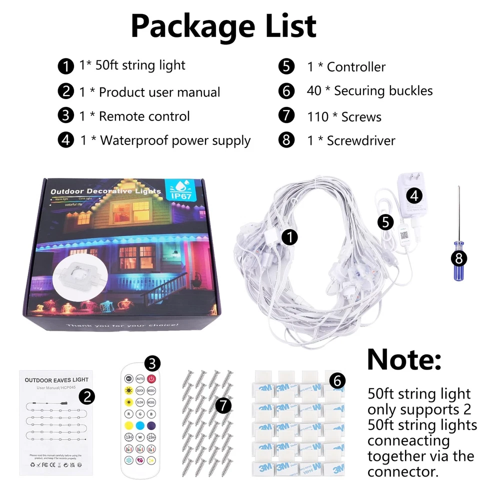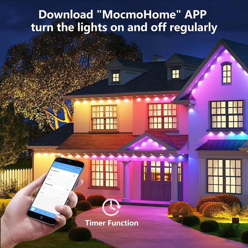 Permanent Outdoor Lights for House,50FT Eave Lights with 30 RGB LED,IP67 Waterproof Year-Round Outdoor Decorative Lights with APP & Remote Control for Garden Party Christmas Holidays 【Abundant Color Options】: This eave light has multiple color options, single color can be fixed. You can choose different color combinations, different scene modes. 54 different scene modes and 16 million colors can provide you colorful outdoor decorations for daily or holidays. 【Smart APP & Remote Control】: Download "MocmoHome" APP, you can easily control the light by your phone. The APP supports personalized DIY lighting color and mode, allows light brightness and speed adjustment, and turn the lights on and off regularly. 【Outdoor Waterproof】: This multi-color changing eave light is designed for outdoor use with IP67 waterproof feature, no worries about rain, snow weather.High quality anti-UV material ensures normal daily use. Lights lifespan is more than 50000 hours and working temperature is -4°F to 104°F. 【Sync with Music】: Choose the Rhythm mode,light effect can change with the rhythm of the sound and music,brings you more fun.Built in atmosphere effects for different occasions,this permanent outdoor light is perfect for Christmas, Halloween, Wedding, Party decorations. 【Easy to Install】: Packaged with all the accessories needed for installation, remove the 3M adhesive on each light back and press each light for 5 seconds to ensure solid connection, then use screw clips to keep each light secure. Note: Install lights 2-4 inches from the wall surface.