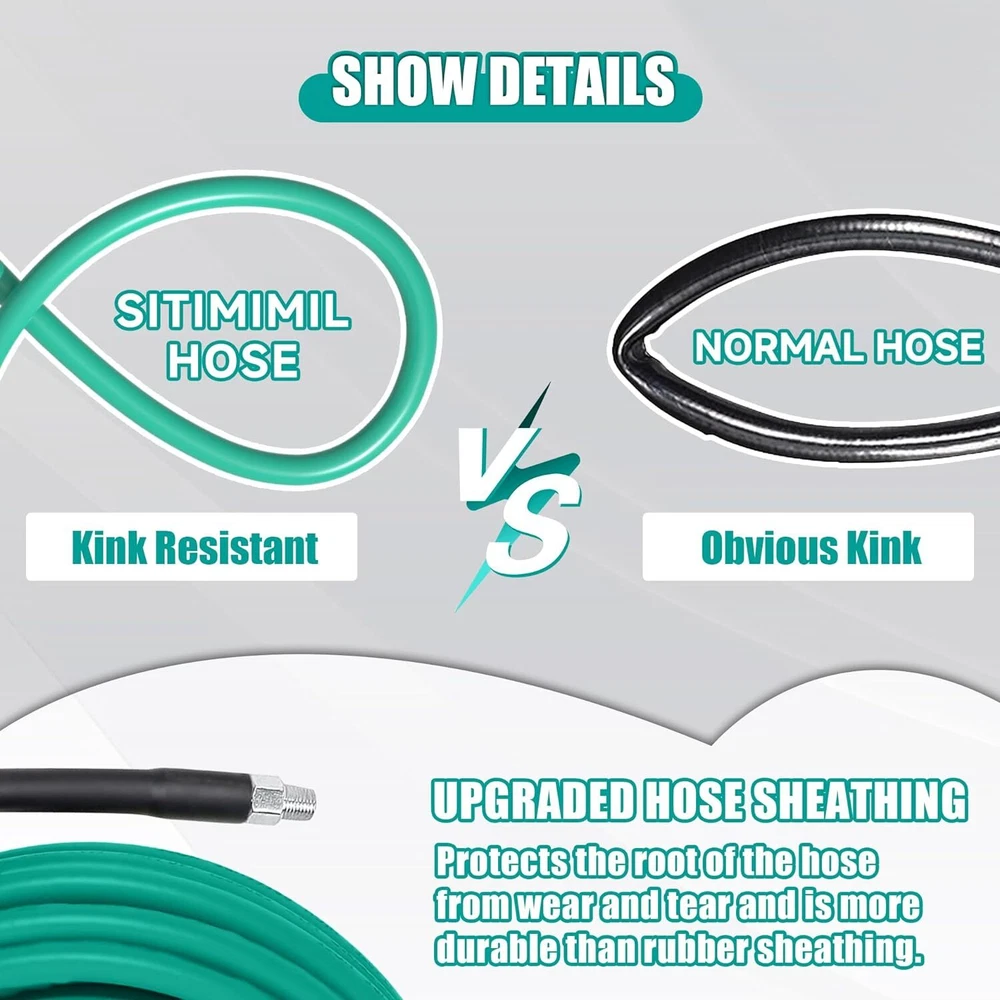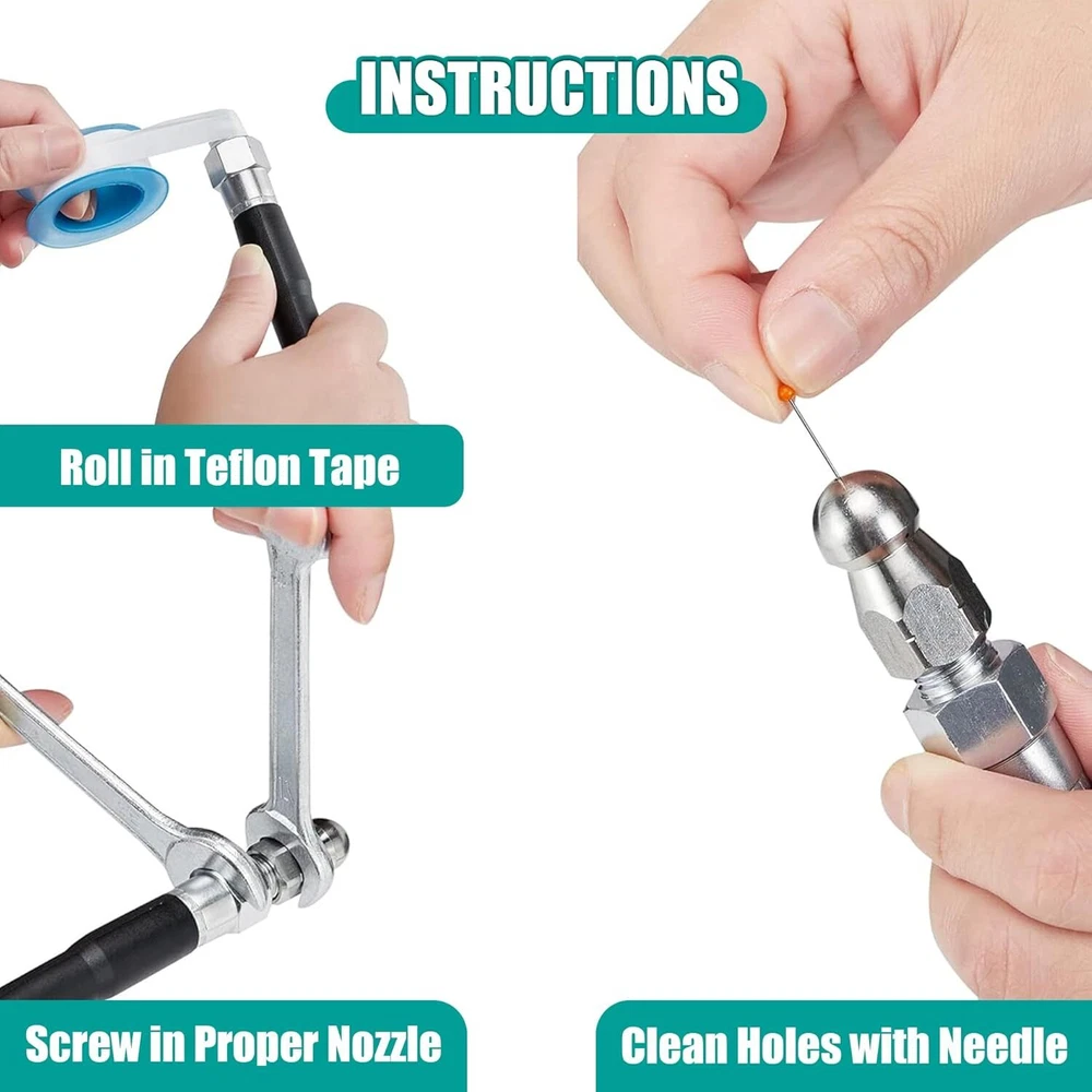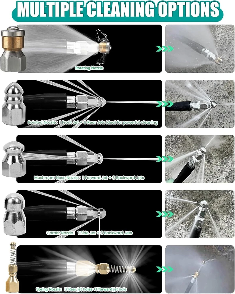 Product Description 50FT Sewer Jetter Kit for Pressure Washer,1/4‘’NPT Drain Cleaner Hose 5800PSI, with Adapter Corner Rotating Button Nose Sewer Jetting Nozzles Kit Pearl Corsage Pin Spanner Waterproof Tape [Drain Jetter for Pressure Washer]: 1 × sewer jet hose,1 × button nose sewer jet nozzle,1 × M22 female to 1/4’’ female NPT coupler,1 × 1/4’’ quick connect plug,1 × rotating sewer jetter nozzle,1 × corner sewer nozzle, 1 × Spring nozzle, 1 × Pointed Nozzle ,1× waterproof tape, 2 x spanners, 1x box of pearl corsage pin. Complete sewer jetter kit to meet your variety need. [HIGH QUALITY 5800PSI Pressure Washer Drain Jetter CLEANER HOSE]: Sewer jetting hose has inner tube, reinforcement and cover. Inner tube is made of thermoplastic polyester. Reinforcement layer is 1/4" high tenacity polyester textile braid which is chemically bonded. Cover layer is made of thermoplastic polyurethane, which can resist weather, oil, abrasion and ozone. [5 EFFICIENT SEWER JETTER NOZZLES]:Button Nose Sewer Jetter Nozzle ;clears blockage and flush out debris .Rotating Sewer Jet Nozzle ;offers an even cleaning and flushes out debris blast into clogged pipe and moves it through pipe.Corner sewer jetter nozzle ;clears blockages at the corner, flush out debris loosened by the front jet.Pointed nozzle ;clean and unblock water sideways to clear blockages at the corner, more powerful cleaning.Spring nozzle;flexible and lightweight for easy cornering. [QUICK CONNECT PLUG and FEMALE METRIC M22 to 1/4 Inch FEMALE NPT FITTING ]Quick Connect Plug used in a lot of situations where high pressure connections are frequently assembled or disassembled.Ideal for quick exchange of pressure washer outlet, sewer jetter hose, guns and nozzles.It makes a solid connection with quick coupler each time.Pressure washer coupler convert metric M22 14mm female NPT thread to 1/4" Female NPT. [COMPLETE SET for WIDELY USE ]: High pressure washer hoses can be used to clean cars, motorcycles, floors, windows, driveways, roofs, siding, sink, toilet, outdoor, indoor and etc. 2 spanners are preapred for easy to install nozzle or coupler, 1 box of pearl corsage pin can help to clean the nozzle blocking, and waterproof tape can help prevent water leak. About Us We are a reputable seller with many years of experience selling on eBay. Our goal is to provide high-quality products and excellent customer service. Shipping Items will be shipped within 1-3 business days when we received payment. (Orders are not processed on weekends & holidays) Tracking information will be sent once item is shipped. Delivery time depends on destination and other factors Item is shipped to ebay address. Leaving correct address can minimize delay. For international shipping and shipping to Guam, Hawaii and Alaska, Please contact us before placing the order. International buyers please note: Import duties, taxes and charges are not included in the item price or shipping charges. These charges are buyer’s responsibility. We will try our best to reduce the risk of the custom duties. Local pick-up is unavailable at the moment. Contact Us We reply any email messages within 1 business / working days(off-duty at weekend). If you do not get a response from us, then please check your junk or spam mailbox. Our Business hours: Mon-Fri 9:00-18:00, UTC/GMT +8 hours. Please contact us either by clicking "contact seller" in the "purchase history" section or simply click "ask a question" at the bottom of this page. If you are unsatisfied with our item or service, please contact us before leaving any feedback. We are committed to resolve all issues in a friendly and satisfactory manner.