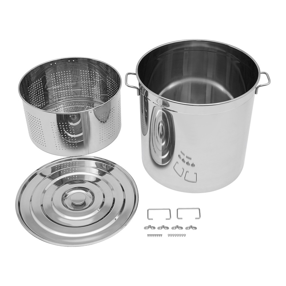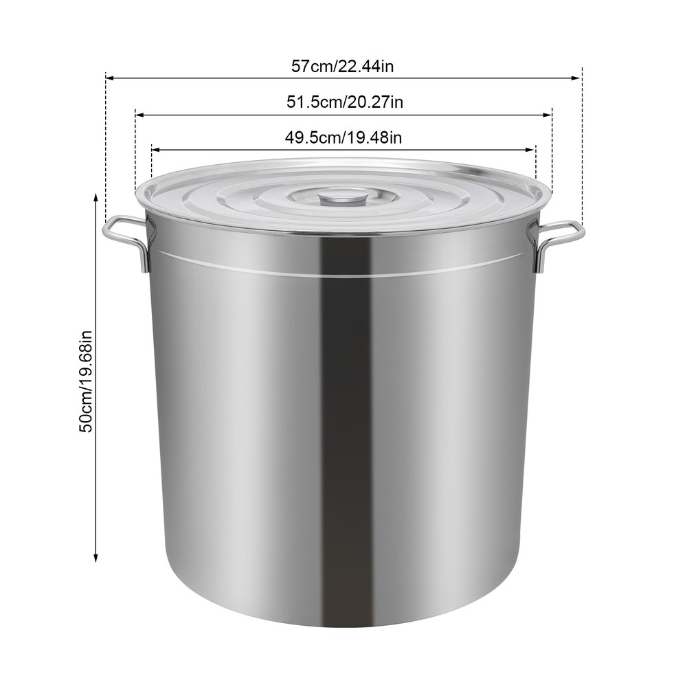 50L/52.8Qt Stock Pot Stainless Steel Stock Pot Kitchen Cooking Pot w/ Basket Description This stainless steel stock pot is made of high-quality 201 stainless steel material with excellent corrosion and high-temperature resistance. The filter basket allows for easy separation of solids and liquids. Its large capacity is suitable for family gatherings and most commercial applications. Key Features Selected Materials: This product is made of thickened 201 stainless steel, which is not easy to deform and rust, very sturdy and durable. Large Capacity: The pot has a capacity of 52.8 Qt and the basket has a capacity of 42.26 Qt, so they can meet most families' and even commercial needs. Functional Basket: The basket with evenly distributed perforated holes not only is ideal for steaming, boiling, deep frying, etc. but also allows for quick filtration while preventing food from falling out, which is more convenient. Thoughtful Design: The lid helps seal in heat, flavors, and aromas, ensuring your foods retain their moisture and taste and resulting in delicious and flavorful meals. Its round handle allows this lid to be hung directly on the handles of the pot, saving space and making it easy to access. High Compatibility: This product is compatible with gas stoves, electric burners, induction burners, and open flames, which brings more convenience to your cooking. Easy to Clean: The polished smooth surface, large opening, and 3-part design allow you to easily clean this product with gentle detergents, clean water, and a soft dry cloth. Protective Package: To prevent the product from being damaged during transportation, we packed it with foam to protect your products to the maximum extent possible. Customer Service: We aim to provide quality products and services. If you have problems, please feel free to contact us. We will reply and solve the problem for you as soon as possible. Details Rolled Edges: The edges of this bucket are designed to be rolled, which not only looks beautiful but also prevents scratches or bruises. Retractable Handles: The retractable handles on the basket are designed to save space without affecting the functionality of the lid. Application It applies to boiling crawfish, crab, seafood, fried turkey, steamed tamale, etc. in restaurants, chip shops, cafeterias, buffets, hotels, kindergartens, outdoor, camping, wedding receptions, construction sites, or various large events or celebrations. It also can be used as a deep-frying filter bucket, marinade bucket, or vegetable and fruit-draining bucket. Specification Color: Silver Style: Modern Shape: Cylinder Material: 201 Stainless Steel Finishing Process: Polished Assemble Required: Yes Pot Capacity: 50 L/52.8 Qt Bakset Capacity: 40 L/42.26 Qt Pot Height: 50 cm/19.68 in Pot Diameter with Handles: 57 cm/22.44 in Lid Outer Diameter: 51.5 cm/20.27 in Lid Inner Diameter: 49.5 cm/19.48 in Basket Inner Diameter: 47.5 cm/18.7 in Basket Outer Diameter: 49.5 cm/19.48 in Basket Height: 27 cm/10.63 in Gross Weight: 11 kg/24.25 lbs Net Weight: 10 kg/22.05 lbs Package Size: 56*53.5*53.5 cm/22.05*21.06*21.06 in Package Included 1* Stock Pot 1* Basket 1* Lid Other Accessories for Assembly Notes The food in the pictures is not included. Due to the large size, please be careful when using it on the stoves. Please double-check the size if it fits your needs before purchasing. Please wash it with a non-abrasive scrubber and gentle soapy water. Please make sure to dry it thoroughly before storing it away. Strong acids and alkalis should not be stored in stainless steel containers for periods. How to clean a burnt pot: Add a layer of white vinegar or warm water to cover the bottom, add enough baking soda, let the mixture sit for a few hours or overnight, and then add more baking soda and scrub with a nylon brush or scour sponge. Please allow the slight color difference caused by the shooting light and 1-3cm error due to manual measurement, and make sure you do not mind before ordering. Payment Delivery details Terms of sales About us Contact us Payment We accept ebay payment 。 Fees such as import duties, taxes are not included in the item price or shipping costs. These charges are the buyer's responsibility. Delivery details Shipping: 2-9 working days to: USA Terms of sales We maintain high standards of excellence and strive for hundred percent customer satisfaction. Feedback is very important to us. We hope that you contact us immediately before you give neutral or negative feedback, so that we can address your concerns. It is impossible to address issues if we do not know about them! About us Your satis faction is our ultimate goal. We work hard to earn your trust and future business. Our certified technicians have tested each item before shipping. The unit comes with 1 year limited warranty on all manufacturing defects. a) If you receive a defective item, you may return it or ask for a discount. Please contact us within 14 days after you receive the package. b) What you returned must be intact and in its original packaging as re? u. Customer is responsible for shipping costs of the returned item. c) We will cover the cost of shipping back t with the shipping rate indicated in the registration page. We will send you a new unit or refund the full payment you paid. Thank you. Contact us Business Hour Business Hour: Monday To Friday: 8:30 AM to 5:00 PM (Beijing China time) Due to time zones, our reply to your questions may not be immediately. But within above working time, we will reply your email within 24 hours. If it's non-workdays, please kindly be patient and wait till Monday. Please contact us with ebay message. Please feel free to contact us if you have any questions. Monday To Friday: 8:30 AM to 5:00 PM (Beijing China time) Due to time zones, our reply to your questions may not be immediately. But within above working time, we will reply your email within 24 hours. If it's non-workdays, please kindly be patient and wait till Monday. Pleas