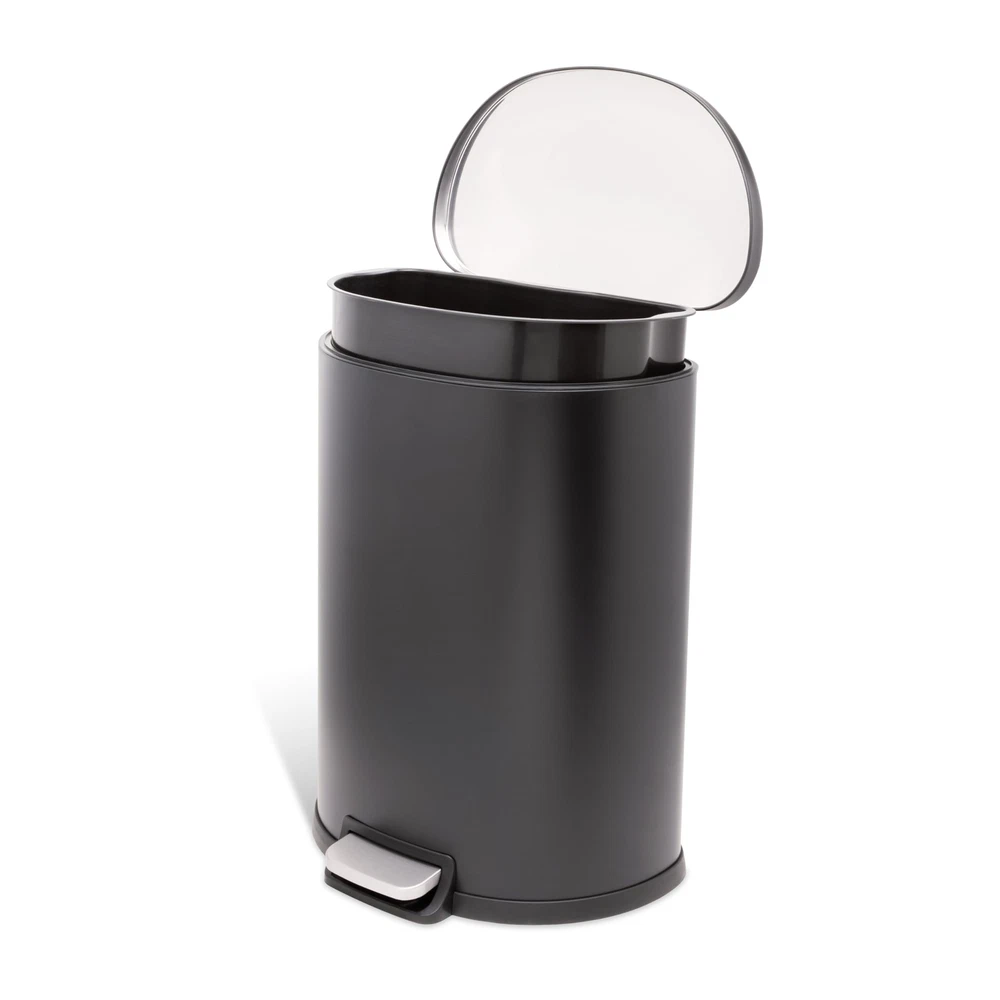 Well Designed and Engineered 50L Stainless Steel Step-On Trashcan Suitable for any area of your home, this well-designed and engineered 50L Matte Black Stainless Steel Step-On Trashcan is versatile and fits seamlessly in various spaces. The D Shape design allows it to blend in perfectly in areas such as kitchens, offices, living rooms, restaurant bathrooms, bedrooms, dorm rooms, or any open space . The removable bucket liner feature allows you to keep the bag hidden from public view, maintaining a neat and clean appearance. 50L capacity with easy step-on mechanism Stainless steel construction with soft close lid closer Removable bucket liner keeps the bag hidden from sight Keeps trash orderly for a tidy space Versatile slim design suitable for many areas Make trash disposal easy and stylish with this Stainless Steel Step-On Trashcan. The removable bucket liner ensures that the bag remains hidden, contributing to a neat and organized space. The easy step-on mechanism and soft close lid closer add convenience to your waste management. OUR QUALITY: High-Quality 430 Stainless Steel and ABS Construted. Our Trashcan is Build to Last! Fingerprint and Smudge Resistant Coating Make Cleaning a Breeze. OUR CRAFTSMANSHIP: Large, Wide Opening Area. Provides Easy Access for Daily Chore Work. OUR DESIGN: Modern, Stylish, Elegant, Completes and Show Case Your Home With This Missing Piece. OUR VISION: Multi-Purpose, Suitable for Kitchen, Bath, School, Hotel, Airport, Construction Site, Office Space, Indoor/Outdoor, Boat, RV, and More.. OUR PROMISE: 100% Satisfaction Backed by Dedicated Customer Support Team, Worry Free Defective Replacement at No Additional Charges to You.