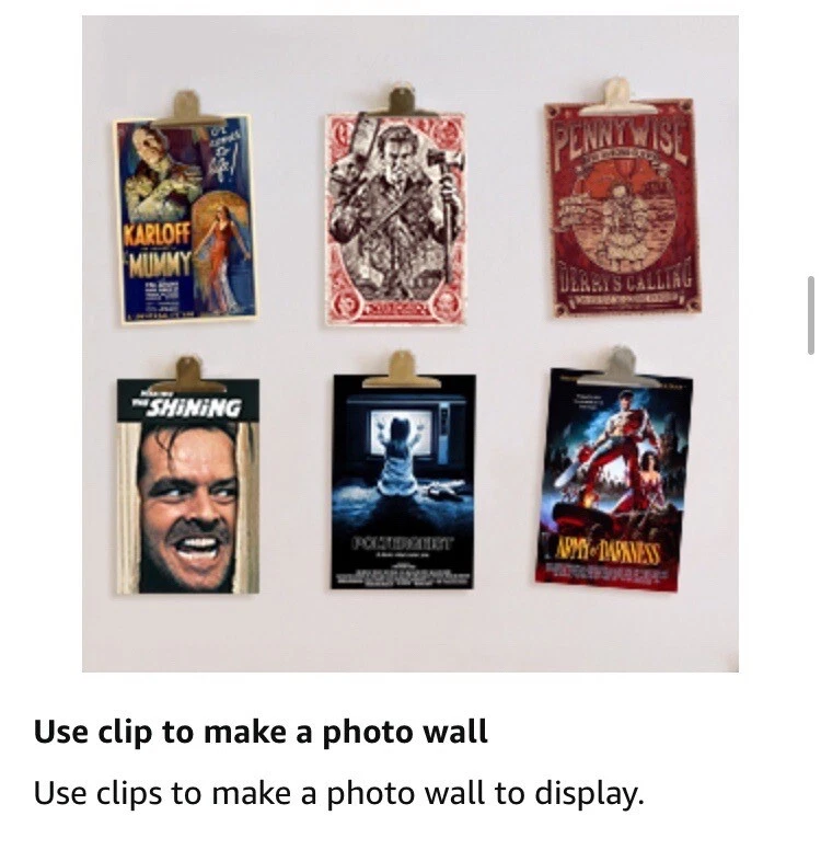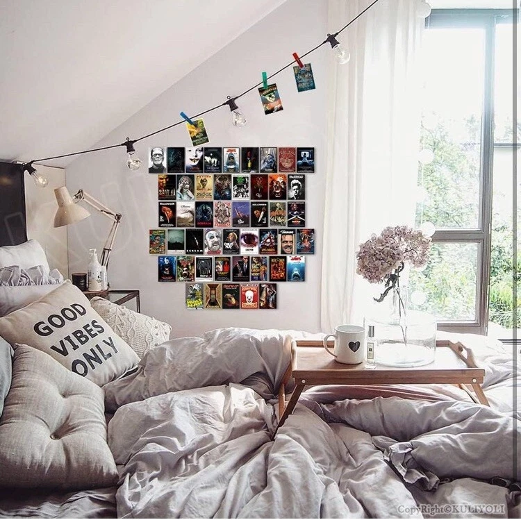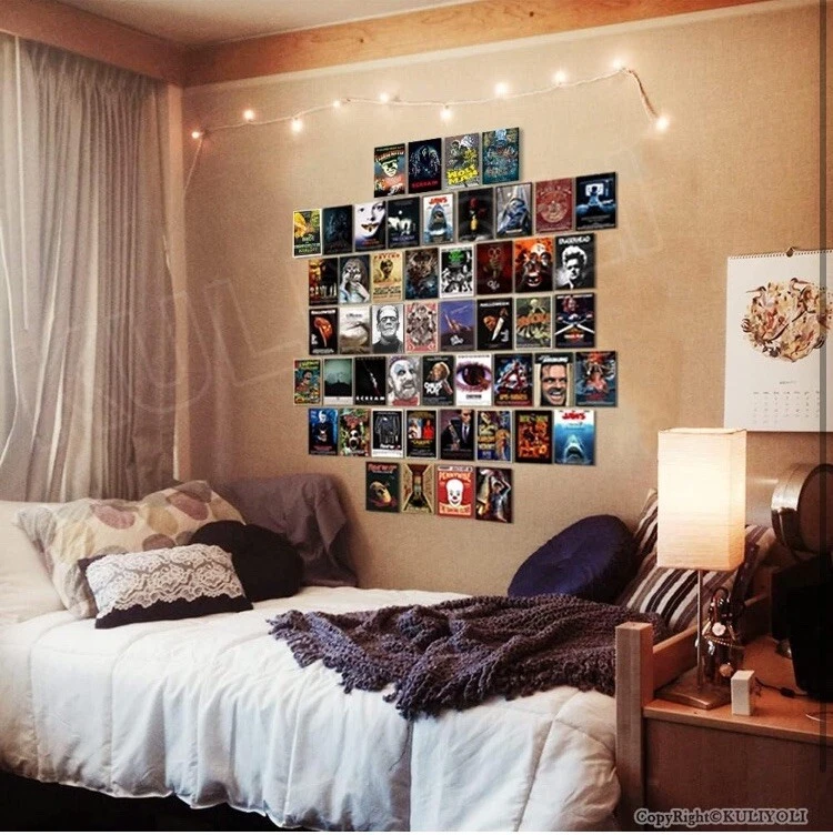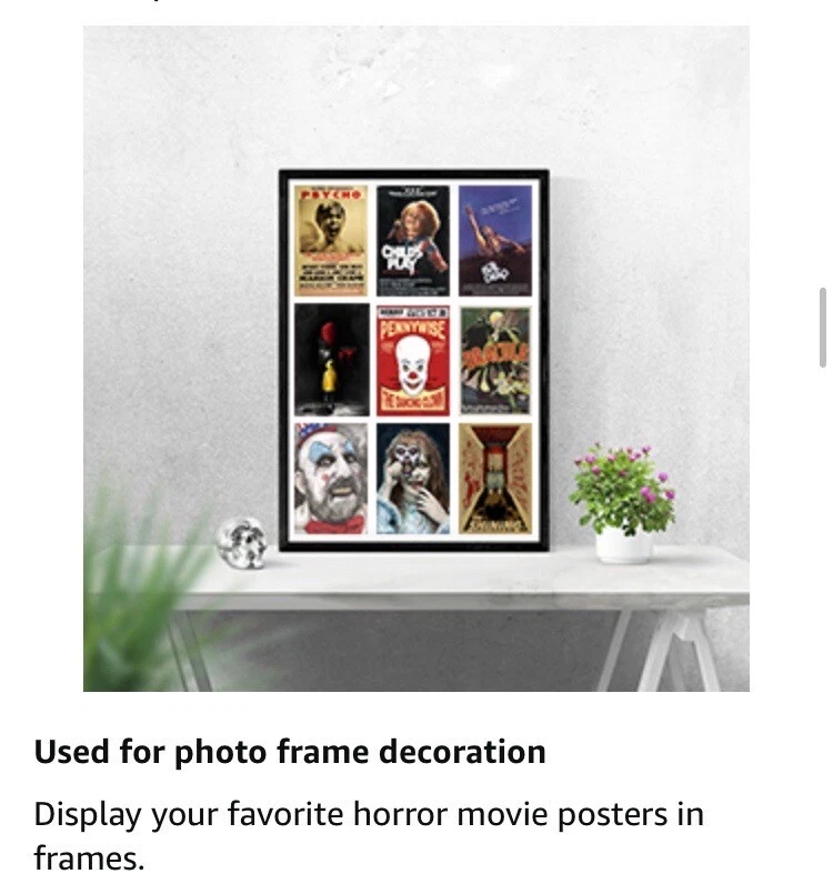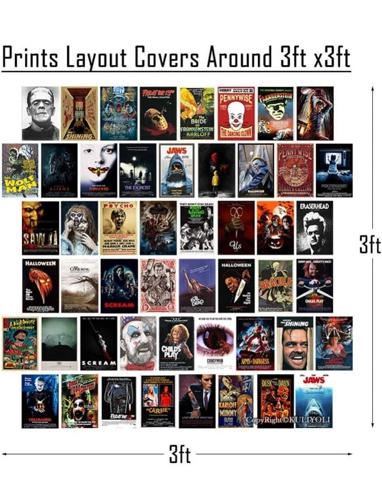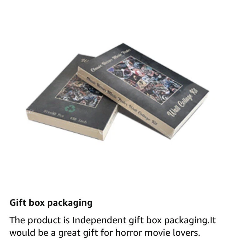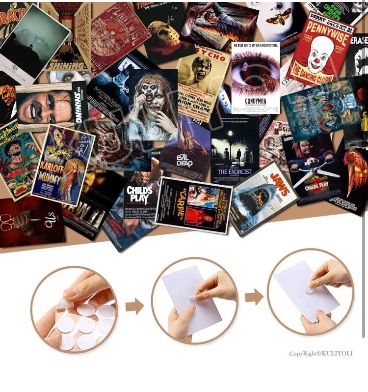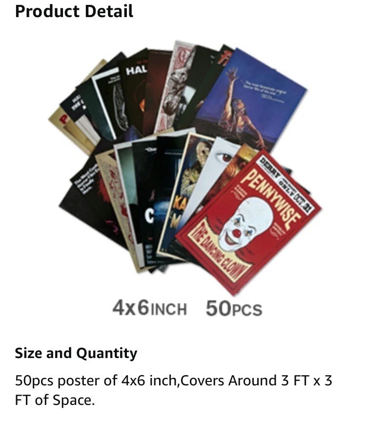 50PCS Classic Horror Movie Poster Wall Collage Kit Aesthetic Pictures Collage Vintage Film Photo Wall Home Theater Room Dorm Bedroom Wall Decor 4" x 6" Top highlights Size 4 x 6 Inch Product Dimensions 6"L x 4"W Item Weight 200 Grams Number of Items 50 Orientation Portrait Shape Rectangular ✔ Size and Quantity: 50pcs poster of 4x6 inch,Covers Around 3 FT x 3 FT of Space ✔ Premium Quality Materials: We use only first-class materials to manufacture our mini posters.The horror movie wall collage set is printed on 300gsm glossy cardstock paper professionally, which is durable, not easy to tear, smooth to the touch, clear patterns and not easy to fade ✔ Retro Decoration: 50PCS Classic Horror Movie Poster Wall Collage Kit made of more than thirty classic horror movies, bringing you a retro and nostalgic decoration style. ✔ Sutiable in Different Scenario: You can select whether want to straight stick them on the wall, or hang these posters with clips and grid wall. And it is easy to create an artful collage poster or gallery wall. It is able to decorate bedroom, study room, living room, office, dormitory, classroom, corridor and so on.In addition, this product comes with advanced stickers