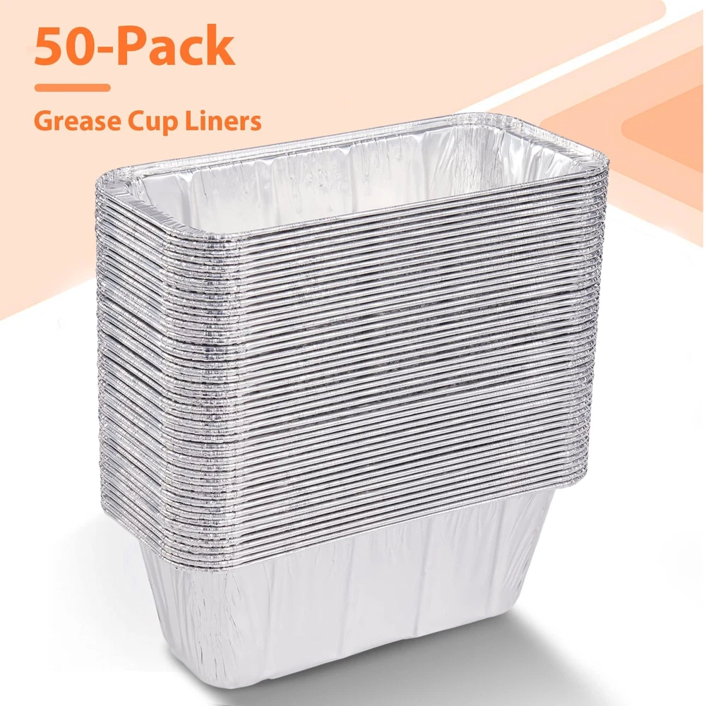 " Do you want not the added work of cleaning up your old nasty grease cups? By adding a liner you can spend more time eating the delicious food that you make on your Blackstone grill and less time having to clean up at the end of your dinner; Simply pull out or old drip pan and insert a new one at your convenience. This means more comfort for you; Wide compatibility : Perfectly fit all Blackstone grill pans, all the way from smallest griddle to large griddle. Please keep in mind that you will have to bend the liners slightly to accommodate them to fit the Blackstone 22 and 17-inch models grease cups Easy to use : Just insert them inside the griddle's drip tray, cook delicious foods and simply toss in the waste bin when full Heavy-duty construction : These foil grease cup liners are sturdy enough to hold the weight of grease and all the mess Large capacity : These foil grease cup liners can hold up to 27 oz " Perfect Fit : Each grease cup liner measures 8 x 3 x 3.7 inches and fit the grease tray on your Blackstone griddles 28 inch, 30 inch, and 36 inch. These Blackstone 5017 drip pan liners for the Blackstone 22 and 17 inch models will require you to bend the liners slightly to fit properly No More Messy Grill : The grill drip tray is the perfect accessory for your grease catcher. Specifically designed to collect grease and drippings from cooking delicious food on your gas grill for a clean, mess-free grilling experience Make Cleaning A Breeze : Simply fill the disposable foil drip pan liner and collect the grease and food residue, and once you're done, you can throw it away for a new drip tray, helps with easy cleanup after cooking and seasoning. Set of 50 drip pans to last all Season, price point - a fantastic value Durable AND Space-saving : These drip pan liners are made of high quality aluminum foil, sturdy, heavy-duty, won't break easily, eco-friendly and 100% recyclable. The aluminum drip pans are also stackable to help you save shelf and countertop space. Lightweight and easy to carry, they are a great addition to your outdoor grill Multipurpose : Absorbs and reflects heat more efficiently, withstands extremely high temperatures without warping or melting, perfect for use in the oven or on the grill. Our grease cup liner can also be used in ovens and freezers, ideal for preparing food or preserving food before you get ready to grill. Great for baking, barbecues, grilling, beach, camping, picnics, parties and more