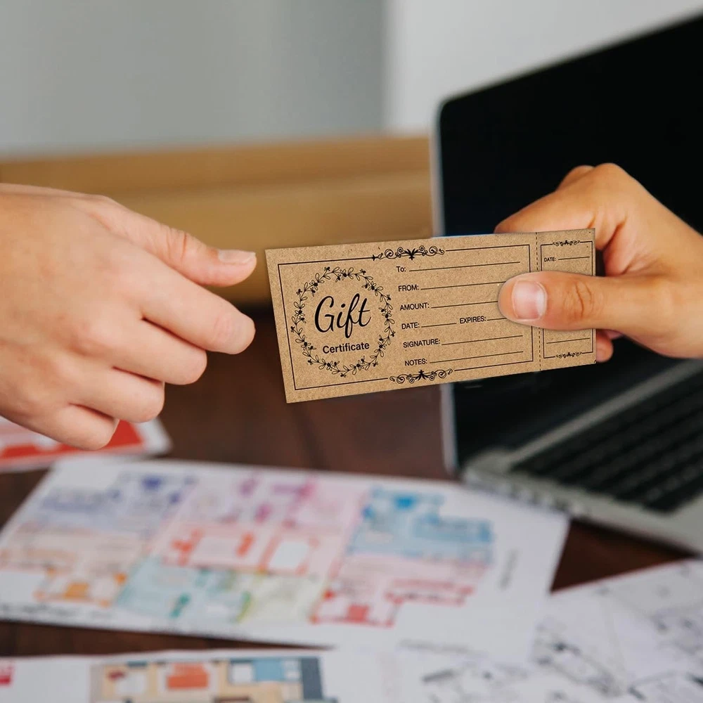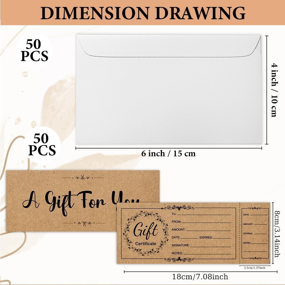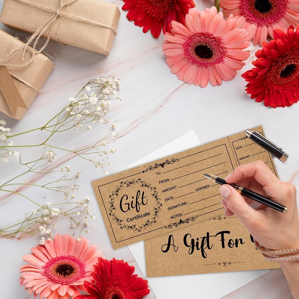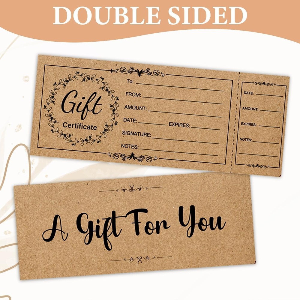 50-Pack Premium Blank Gift Certificates - Elegant Gold Foil Business Vouchers Enhance your business's professional image and boost seasonal sales with this premium set of 50 blank gift certificates. Featuring sophisticated gold foil accents and a clean, modern layout, these vouchers are perfect for boutiques, salons, restaurants, and small businesses. Each certificate comes with a matching high-quality envelope, providing a complete and elegant gifting experience for your customers and their loved ones. Key Features and Specifications 50 Complete Sets: Includes 50 double-sided gift certificates and 50 premium business envelopes, ensuring you are fully stocked for the holidays or busy seasons. Luxury Gold Foil Design: Intricate gold foil stamping adds a high-end, celebratory feel that conveys value and professionalism. Heavyweight Cardstock: Printed on 300GSM thick, uncoated paper that feels substantial in the hand and prevents ink from smudging or bleeding. Detailed Information Fields: Pre-printed sections include spaces for: To, From, Amount, Date, Authorized By, and a dedicated Certificate Number for tracking. Standard Business Size: Measures 3.5 x 7 inches, fitting perfectly into the included 4 x 7.5 inch envelopes for a sleek, compact presentation. Easy to Write On: The matte finish surface is compatible with ballpoint pens, gel pens, and stamps, allowing you to fill out details quickly and neatly. Ideal for Small Businesses and Special Events These versatile vouchers are designed to suit a wide variety of industries and personal uses: Service Industries: Perfect for hair salons, spas, massage therapists, and nail technicians to offer "at-home" spa gifts. Food & Beverage: A professional way for local cafes, bakeries, and restaurants to sell store credit or specific meal packages. Retail Boutiques: Drive customer loyalty by offering attractive gift cards that look much better than a standard printed receipt. Personal Gifting: Use them for "Custom Coupons" (e.g., "Good for one home-cooked dinner") for friends and family during birthdays or Christmas. Why Choose Paper Gift Certificates? While digital gift cards are convenient, a physical, beautifully designed certificate offers a tactile experience that feels like a "real" gift. The gold foil detailing instantly elevates the perceived value of your services, making customers more likely to choose your business for gifting. Additionally, the manual tracking fields (like the "No." line) allow small business owners to maintain their own simple ledger without needing expensive POS software integrations. Professional Presentation Tips To maximize the impact of your gift vouchers, consider using a custom business stamp with your logo on the back or in the "Authorized By" section. If you have a signature color for your brand, you can add a small sticker or a piece of ribbon to the envelope to make the presentation even more memorable. Store the certificates in a dry, flat place to keep the cardstock crisp and the foil shining.