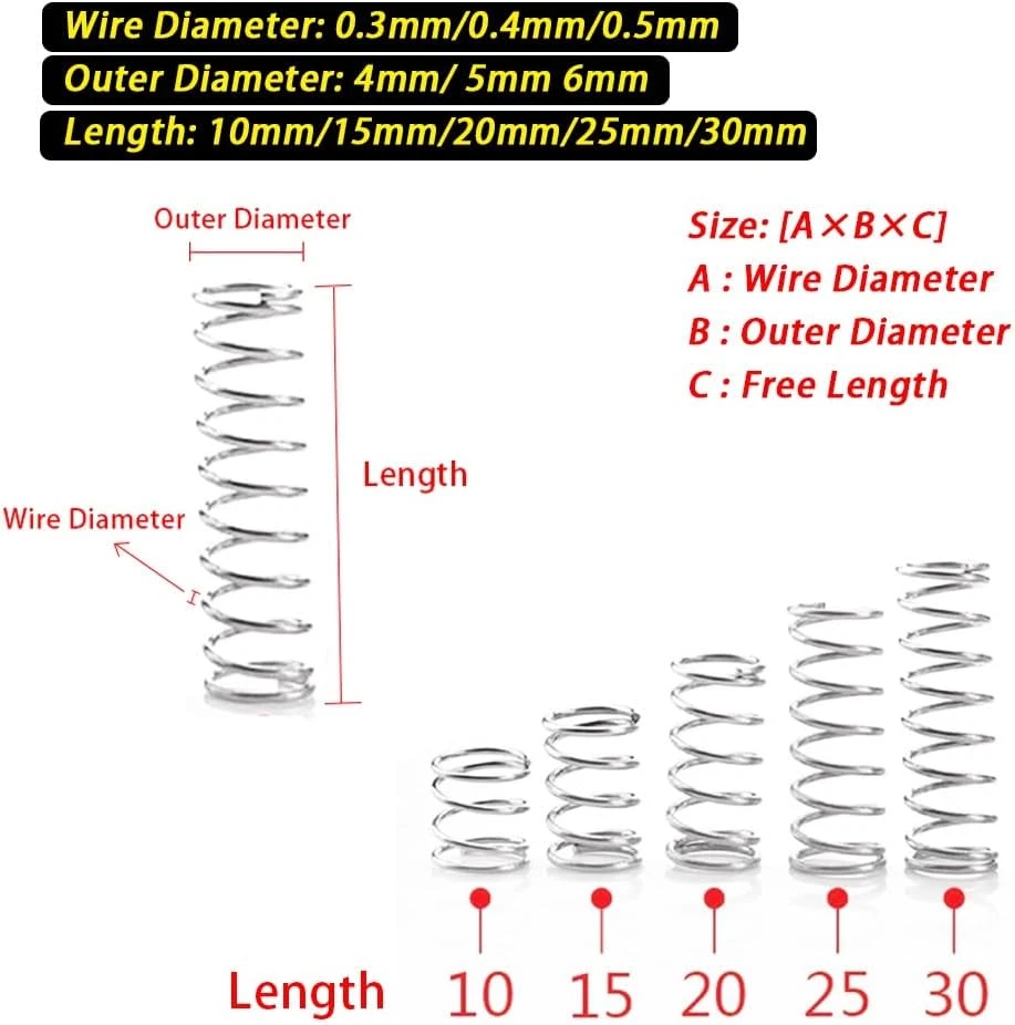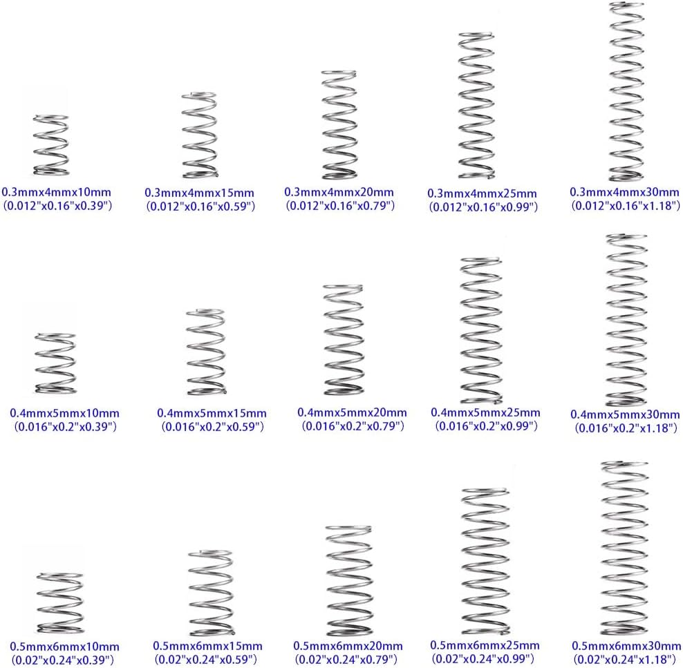 [Anti-rust Material] --Our compression springs are made of 304 Stainless Steel, which is reliable and reusable. It is very resistant to oxidation, corrosion and rust for a long service time. [Package Include] -- 15 different sizes spring assorted in individual compartment, total 450 pieces in box. [Easy to Carry] -- Comes in a transparent box, which is light and small, easy to carry and store. 15 compartment storage with size label marked, you can pick up your target size easily and quickly. [Fit Most Use] -- 15 sizes would be completely enough for all your DIY project and Home repair, such as electrical equipment, 3D printer, piano, pens, toys, scissors, pliers, home tool, etc. [Size: A×B×C] -- A is Wire diameter, B is Outer diameter, C is Free length: [0.012"x0.16"x1.18"]; [0.012"x0.16"x0.99"]; [0.012"x0.16"x0.79"]; [0.012"x0.16"x0.59"]; [0.012"x0.16"x0.39"]; [0.016"x0.2"x1.18"]; [0.016"x0.2"x0.99"]; [0.016"x0.2"x0.79"]; [0.016"x0.2"x0.59"]; [0.016"x0.2"x0.39"]; [0.02"x0.24"x1.18"]; [0.02"x0.24"x0.99"]; [0.02"x0.24"x0.79"]; [0.02"x0.24"x0.59"]; [0.02"x0.24"x0.39"]; [Item] -- 304 Stainless Steel Compression Springs Assortment Kit [Description] -- 15 different sizes, totally 450 springs. [Size] -- Wire diameter * Outer diameter * Free length 0.3mm*4mm*30mm (0.012"x0.16"x1.18") -- 40pcs 0.3mm*4mm*25mm (0.012"x0.16"x0.99") -- 40pcs 0.3mm*4mm*20mm (0.012"x0.16"x0.79") -- 40pcs 0.3mm*4mm*15mm (0.012"x0.16"x0.59") -- 40pcs 0.3mm*4mm*10mm (0.012"x0.16"x0.39") -- 40pcs 0.4mm*5mm*30mm (0.016"x0.2"x1.18") -- 30pcs 0.4mm*5mm*25mm (0.016"x0.2"x0.99") -- 30pcs 0.4mm*5mm*20mm (0.016"x0.2"x0.79") -- 30pcs 0.4mm*5mm*15mm (0.016"x0.2"x0.59") -- 30pcs 0.4mm*5mm*10mm (0.016"x0.2"x0.39") -- 30pcs 0.5mm*6mm*30mm (0.02"x0.24"x1.18") -- 20pcs 0.5mm*6mm*25mm (0.02"x0.24"x0.99") -- 20pcs 0.5mm*6mm*20mm (0.02"x0.24"x0.79") -- 20pcs 0.5mm*6mm*15mm (0.02"x0.24"x0.59") -- 20pcs 0.5mm*6mm*10mm (0.02"x0.24"x0.39") -- 20pcs [Customer Service]- If you need any advice or product support, please contact our excellent customer service team who will happily respond to your question within 24 hours.