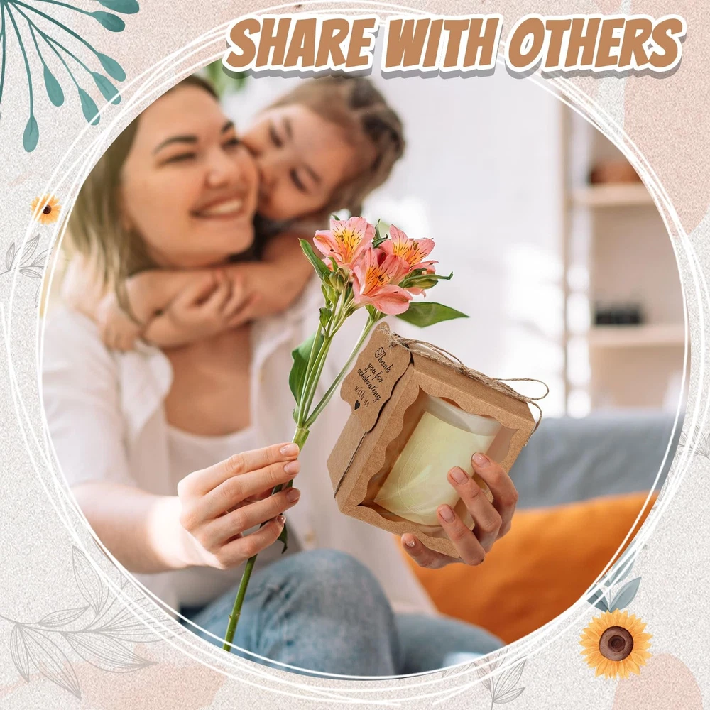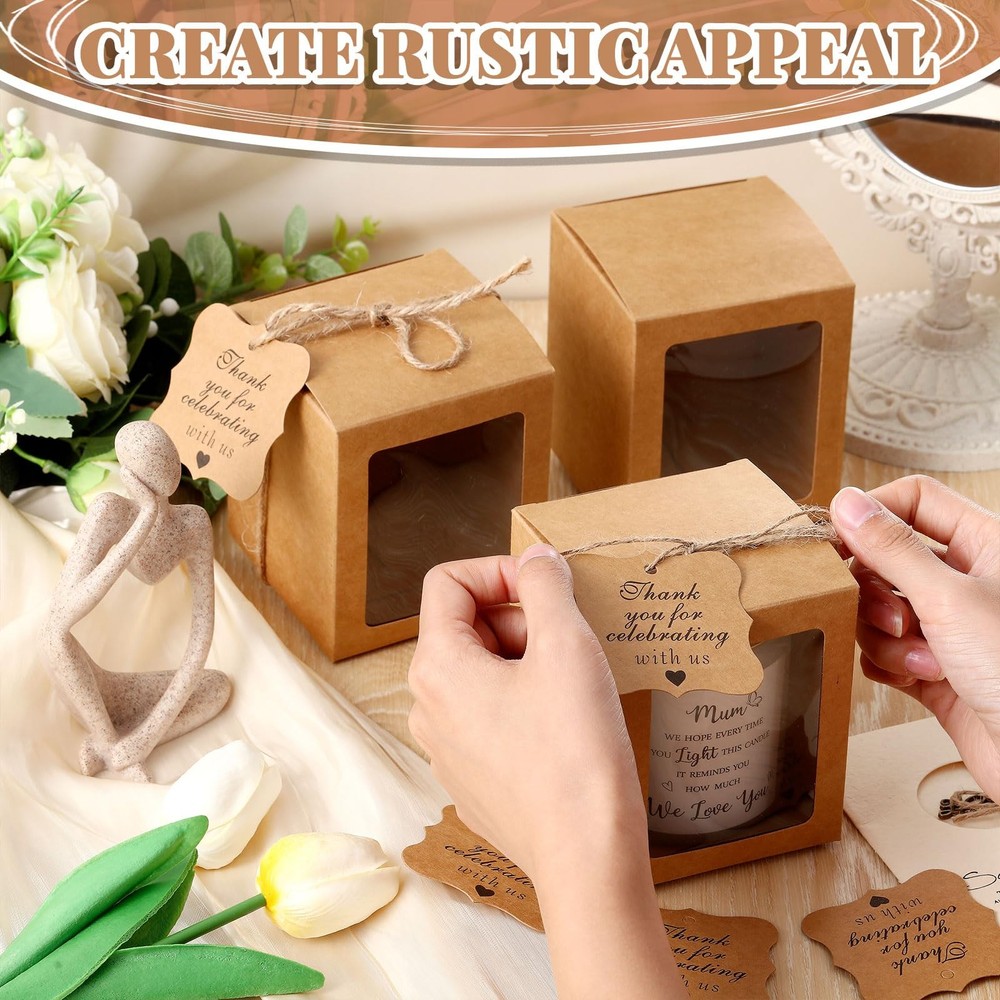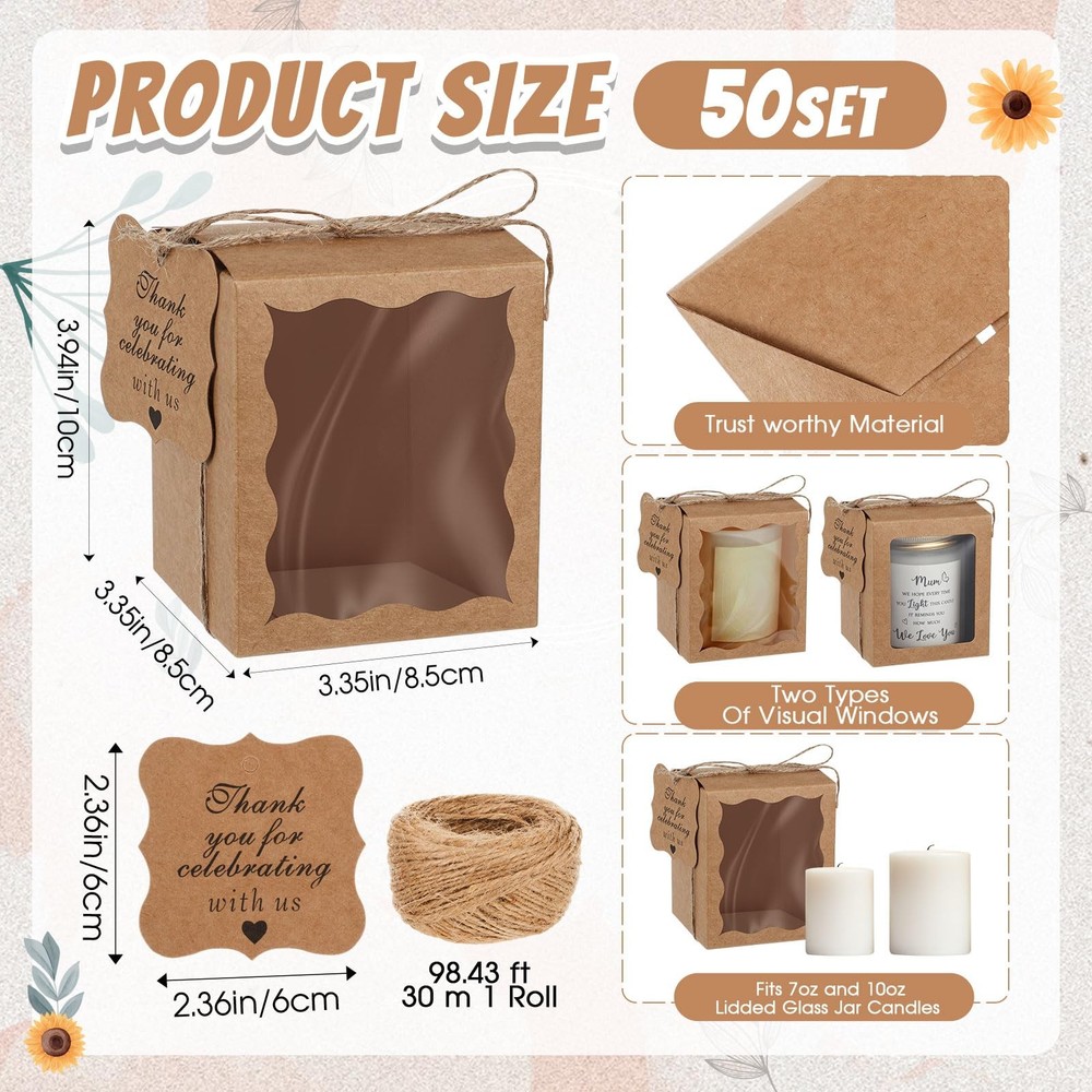 Features: The candle boxes packaging are ideal for DIY enthusiasts or small business owners. Whether it's party favor boxes, ornament boxes for gifts, or candle packaging for a business, these boxes will get you covered. Our candle boxes are made of quality 350g kraft card material, ensuring your candles are securely protected during transport or storage. Paired with a charming paper thank you for celebrating with us tag and a long jute hemp rope, these ornament gift boxes promise a nice feel and quality. Specifications: Material: Gift boxes with clear window: mainly 350g kraft card Thank you for celebrating with us tag: paper Hemp rope: jute Color: mainly kraft Size: Thank you for celebrating with us tag: about 2.36 inches/ 6 cm in side length Gift boxes with clear window: about 3.35 x 3.35 x 3.94 inches/ 8.5 x 8.5 x 10 cm Hemp rope: about 98.43 ft/ 30 m in length Capacity: hold about 10 oz cylindrical candles Package includes: 50 x Gift boxes with clear window 50 x Thank you for celebrating with us tag 1 Bundle hemp rope Notes: Manual measurement, please allow slight errors on size. The color may exist a slight difference due to different screen displays. Winding risk may exist, please keep our product away from children. Convenient Packaging: our package includes 50 gift boxes with clear window, 50 pieces of thank you for celebrating with us tags, and a bundle of hemp rope; This combo pack gives you the convenience of having most of your candle packaging needs in one place Transparent Window Design: our candle packaging boxes are creatively designed with a transparent window on the front to uniquely showcase your candles; This kind of boxes allow your guests to preview the candle's design and color even before opening the box; An excellent choice for candle sellers looking to impress their clients and increase sales( The inside of the box is the same color as the outside Elegant Color and Size: each candle box is mainly crafted in kraft color that complements many events or occasions; The box offers 2 different shapes of transparent windows to display your candle gifts, and it has a sufficient space with a size of about 3.35 x 3.35 x 3.94 inches/ 8.5 x 8.5 x 10 cm, ideal for holding about 10 oz cylindrical candles; In contrast, our thankful for tags catch the eye with a side length of about 2.36 inches/ 6 cm and the hemp rope's length is about 98.43 ft Easy to Assemble: our candle gift box comes in flat and pre folded form, which is not only elegant, but also easy to assemble, making it effortless to prepare for your event or package your products; When not in use, it can be folded into a flat package, taking up no space Ideal for Wide Applications: these gift boxes for ornaments can hold candles for weddings, birthdays, and other special occasions; This nice multipack is the ideal choice for bulk gift boxes that cater to different purposes