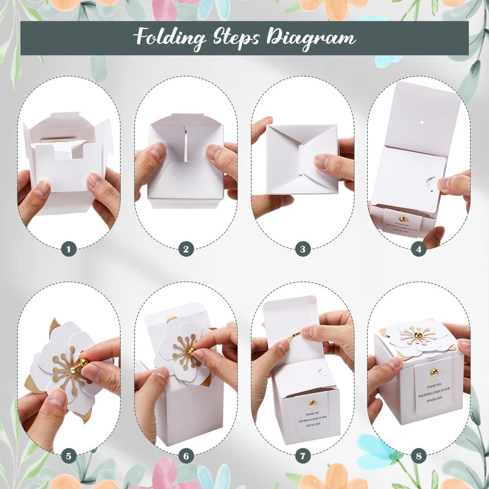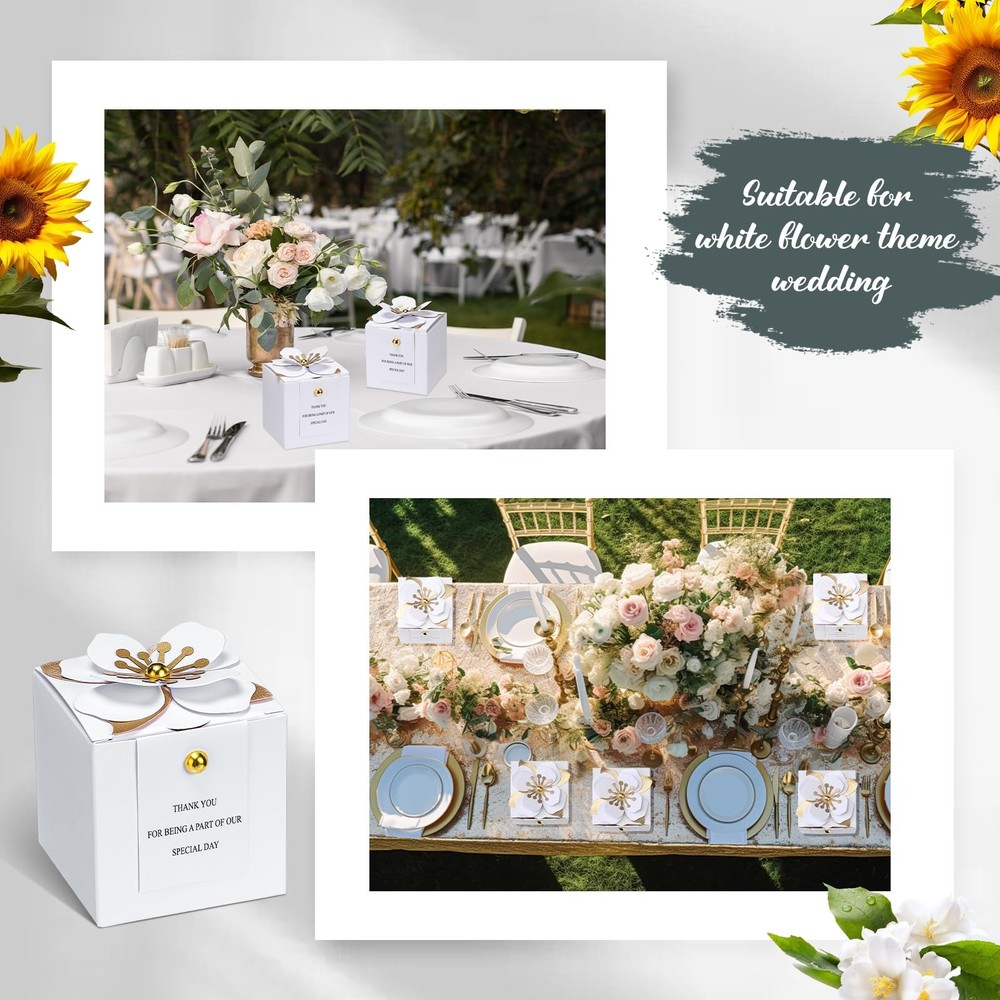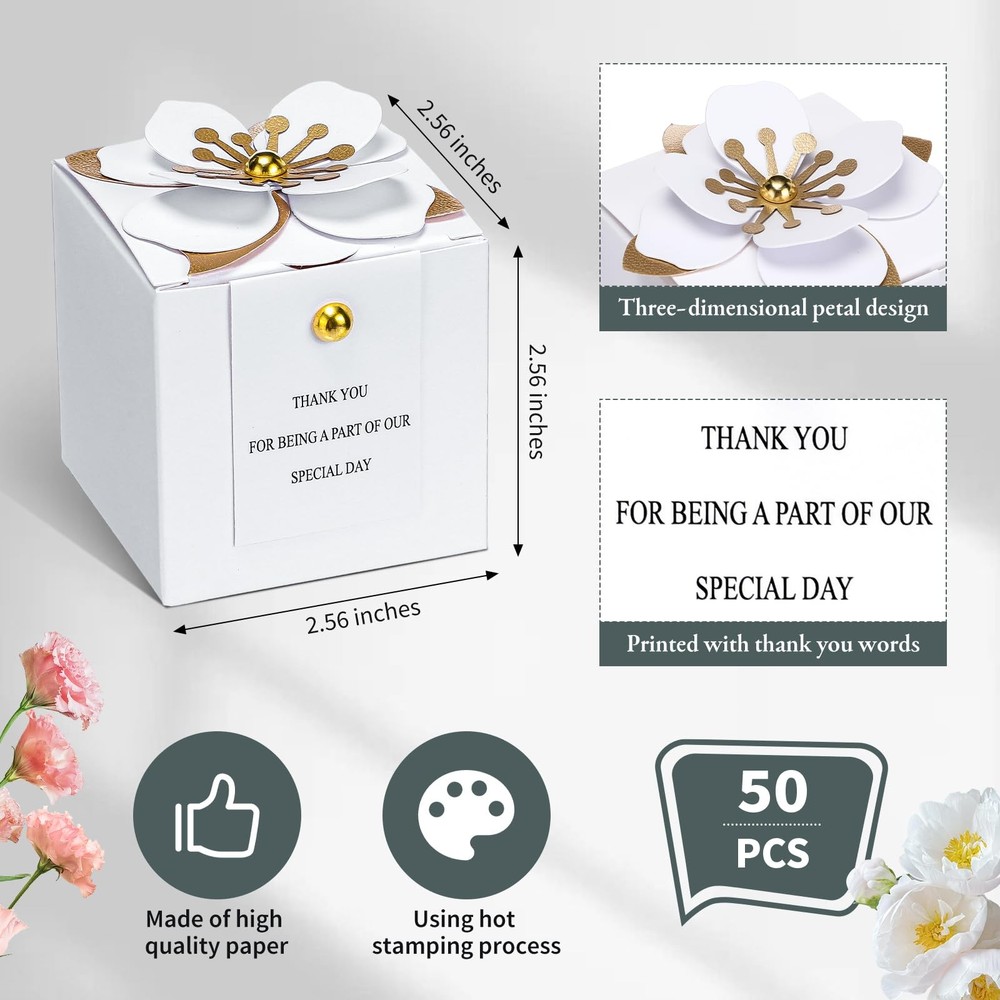 Features: Soak in the magnetic charm of these candy boxes wedding favors. The combination of white and gold exudes a sophisticated charm that catches the eye. They do not only stand as plain boxes but also serve as decorative items that set a celebratory atmosphere at your party. While particularly apt for weddings, the square flower box is versatile enough to be part of almost any celebration. It can fit right in at birthday parties, bridal showers, baby showers, anniversaries, or even as festive holiday gift box. Our wedding gift box is an elegant and utilitarian choice, capable of enhancing your celebration. Specifications: Material: paper Color: white, gold Size: about 2.56 x 2.56 x 2.56 inches/ 6.5 x 6.5 x 6.5 cm Package includes: 50 x Wedding gift boxes Notes: Manual measurement, please allow slight errors on size. The color may exist a slight difference due to different screen displays. A Complete Set for Your Special Day: this package includes 50 wedding boxes for gifts, which ensures you have enough to cater to all your guests; Equipped with this pack, you wouldn't need to worry about running short of gift boxes on your big day; You'll have plenty to go around, and they can meet your needs for parties, weddings, birthdays, anniversaries and more Signature Material and Stylish Design: our candy favor boxes are made with quality paper, a reliable and sturdy material that ensures your precious gifts are well protected; The boxes come in an elegant combination of white and gold colors that add an upscale touch to your event Ideal Size: with a size of approximately 2.56 x 2.56 x 2.56 inches, these bridal shower favor boxes offer adequate room for various treats and souvenirs; Be it Candies, chocolates, cookies, jewelry, or other small items, the boxes can securely accommodate your gift items while maintaining their posh grandeur Blooming with Beauty: each wedding favor box sports a unique flower with white petals and golden stamens on the top, making them even more enchanting; The thank you card can also convey your gratitude towards the gusts; This exquisite detail adds a layer of aesthetic appeal to your event and makes the act of gifting a delightful experience for both you and your guests Effortless Assembly and Versatile: these white party favor boxes aren't just about aesthetics, but also usability; They are convenient and easy to assemble, making your event preparation less of a chore; With these beautiful boxes, you can focus more on the celebration and less on the hassle; Elegant floral gift box will be the ideal choice for your garden theme, classic theme party, wedding, birthday, bridal shower, anniversary or baby shower decoration