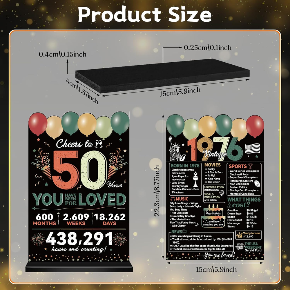 Store New Arrivals Add to Favorite View Feedback Contact Fast deliveries to the customer's home Quality customer service John Make the customers happy! 50Th Birthday Decorations for Men Women, Happy 50Th Birthday Two-Sided Acrylic Table Poster with Stand, Colorful Vintage 1976 Birthday Party Supplies, Cheers to 50 Years Old Table Decor Description [You will Receive] -50th birthday acrylic table decorations, including a elegant 1976 vintage acrylic sign and a black wooden stand, that will bring you a special 50th birthday party experience. [Cheers to 50 Years Old] - Our 50th birthday table decor features an elegant black green design, with the super large numbers "Cheers to 50" and "Vintage 1976" are combined with balloon, fireworks, cake and other patterns, create an unforgettable birthday party for you! [Multi Functional] - Suitable for indoor and outdoor 50th birthday decorations, You can place it on the bedside table in your bedroom, in the living room, in the kitchen, or at the 50th birthday party, to preserve those wonderful memories. [High Quality Materials ]-This fifty year old birthday decorations set is made of sturdy acrylic materials and advanced printing technology, which are durable, and reusable. [Easy to Use] - Insert the base with two holes, just insert the 1976 birthday decoration into the base to decorate your party! Product description Item model number DX06007 Style Vintage Mounting Type Tabletop Color Black Colorful Product Dimensions 12.6"L x 6.7"W Material Acrylic Item Weight 4.2 ounces Shape Rectangular Pre-printed Cheers to 50, Vintage 1976 Recommended Uses For Product indoor, outdoor Included Components Black wooden stand ABOUT US We offer the best prices around on high quality products. Our E-store includes media such as books, movies, music and games while offering electronics, toys, sporting apparel, clothing, tools, general home, garden items and more. SHIPPING We are always working hard to ensure your package arrives as soon as possible. Please understand that some factors like weather, high postal traffic, and the performance of shipping companies are outside of our control. We offer free shipping to the lower 48 states and ship within 2 business days of payment, usually sooner. We do not accept P.O. Boxes. Please provide a physical address. For shipping outside of the continental USA, we only use eBay's Global Shipping Program. The item is shipped to KY and then sent to the rest of the world. International customers are responsible for all duties and taxes. Continue to 'check out' to calculate costs for shipping the item to your country. Messages regarding eBay's Global Shipping Program MUST be directed at eBay EXCLUSIVELY. RETURNS We offer a 30-Day Return Policy on items in which you are not completely satisfied with. You have the option of a full-refund or an exchange of the item. No returns are available on items shipped outside of the USA PAYMENT We accept PayPal. CONTACT US This page content is yet to come Please ad us to your favorite seller and visit again later Thank You CUSTOMER SATISFACTION We try our very best to make sure every customer is completely satisfied. If there's a problem, message us! We're happy to help. WE ACCEPT