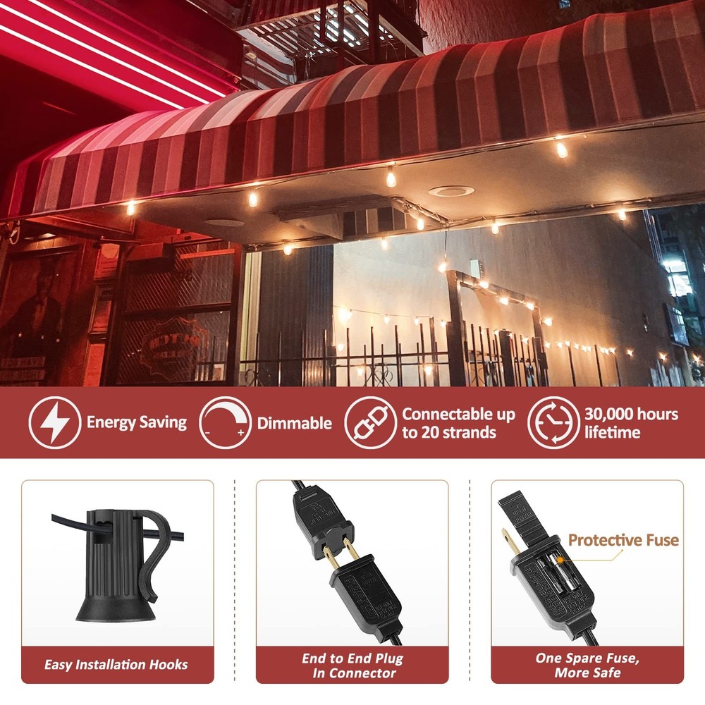 Features Outdoor String Lights create a warm soft ambiance to transform your space A perfect LED Edison string light for bistros, cafes, backyards, Partys, Weddings, etc. occasion Patio lights outdoor Waterproof can be used all year round, windy, rainy and snowy days Specifications Wire Length: 50 feet Socket Type: E12 Socket Quantity: 28PCS Bulbs Quantity: 25+3PCS Bulbs Type: ST38 Watt of bulb: 0.5W per LED bulb Lumen: 60Lm per bulb Volt: AC120V Plug in Color Temperature: 2200K warm white Connectable: Link to Max 30 strands Dimmable: Yes(Dimmer NOT included) Package Included 1 x 50FT 25 Sockets Cable 1 x 25 Clear Plastic Bulbs + 3 Spare Bulb 1 x Spare Fuse 1 x User Manual Warm Tips 1.These light strands are connected in parallel, so one bulb goes out will not affect others Lighting. 2.Each set comes with a spare fuse in the male plug, you could replace the fuse when all the strands are not working. 3.If you have any problems, please don't hesitae to CONTACT us (the seller) in time. 【Waterproof Edison Outdoor String Lights】Edison string lights outdoor set with lightweight wire, IP44 waterproof rating, confidently leave lights on display year round. Edison soft warm string lights create a vintage effect, antique ambiance and romantic atmosphere. Great ideal use for yard, deck, gazebo, pergola, fence, cafe, restaurant, canopy, umbrella, Bistro lights, or anywhere you need ambient. 【Energy-Saving and Dimmable Long String Lights】: 50FT String Lights come with 25+3pcs high efficiency 0.5W ST38 edison vintage style LED filament bulbs, which can dramatically reduce electricity bills compared with incandescent bulbs. LED outdoor string lights are compatible with most dimmer at the market.(Tips:Dimmer not included) 【Shatterproof ST38 Bistro Lights Outdoor】ST38 Edison bulbs are made of clean Plastic, shatterproof outdoor string lights are safety when touch even if drop down or blow away by the wind, bistro lights outdoor will not easily break if dropped, more safer and durable than traditional glass bulbs. Edison outdoor string lights have a longer lifespan 15,000 hours. 【Easy Installation and Connectable Patio Lights】: outdoor string Lights 50ft with 5.74ft leading wire, 25pcs E12 Sockets and spaced 1.8ft apar. Patio lights can be connected up to Max 30 strands via end to end plugs, they could lights yours whole patio space. Each socket includes a hanging hook design allows for hang up and installation anywhere. Widely use for wedding, party, Christmas and many other occasions or events. 【Customer Satisfaction with Outdoor String Lights】: Your satisfaction is our first priority, confident 2 years warranty for ST38 Edison string lights. Any your concern will be responsed in 8 hours.