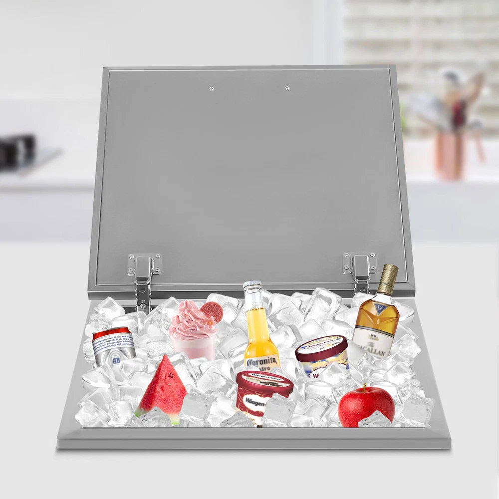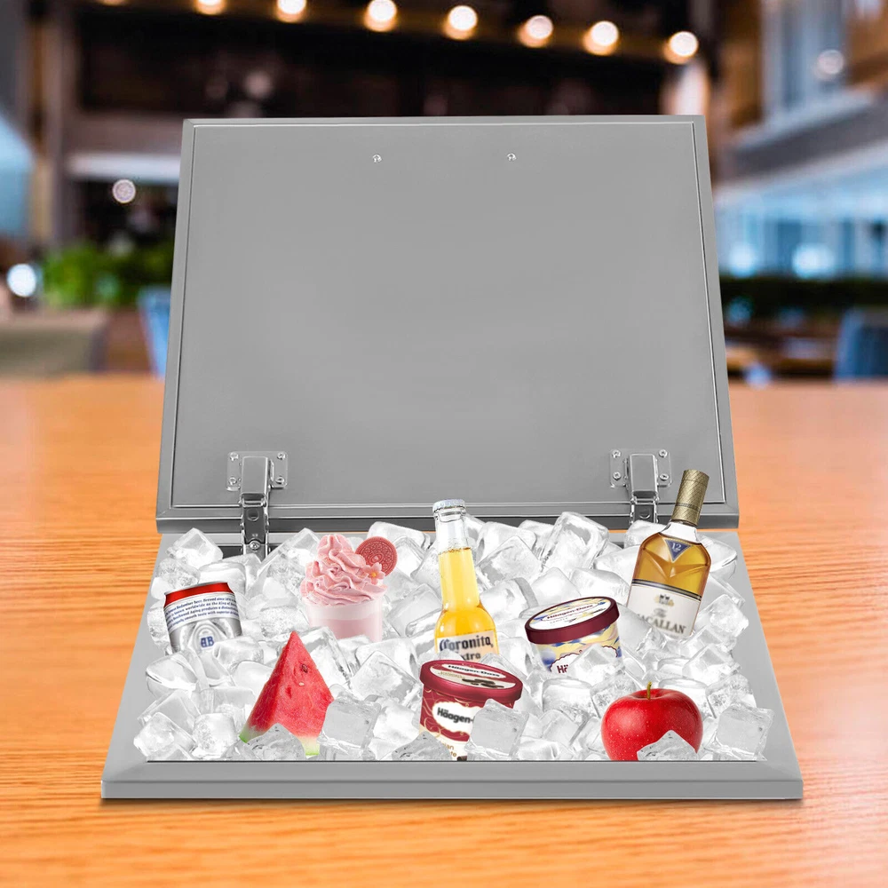 Details Ergonomic Handle: The handle on the lid is curved and ergonomic with a smooth surface, which makes it easy for you to open or close the lid and can prevent scratching your hands. Lid: The lid makes the product well sealed to allow for a better insulation effect and prevent the internal ice or drinks from being contaminated. Meanwhile, the two hinges make it easy for you to open and close the lid. Application It is widely used in dinner parties, parties, bars, kitchens, offices, etc. for keeping wine, beer, whiskey, beer, cocktails, vodka, juice, and frozen food fresh. 50L Stainless Steel Drop-in Ice Chest Commercial Ice Bin Sink Bar Ice Bucket Description It's a great pleasure to have an iced drink in the hot summer. But traditionally electric refrigerator isn't available everywhere. This drop-in ice chest with a large capacity (50L/52.8Qt) is your ideal choice for outdoor activities. Made of high-quality stainless steel, it is strong, durable, and not easy to rust. The excellent insulation performance can bring you cold drinks for a long time. It will be a great addition to your outdoor party. Key Features Premium Material: This product is made of food-grade 304 stainless steel, which is odorless, harmless, anti-rust, strong, durable, and not easy to deform. Excellent Performance: The double-walled design, built-in thickened foam, and lid can effectively prevent cold air from escaping and keep your ice solidified to keep your drinks cool for a long time. Large Capacity: It has a large capacity of 50L/52.8Qt to easily store and cool large quantities of ice, drinks, or frozen foods to meet your home and commercial needs. Saving Space: With a drop-in design, it will not take up too much space in the kitchen, especially suitable for small kitchens. Quick Drainage: With a drain hole at the bottom, a drain plug, and an extended water drainage hose, it can quickly drain water. As a result, it also can be used as an outdoor sink and is suitable for an outdoor kitchen, party, resort, bar, etc. Easy Assembly: This product is simple in structure and complete in the package. You only need a few simple steps to install it, which is very time-saving and labor-saving. Outdoor Available: You can take it to outdoor places, bringing cold drinks to your party without the need for an electric refrigerator to create happy memories. Easy to Clean: The stainless steel surface is smooth and flat without grooves to hide dirt, making it easy to clean. You can directly rinse it with water and dry it. Customer Service: We aim to provide quality products and services. If you have any problems, please feel free to contact us. We will reply and solve the problem for you as soon as possible. Details Ergonomic Handle: The handle on the lid is curved and ergonomic with a smooth surface, which makes it easy for you to open or close the lid and can prevent scratching your hands. Lid: The lid makes the product well sealed to allow for a better insulation effect and prevent the internal ice or drinks from being contaminated. Meanwhile, the two hinges make it easy for you to open and close the lid. Application It is widely used in dinner parties, parties, bars, kitchens, offices, etc. for keeping wine, beer, whiskey, beer, cocktails, vodka, juice, and frozen food fresh. Specifications Color: Silver Material: 304 Stainless Steel Shape: Rectangular Capacity: 50L/52.8Qt Insulation Temperature Range: -5℃-91℃/23℉-194℉ Foam Insulation Layer Thickness: 2cm/0.78in Net Weight: 11kg/24.25lbs Gross Weight: 12kg/26.5lbs Package Size: 55*55*39cm/21.7*21.7*15.4inch Product Size: 50.5*50.5*33cm/20*20*13inch Water Drainage Hose Length: 1m/3.2ft Package Included 1* Drop-in Ice Chest 1* Lid 1* Handle 1* Water Drainage Hose 1* Filter Basket Other Accessories for Assembly Notes Please allow the slight color difference caused by the shooting light and 1-3cm error due to manual measurement, and make sure you do not mind before you order. Payment Delivery details Terms of sales About us Contact us Payment We accept ebay payment 。 Fees such as import duties, taxes are not included in the item price or shipping costs. These charges are the buyer's responsibility. Delivery details Shipping: 2-9 working days to: USA Terms of sales We maintain high standards of excellence and strive for hundred percent customer satisfaction. Feedback is very important to us. We hope that you contact us immediately before you give neutral or negative feedback, so that we can address your concerns. It is impossible to address issues if we do not know about them! About us Your satis faction is our ultimate goal. We work hard to earn your trust and future business. Our certified technicians have tested each item before shipping. The unit comes with 1 year limited warranty on all manufacturing defects. a) If you receive a defective item, you may return it or ask for a discount. Please contact us within 14 days after you receive the package. b) What you returned must be intact and in its original packaging as re? u. Customer is responsible for shipping costs of the returned item. c) We will cover the cost of shipping back t with the shipping rate indicated in the registration page. We will send you a new unit or refund the full payment you paid. Thank you. Contact us Business Hour Business Hour: Monday To Friday: 8:30 AM to 5:00 PM (Beijing China time) Due to time zones, our reply to your questions may not be immediately. But within above working time, we will reply your email within 24 hours. If it's non-workdays, please kindly be patient and wait till Monday. Please contact us with ebay message. Please feel free to contact us if you have any questions. Monday To Friday: 8:30 AM to 5:00 PM (Beijing China time) Due to time zones, our reply to your questions may not be immediately. But within above working time, we will reply your email within 24 hours. If it's non-workdays, please kindly be patient and wait till Monday. Please contact us with ebay message. 