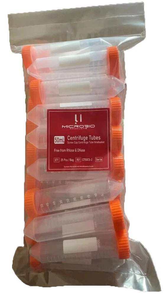 This limited time offer includes sterile 50mL centrifuge tubes from MicroBio Products, made of durable polypropylene material and designed with a screw cap for secure closure. The tubes come in a Case of 500 (25 pieces per bag), making them ideal for use in microbiological, medical, and biological laboratories. The units are suitable for a variety of applications, including centrifugation, filtration, and sample storage. They are compatible with different unit types and volumes, making them a versatile addition to any laboratory or clinic. This item is perfect for those in need of reliable and high-quality laboratory supplies.