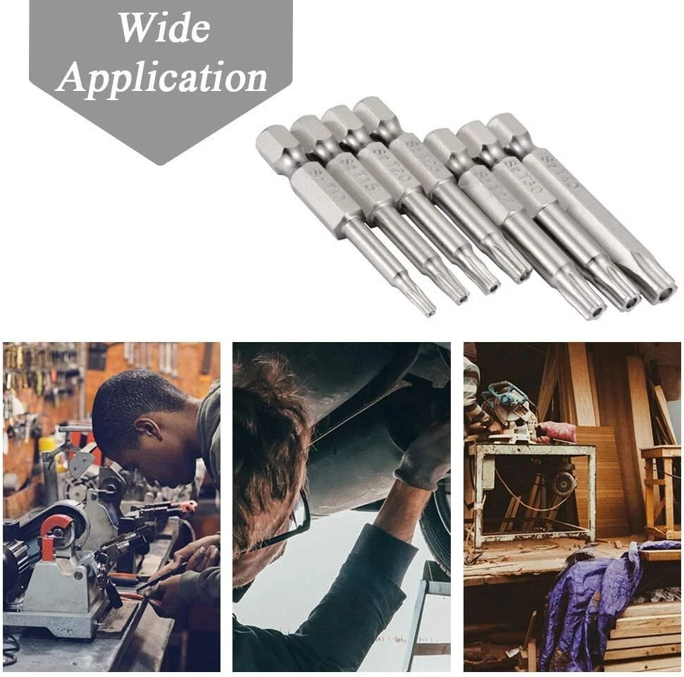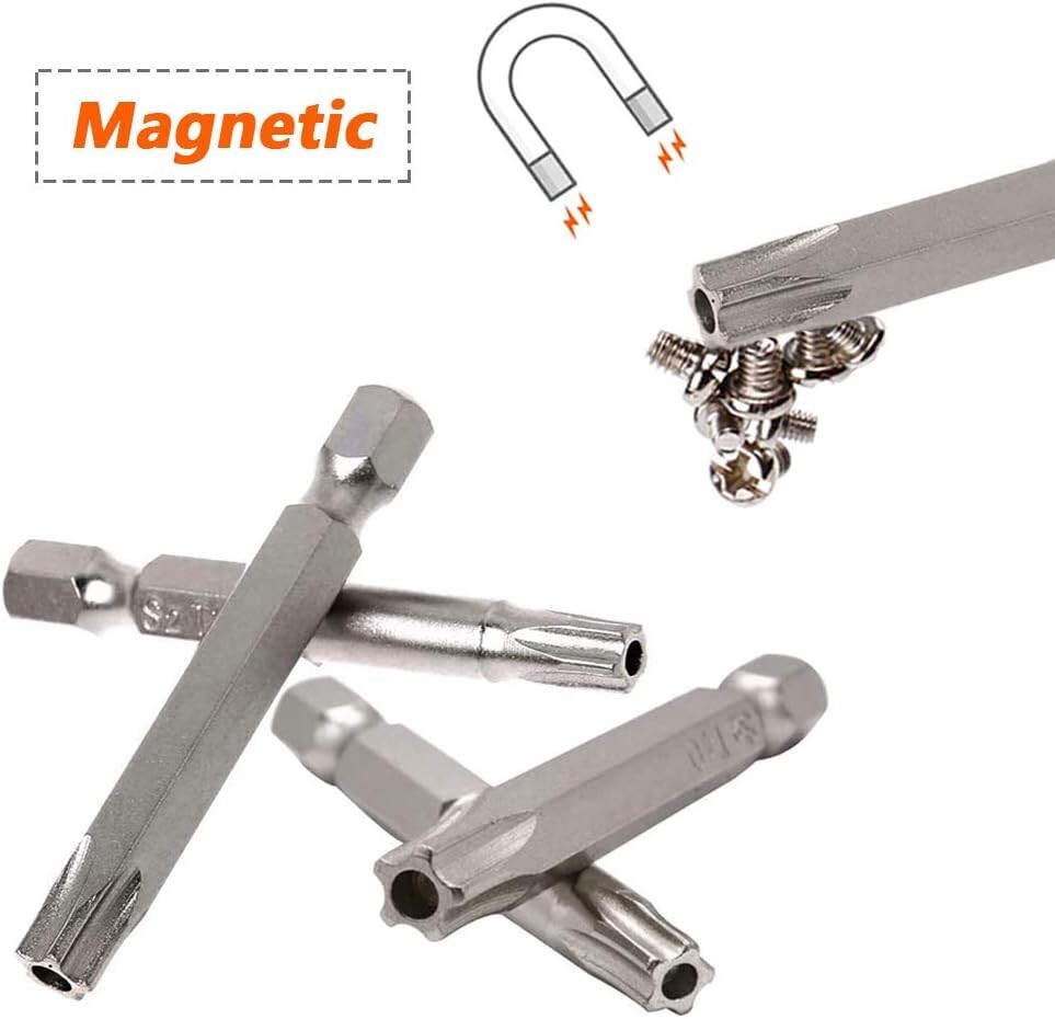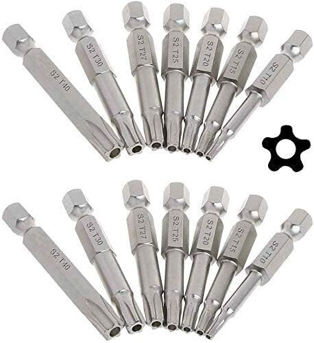 2 Sets of star screwdriver bits in 7 different size(7 pieces each set) can meet your various needs Type of Head: Torx Star 5 Point; 7 Size: T10, T15,T20, T25, T27,T30, T40; Overall Length: 50mm/ 2 inch Made of high quality S2 steel for durability, ideal tool for repairing household appliances, precision instruments, furniture Strong Magnetic & Exquisite workmanship, each edge can be accurately locked screws, easy to suck the screws, no damage to the screw 5-Pointed Torx Screwdriver Bits with 1/4-Inch Hex Shank, suitable for electric screwdrivers, hand screwdrivers, electric drills, air drills and so on
