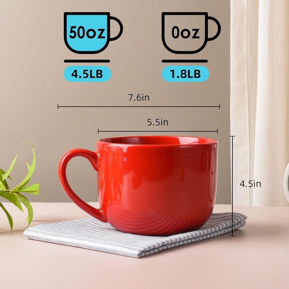 About this item 50 ounces wide jumbo-sized mugs with large handles made of premium ceramic are more durable than ordinary porcelain mugs. It can be cleaned in the dishwasher and microwaved due to its high-quality ceramic. This White wide mug set is deep and large enough to use in the microwave to prepare hot cereals or oatmeal WITHOUT overflowing. Meet all of your requirements. This White wide mug set is deep and large enough to use in the microwave to prepare hot cereals or oatmeal WITHOUT overflowing. Meet all of your requirements. Dishwasher, microwave safe, healthy - Microwave safe, dishwasher safe, freezer safe, and oven safe up to 500°F. Coffee mug holds up to 50ounces of your favorite drink.Good for daily use in all settings, such as home, office, outdoor and more. Each cup holds up to coffee, milk, tea or hot chocolate. This 50oz large ceramic soup mug with handles is perfect for enjoying coffee, tea, ice cream, or cereal. The solid red color and modern design make it suitable for all occasions. Made in the United States, this soup mug is microwave safe and includes a set of 2. With a capacity of 50oz and dimensions of 5 inches in height and 4 inches in width, this mug is both stylish and practical for your kitchen or dining needs.