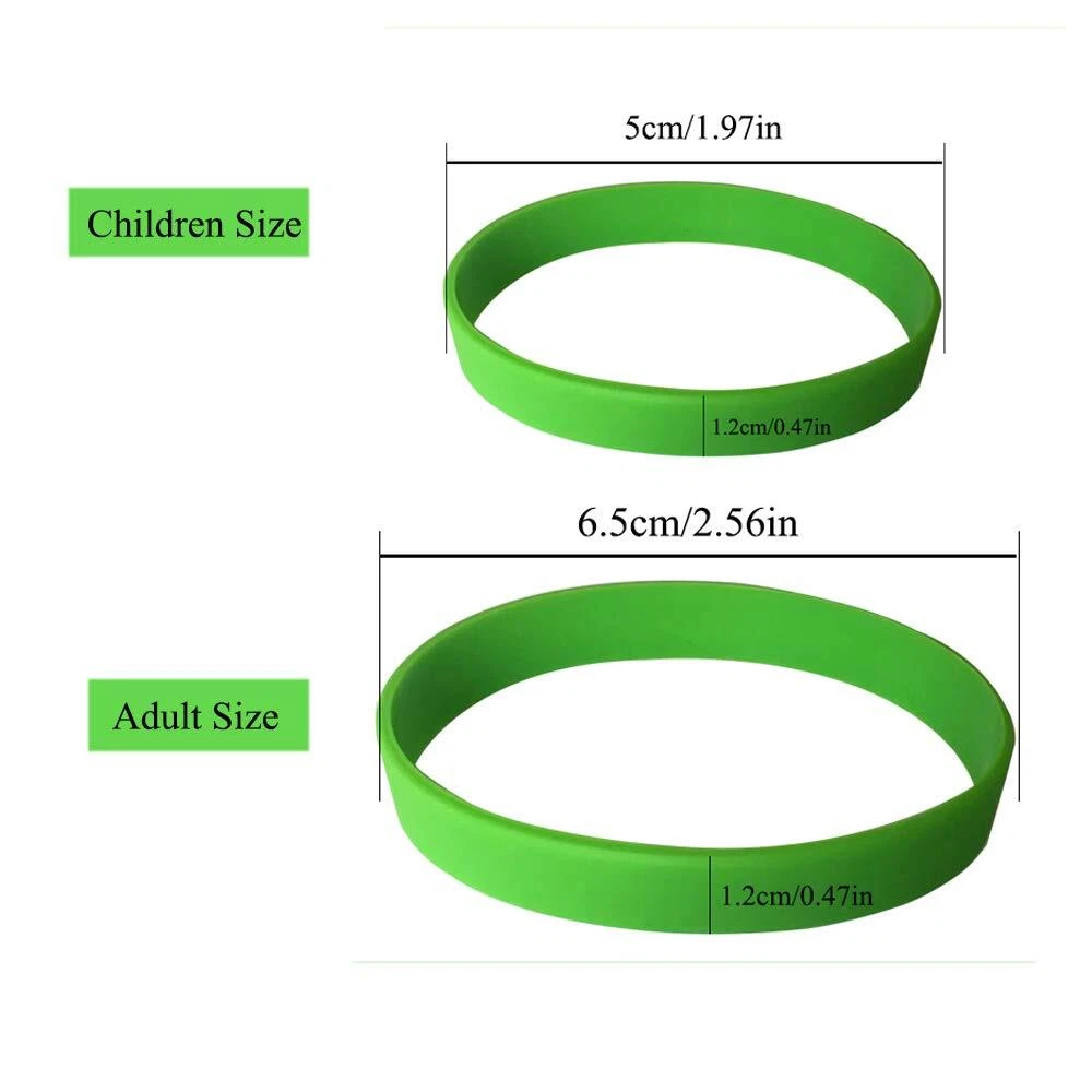 Description Specification: Package includes: 50pcs silicone wristbands Material: Eco-friendly silicone (elastic) Color: black, white, red, purple, pink, blue, green, orange and yellow Size Approx.: Children Size:160 circumference x12width x2 thickness (mm)/6.3 in’ Adult Size:202 circumference x12width x2 thickness (mm)/8 in’ Note: *Fully Customized Silicone Wristbands are also available. You can design the wristbands with a logo, phrase, internet address, number or any specific need you wish to promote, thus helping your group meet their needs and goals. For more information, please or us. If for any reason you are unsatisfied with any product, please do not hesitate to us. We will do our very best to solve your problem. *Colors shown in pictures may slightly differ from actual product due to lighting and color settings. Soft to touch & comfortable to wear, easy to take off and on. One package includes 100 pieces silicone wristbands. Various colors for choice; you can choose the best color to match your outfits and the theme of any occasions perfectly. Meterial: Eco-friendly silicone (elastic), Latex and Toxin Free - Hyperallergenic. Select from a Variety of Colors - Available in Adult and Children Sizes. --- Children & Adult size.Children Size:160 circumference x12width x2 thickness (mm) Adult Size:202 circumference x12width x2 thickness (mm) Silicone Wristband used for various casino, playground, can use as gift, souvenirs, promotional materials, etc.
