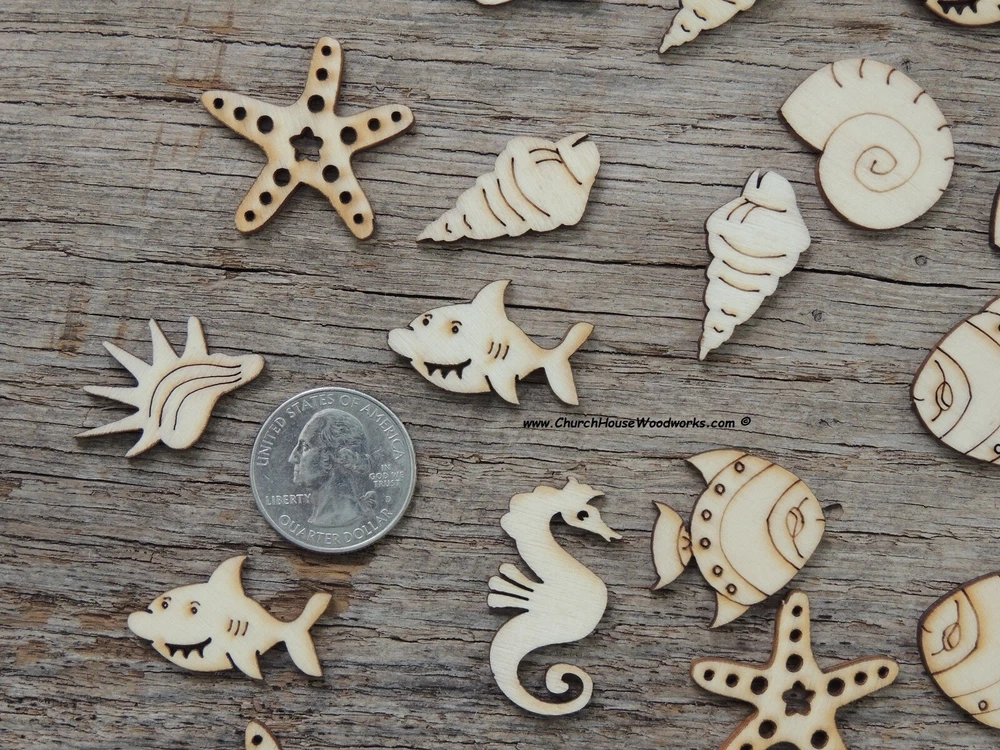 - 50 Small Wood Under the Sea wood piece mix. (Please see photo of them next to a quarter for size reference.) - A mix of common marine sea life including a random assortment contain star fish, seahorse, shark, fish, conch shell, sea shells. - Dimensions are approx 1 inch on average although they do vary slightly from design to design and are approx 1/8 inch thick. Wood is light on both sides. - Perfect for scattering around as table decorations, or to use in invitations, parties, crafts, and so much more. - These would make a great addition to any wedding, bridal shower, wedding reception, or engagement announcement Customer service is our top priority! Before making a purchase, please carefully read the description to ensure that this is the product you want. If you have any questions about this product, please contact us through eBay before placing an order. All products are in stock at the time of listing; However, if your order cannot be fulfilled through any of our warehouses, we will notify you as soon as possible and issue a refund. Thank you for shopping with us. We welcome your patronage!