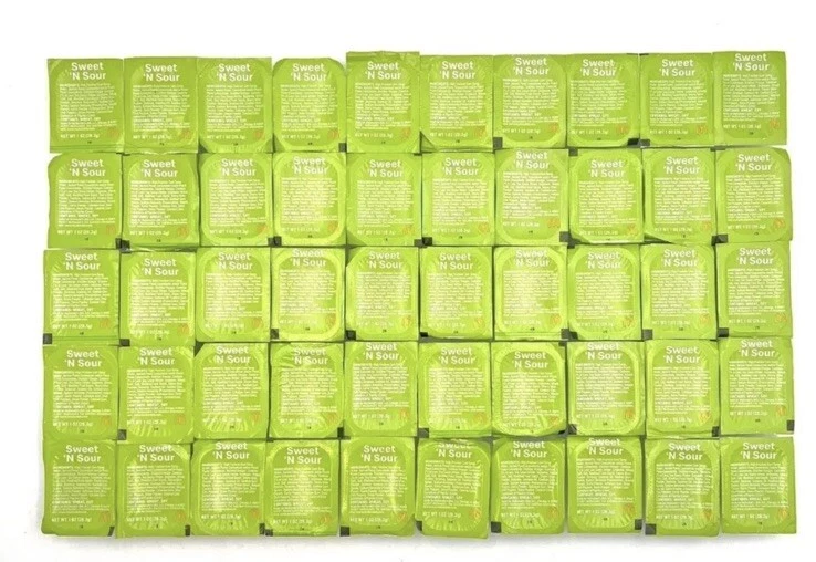 Enhance your dining experience with this pack of 50 McDonald's Sweet N' And Sour Sauce Dipping Chicken Nugget Sauce. Made with the perfect blend of sweet and sour flavors, this dipping sauce is perfect for any occasion. Whether you're having a snack or entertaining guests, you can't go wrong with this delicious sauce. With its iconic brand name, McDonald's, this sauce is a must-have for any fan of the fast-food chain. It belongs to the pantry food aisle and is categorized as a condiment and sauce. So, whether you're buying it for home use or as a gift, this sweet and sour dipping sauce is sure to impress.