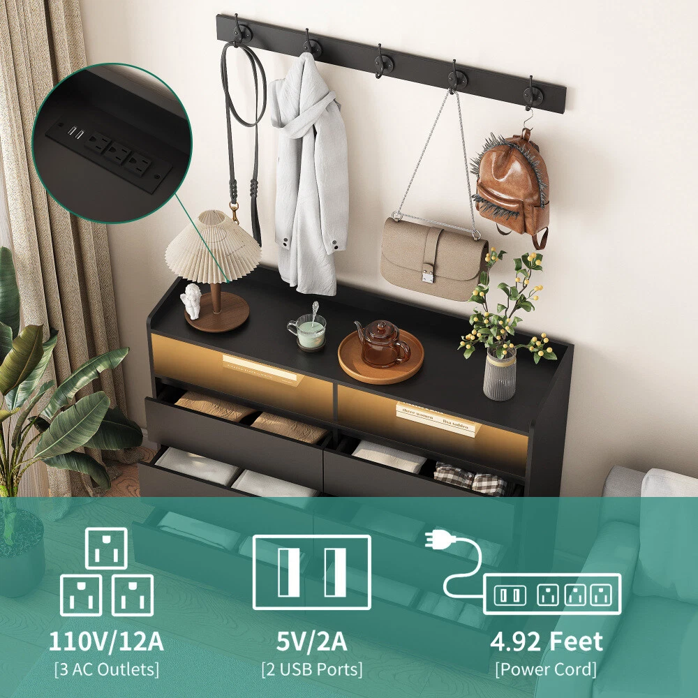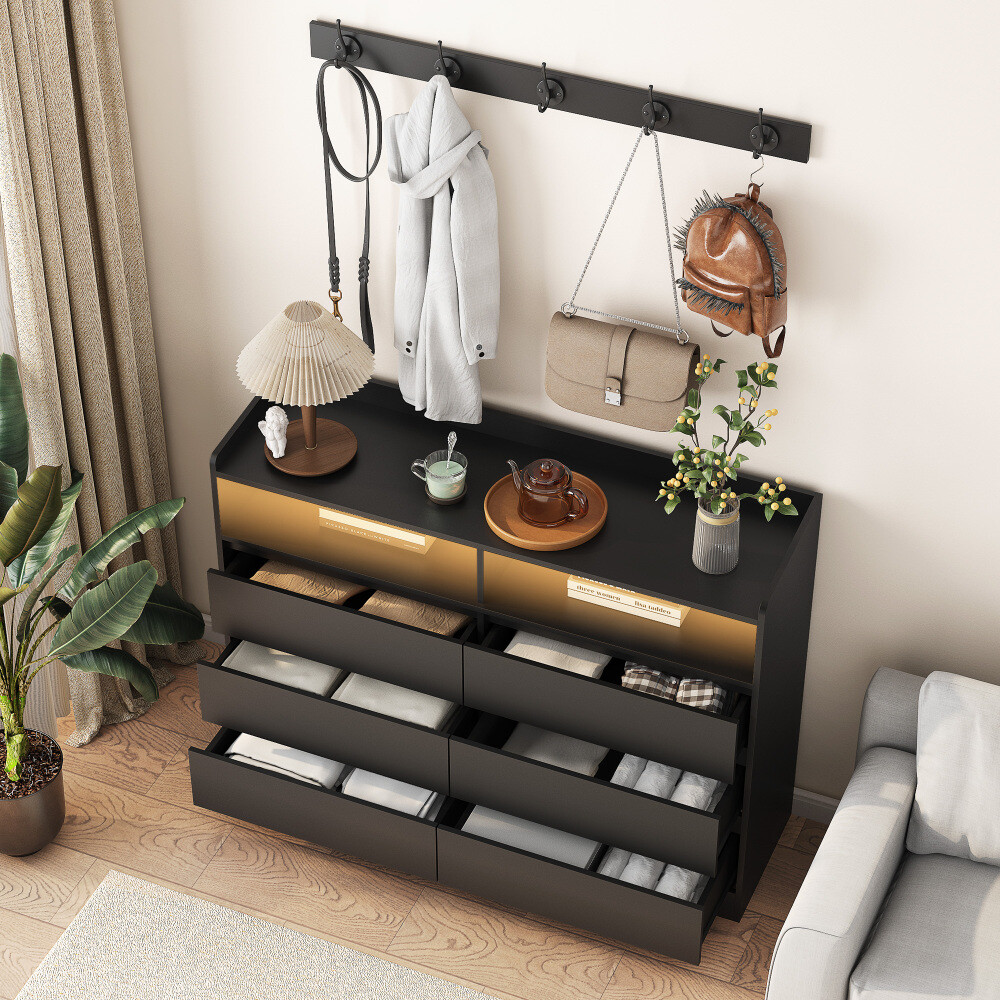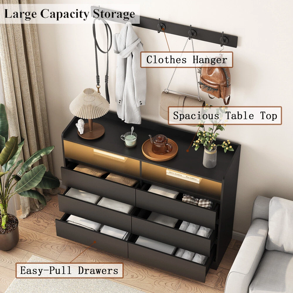 Product Dimensions (inches): W51.18*D15.75*H38.39 Weight: 115.06lbs 15mm E1 grade particleboard + back panel 3mm MDF. Storage is powerful, with six drawers providing ample storage space for books, multimedia devices and other items. This product comes with a storage compartment and a variety of color changing light strip . Simple style can add practicality and decoration to your home. Install anti-tipping device before use to avoid injury to children. Follow the instructions to complete the installation quickly. If you encounter any problems during the installation process, you can find us at any time, and we will provide you with the most satisfactory solution.