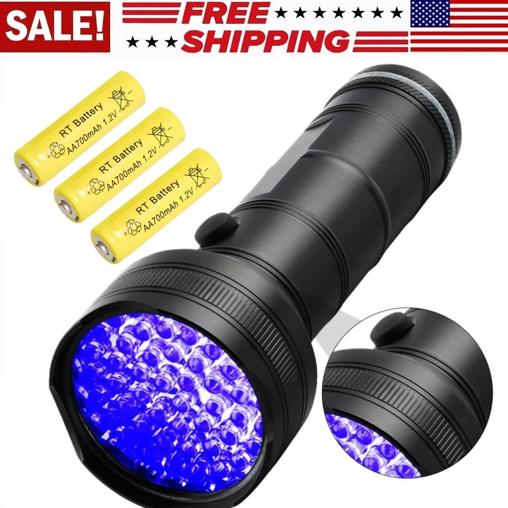 51 UV LED Ultra Violet Detector Lamp Inspection Blacklight 395 nM Flashlight AA Features: 1. Use 3 AA Standard Alkaline Battery (Included) , Rechargeable batteries are not recommended (Size and Voltage is not compatible)! 2. Ensuring that you have a sufficient quantity for your needs; Ideal to stock up or ideal as a gift for your loved ones, especially for those who enjoy outdoor pursuits or need a UV light for both personal and professional use. 3. Broad Coverage : emitting a strong light with a wavelength of 395 nm, larger area than 9, 21 LED lights. the UV resin flashlight can cover a large area without reduction in the intensity of light; Whether you are scanning for pet stains or exploring the natural world in darker places, you can rely on this flashlight to do the job right. 4. Material and Construction : made mainly with an aluminum alloy, the UV flashlight for resin is sturdy; The surface bears a wear resistant, non slip texture grip that is waterproof and dust resistant to ensure that it lasts longer; It's crafted in a black color, and its compact size of about 5.66 x 2.22 x 1.37 inches, to adds to its usefulness. 5. Portable and Convenient : the blacklight for cat urine detection is designed to fit easily into a pocket and comes with a wristband for secure and comfortable carrying; Being lightweight, it can also be stored safely in a bag or backpack, offering you convenience on the go. 6. Multipurpose UV Flashlight : this UV flashlight is not only a pet cleaning tool for detecting pet urine stains on rugs, carpets, and clothes, but it also serves as a black light detector for scorpions, minerals, bugs, stains and fake currency; Suitable for outdoor use and serves as a nice tool for identifying currency, ID cards and more. 7. Tips: the 51 UV light LEDs have a lifespan of 15 years,To extend the flashlight’s life, please remove all batteries if you did not intend to use it for a long time. 8. Improper use or installation of poor quality batteries may cause product hazards that can affect our safety. We recommend the use of reliable high quality Alkaline batteries. Use of rechargeable or other non-recommended batteries VOIDS the manufacturer warranties. Specification: Color: Black Material: Aluminum with O rings for water resistance Size: 5.7 cm x 14.5 cm (DxH) 5.66" inches long & 2.22" inches across lamp Bulb Type: 395-400nm Bulb Life: 100,000 Hours Power Output: 5W Battery Required: 3 x AA Alkaline Battery Ni-MH 1.2V (Included). Battery Life: Approximately 20 hours on 3 AA batteries Switch Type: Click on / Click off Package include: 1 X UV Ultraviolet LED Flashlight Blacklight 3 X 1.2V AA Ni-MH Rechargeable Batteries On Feb 10, 2025 at 03:02:43 PST, seller added the following information: