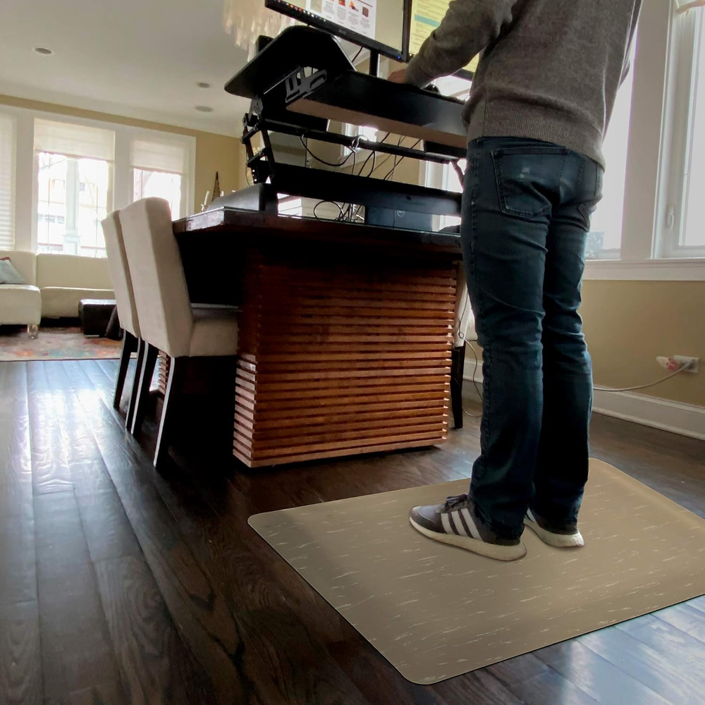 This mat is a game-changer for long hours on your feet! The cushioned vinyl feels amazing, and the marble pattern looks sleek in any space. Super easy to clean, and the beveled edges prevent trips—super thoughtful design. Super sturdy and stays put, perfect for kitchens, garages, or workspaces. Worth every penny!