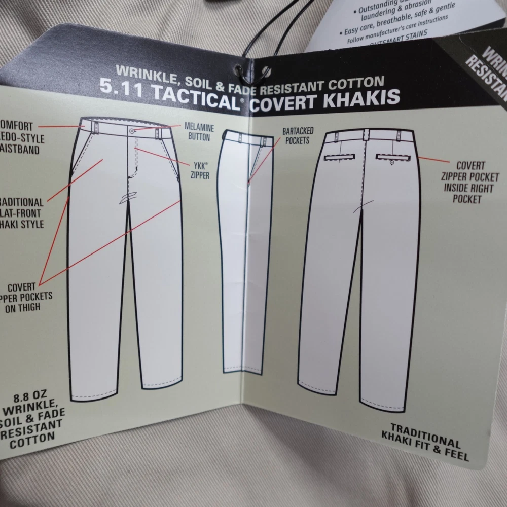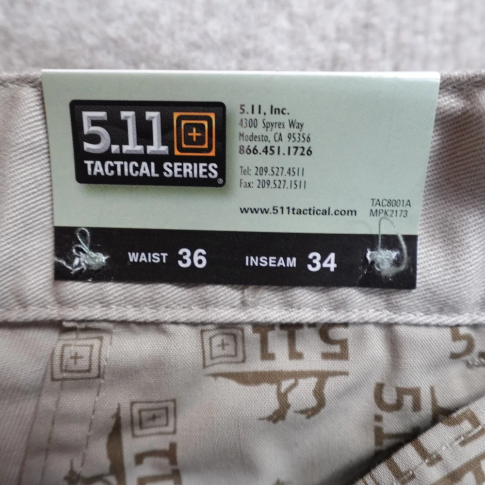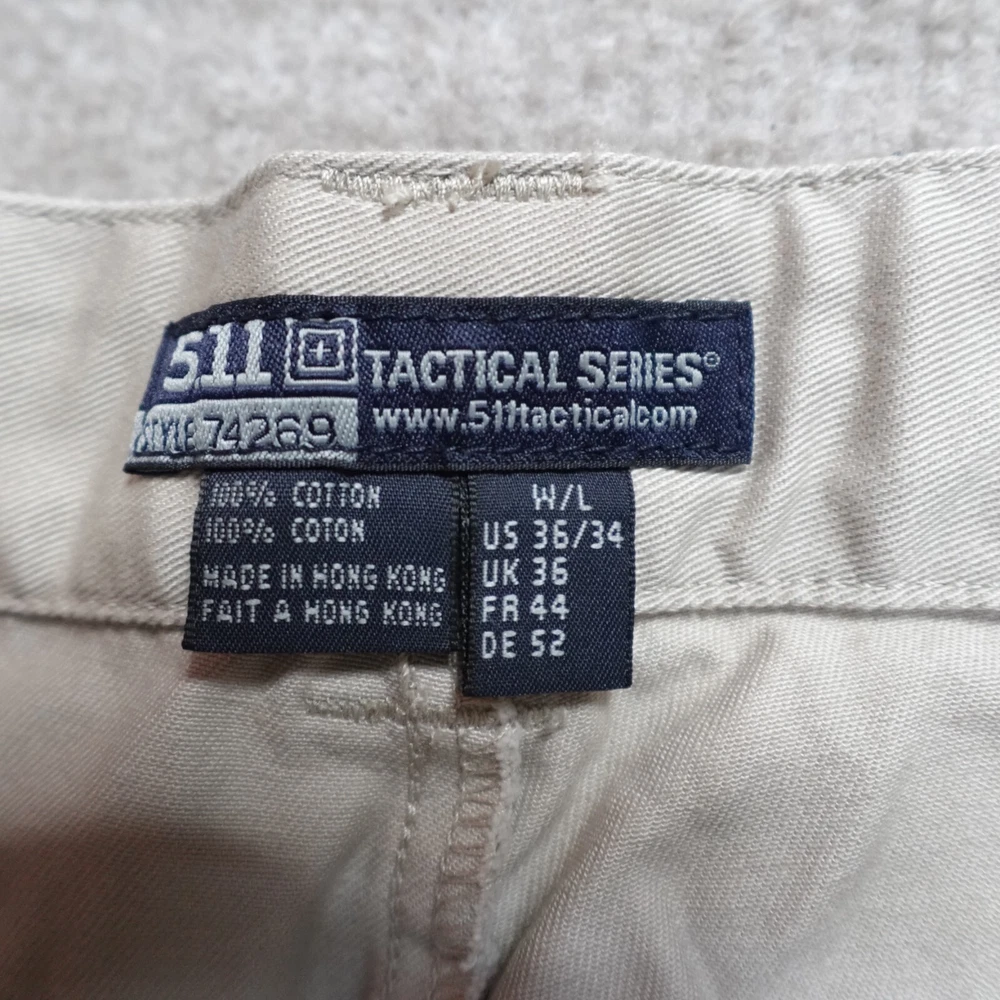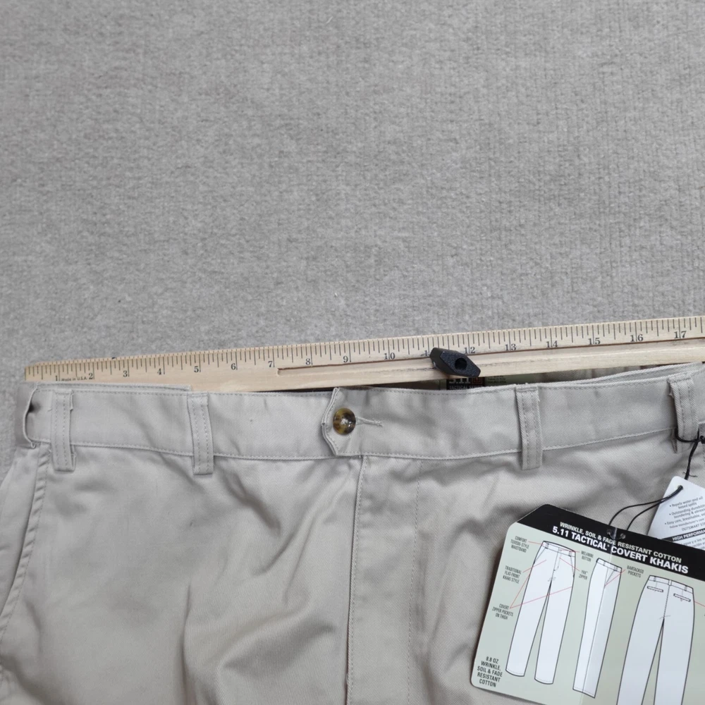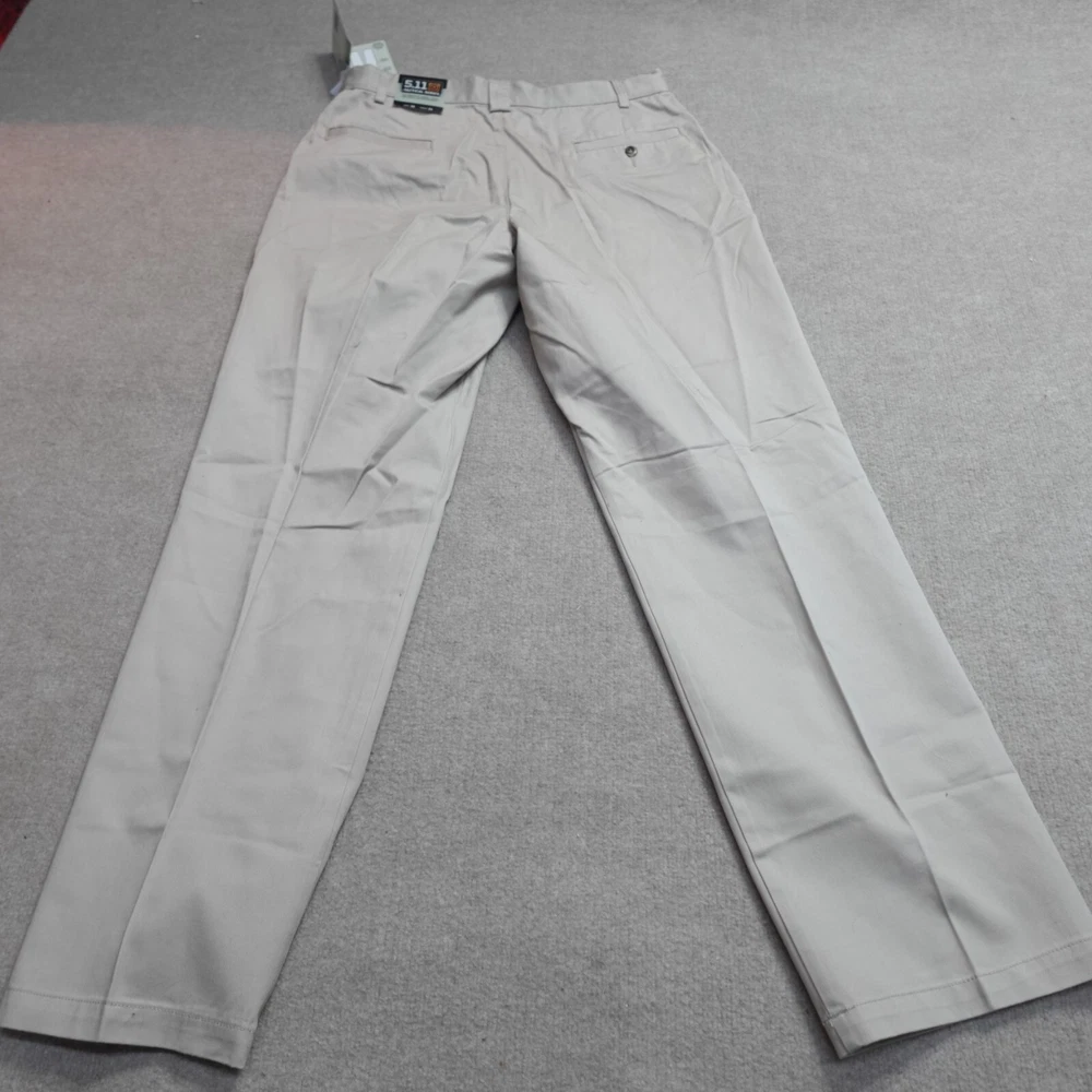 Inseam: 33 in Color: Beige Style: Khakis Brand: 5.11 Tactical Material: Cotton Blend Department: Men Size Type: Regular Pattern: Solid Leg Style: Straight Closure: Button, Zip Type: Pants Front Type: Flat Front Size: 34