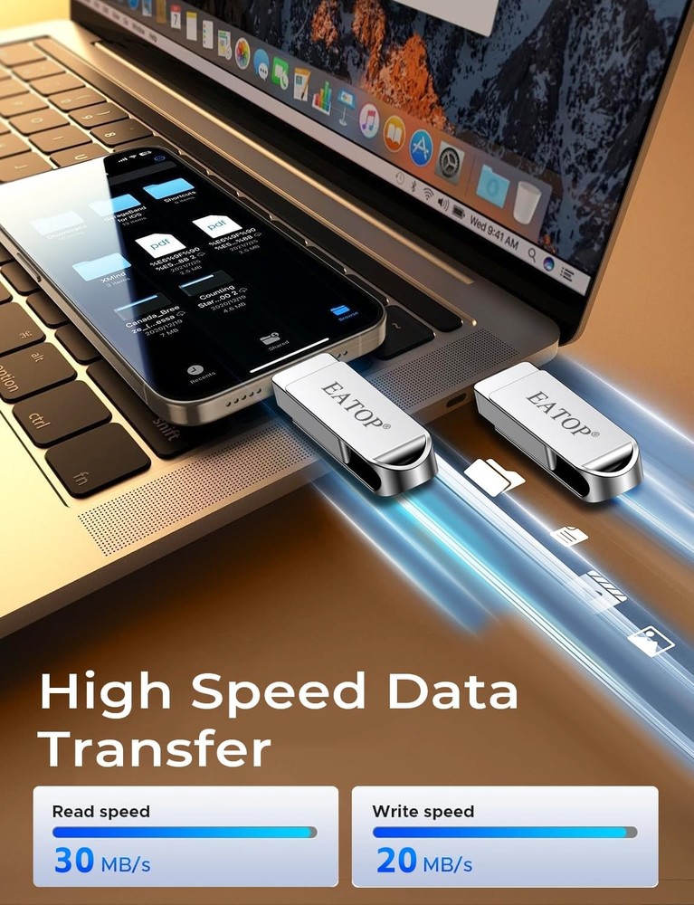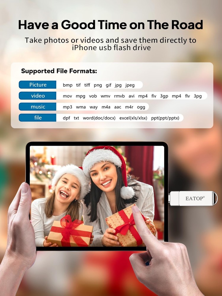 Do you want to make your Phone more convenient? Are you tired of your Phone running out of memory? Do you want to keep enough Phone memory during your trip? Plug and Play, No Application Required! Never lose important documents, videos, photos again thanks to large and reliable Phone flash drives. Free up iPhone and iPad Memory Space Immediately If your iPhone or iPad has almost used up all the memory space, this iPhone USB storage flash drive can help alleviate 512GB of storage space. Whether you like to shoot short videos or take selfies, our iPhone memory stick are perfect for you. Quickly Backup Without Using iTunes or Cloud You can easily backup and manage files at any time. No need of iTunes or Cloud, manage files, pictures and videos through the mobile app to quickly backup to iPhone flash drive, save the storage space of the mobile phone, and at the same time, operations such as forwarding files on the USB drive can be performed. Plug and Play Share your photos, videos, songs and other files between iPhone picture stick easily. You don't have to pay extra for additional storage, just insert iPhone external storage and enjoy the extra space of your flash drive. High Transfer Speed Smart and upgraded chip with high efficiency and stability. read speed up to 30MB/s and write speed up to 15MB/s. The upgraded chip provides you with more efficient storage experience. How to Transfer for iPhone iPad Requires iOS 13 and higher: Simply insert the flash drive into your iPhone iPad, then go to the "Files" app to find "Untitled" and move files to your iPad or iPhone as needed. How to Transfer for Android Android phones need to support OTG, and flash drives can be found in the “File Manager” of most Android devices. 【Plug and Play, No Application Required, Instantly Increases iPhone and iPad Memory Space】If you almost used up all space on your iPhone or iPad, this photo stick for iPhone helps to expand your memory at full storage with 512GB. And usb memory stick for photos is also a great partner for traveling photographers editing on iPad. Using this memory device for your iPhone, iPad or Computers, no worries with the iPhone storage anymore! 【Multi-Port USB Drive】The 3 IN 1 phone photo stick with USB-C Port/ USB-L Port/ USB Port (Independent interface), which is more convenient for data transfer between different devices, so as to get rid of the data cable and iTunes and iCloud, let you switch easily storage space. The Phone thumb drive is designed for use with a wide range of devices, Compatibility iPhone 16/15/14/13/12/11/8/7/6S/SE/XR/XS/XS Max/X Series/iPad Air Series/iPad Pro Series. Also support Android smartphones/Computers and other devices with USB-C Ports. (Tip: For iPhone system version requires iOS 13 or higher, For Android smartphones need to open OTG function) 【Watch Movies, Photos and Play Music Directly From Phone Flash Drive】Store your favorite videos, audios and music on your iPhone's Photo Stick, then seamlessly plug and play on your iPhone or iPad anytime, anywhere. No more need for Internet or WiFi. This iPhone storage device plays videos in many different formats.Pictures stored on the Phone storage device also support different formats. Great way to store all your pictures and videos on an phone external storage device. 【High Transfer Speed】Transfer photos, videos, and files in seconds with our USB stick. With a write speed of up to 15 MB/s and a read speed of up to 30 MB/s, our flash drive for iphone have higher performance than conventional usb storage flash drive. Save time and get more done with iphone photo storage stick. Enjoy the whole relaxing trip with never stuttering or buffering video play on the go. (Tip: No Third-Party Apps Required, Simply insert the flash drive into the iPhone iPad and go to "Files" app) 【How to transfer in iPhone iPad】Requires iOS 13 and higher: Simply insert the flash drive into your iPhone iPad, then go to the "Files" app to find "Untitled" and move files to your iPad or iPhone as needed. 【How to transfer in Android Phones】Android phones need to support OTG, and flash drives can be found in the “File Manager” of most Android devices. 【Kindly Note】1) For Flash Media Devices, 1 megabyte = 1 million bytes; 1 gigabyte = 1 billion bytes. Actual useable capacity may vary. Some of the listed capacity is used for formatting and other functions, and thus is not available for data storage. 2) Up to 30MB/s read speed, write speed is lower. Based on internal testing; performance may be lower depending on the host devices and user’s settings and configurations. 【Kindly Note】The phone case may prevent the proper connection between a phone and a usb flash drive, which could result in the phone being unable to recognize the usb flash drive. In this situation, please do not conclude that the usb flash drive cannot be used, remove the phone case and try again. 【Reliable After-Sales Service】Experience the convenience of high-quality USB memory stick and enjoy our premium customer service at the same time. For the phone flash drive, if you have any questions, we are willing to provide help.