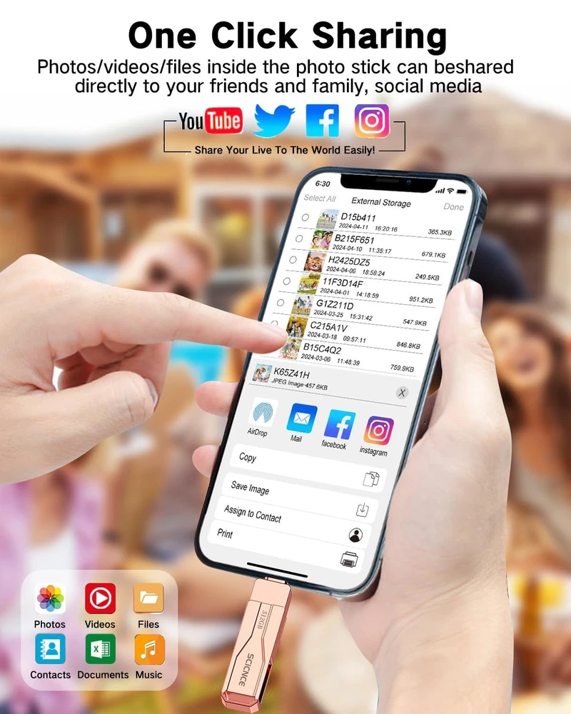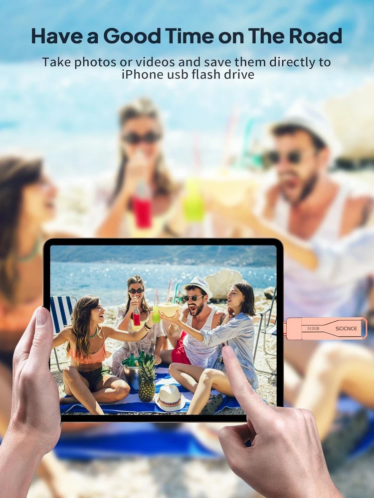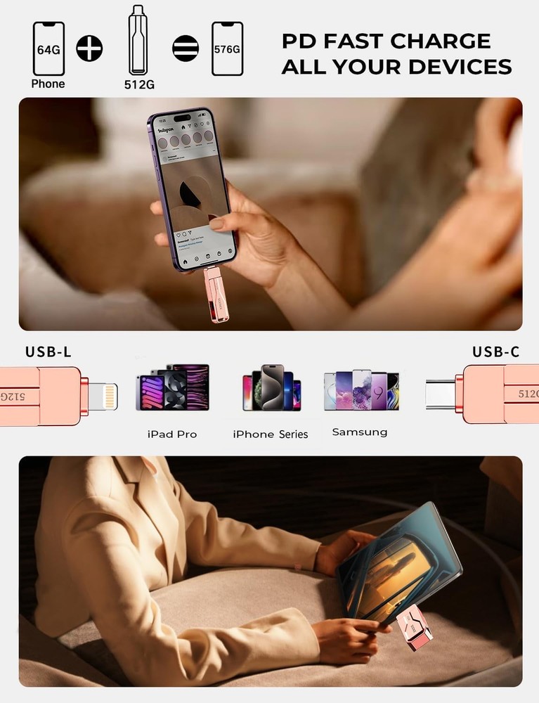 Do you want to make your Phone more convenient? Are you tired of your Phone running out of memory? Do you want to keep enough Phone memory during your trip? Plug and Play, No Application Required! Never lose important documents, videos, photos again thanks to large and reliable Phone flash drives. Free up iPhone and iPad Memory Space Immediately If your iPhone or iPad has almost used up all the memory space, this iPhone USB storage flash drive can help alleviate 512GB of storage space. Whether you like to shoot short videos or take selfies, our iPhone memory stick are perfect for you. One-Click Backup You can easily backup with one click and manage files at any time. No need of iTunes, manage files, pictures and videos through the mobile app to quickly backup to iPhone flash drive, save the storage space of the mobile phone, and at the same time, operations such as forwarding files on the USB drive can be performed. Plug and Play Share your photos, videos, songs and other files between iPhone picture stick easily. You don't have to pay extra for additional storage, just insert iPhone external storage and enjoy the extra space of your flash drive. High Transfer Speed Smart and upgraded chip with high efficiency and stability. read speed up to 30MB/s and write speed up to 20MB/s. The upgraded chip provides you with more efficient storage experience. How to transfer in iPhone iPad Requires iOS 13 and higher: Simply insert the flash drive into your iPhone iPad, then go to the "Files" app to find "NoName" and move files to your iPad or iPhone as needed. How to transfer in Android Phones Android phones need to support OTG, and flash drives can be found in the “File Manager” of most Android devices. 【Plug and Play, No Application Required, Instantly Increases iPhone and iPad Memory Space】If you almost used up all space on your iPhone or iPad, this photo stick for iPhone helps to expand your memory at full storage with 512GB. And usb memory stick for photos is also a great partner for traveling photographers editing on iPad. Using this memory device for your iPhone, iPad or Computers, no worries with the iPhone storage anymore! 【Multi-Interface USB Stick Device】This iphone photo transfer stick features USB-L/USB-C/USB interfaces (with separate adapters), facilitating easy data transfer between different devices. No longer reliant on data cables, iTunes, or iCloud, you can securely store important files, photos, and other data. Never worry about running out of iPhone storage space again—you can also back up your files to a computer via the USB port for added security, and access and share them anytime. (For iPhone/iPad: System Version Requires iOS 13 or Higher. For Android smartphones: Need to open OTG function) 【High Transfer Speed】Transfer photos, videos, and files in seconds with our USB stick. With a write speed of up to 20 MB/s and a read speed of up to 30 MB/s, our flash drive for iphone have higher performance than conventional usb storage flash drive. Save time and get more done with iPhone photo storage stick. Enjoy the whole relaxing trip with never stuttering or buffering video play on the go. (Tip: No Third-Party Apps Required, Simply insert the flash drive into the iPhone iPad and go to "Files" app) 【Watch Movies, Photos and Play Music Directly From Phone Flash Drive】Store your favorite videos, audios and music on your iPhone's Photo Stick, then seamlessly plug and play on your iPhone or iPad anytime, anywhere. No more need for Internet or WiFi. This iPhone storage device plays videos in many different formats. Pictures stored on the Phone storage device also support different formats. Great way to store all your pictures and videos on an phone external storage device. 【How to transfer in iPhone iPad】Requires iOS 13 and higher: Simply insert the flash drive into your iPhone iPad, then go to the "Files" app to find "NoName" and move files to your iPad or iPhone as needed. 【How to transfer in Android Phones】Android phones need to support OTG, and flash drives can be found in the “File Manager” of most Android devices. 【Reliable After-Sales Service】Experience the convenience of high-quality USB memory stick and enjoy our premium customer service at the same time. For the phone flash drive, if you have any questions, we are willing to provide help. (Note: The phone case may prevent the proper connection between a phone and a usb flash drive, which could result in the phone being unable to recognize the usb flash drive. In this situation, please do not conclude that the usb flash drive cannot be used, remove the phone case and try again) 【Kindly Note】For Flash Media Devices, 1 megabyte = 1 million bytes; 1 gigabyte = 1 billion bytes. Actual useable capacity may vary. Some of the listed capacity is used for formatting and other functions, and thus is not available for data storage. 【Kindly Note】Up to 30MB/s read speed, write speed is lower. Based on internal testing; performance may be lower depending on the host devices and user’s settings and configurations.
