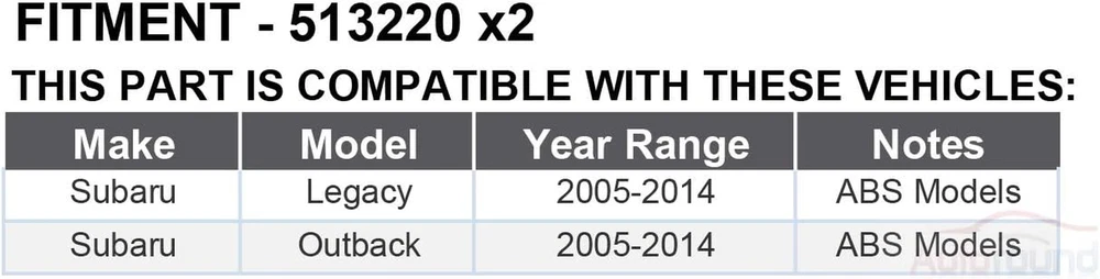 Store New Arrivals Add to Favorite View Feedback Contact 513220 Both Front Driver Passenger Side Wheel Hub and Bearing Assembly 5-Lug W/Abs, 2-Pack Description Material Alloy Steel Manufacturer Part Number 513220x2 Bearing Type Ball Bearing or Roller Bearing Item Weight 5.83 Kilograms Compatible Lubricant Grease Bearing Number 513220 Specification Met Oem Package Dimensions 13.46 x 7.24 x 7.17 inches COMPATIBILITY - 513220 Wheel Hub Assembly compatible with 2005-2014 Subaru Outback/Legacy FEATURES - 5 Lugs, ABS System, Front Axle, Flange Offset:1.93IN, Flange Diameter:4.88IN, Bolt Circle Diameter:3.94IN. Replaces parts - BR930473 HA590118 28373AG00A QUALITY - Autoround Wheel Bearing and Hub Assemblies has been quality tested to meet or exceed OEM performance standards INSTALLATION - Assembling has excellent performance, precise overall structure, easy and quick installation SERVICE - Support replace, return, service 1 year. Product Description Car & Auto Parts Autoround specializes in Automotive parts products. With over a decade of experience in the industry, we have gained much knowledge and expertise in the field. 513220 wheel hub assembly Look for these telltale signs ABS light is illuminated Steering wheel vibration Clunking or grinding noise under vehicle Steering wheel play Hub assembies are crucial for safe,quiet operation, and assuring proper ABS function. Good wheel bearing will provide longer service life and smoother operation performance. Fearutes about Autoround Hub Assembly: Smooth running without noise Safe and Reliable Precise fitment Autoround Wheel Bearing&Hub Assembly Fits either LH (Driver Side) or RH (Passenger Side) Each Autoround Wheel Bearing and Hub Assemblies has been quality tested to meet or exceed OEM performance standards. We insist on manufacturing with high-quality material and rigorously controlled manufacturing processes to provide excellent quality and offer customers a great driving experience. Purpose and Commitment: We insist on innovation and development. Our everlasting purpose is Quality first, Integrity-based and Full service. ✔ Condition: New ✔ Location: Front Wheel ✔ Material: Bearing Steel ✔ 5 Lug Bolts w/ABS ✔ Number of Flange Bolts Hole: 4 ✔ Flange Bolt Thread Size: M12X1.25 ✔ Flange Shape: Rectangular ✔ ABS Sensor: Encoder FIT FOR SUBARU 2005 Subaru Outback / Legacy 2006 Subaru Outback / Legacy 2007 Subaru Outback / Legacy 2008 Subaru Outback / Legacy 2009 Subaru Outback / Legacy 2010 Subaru Outback / Legacy 2011 Subaru Outback / Legacy 2012 Subaru Outback / Legacy 2013 Subaru Outback / Legacy 2014 Subaru Outback / Legacy Installation & Unloading Instructions of The Wheel Hub Assembly 1. removing the wheel and hub nut 2. removing the brakes 3. removing the abs sensor and the hub 4. installing the new hub 5. reinstalling the abs sensor and the axle nut 6. installing the caliper bracket and rotor 7. installing the brake caliper 8. reattaching the wheel * Please verify fitment for your vehicle in the product description before purchasing ABOUT US We offer the best prices around on high quality products. Our E-store includes media such as books, movies, music and games while offering electronics, toys, sporting apparel, clothing, tools, general home, garden items and more. SHIPPING We are always working hard to ensure your package arrives as soon as possible. Please understand that some factors like weather, high postal traffic, and the performance of shipping companies are outside of our control. We offer free shipping to the lower 48 states and ship within 2 business days of payment, usually sooner. We do not accept P.O. Boxes. Please provide a physical address. For shipping outside of the continental USA, we only use eBay's Global Shipping Program.The item is shipped to KY and then sent to the rest of the world. International customers are responsible for all duties and taxes. Continue to check out in order to calculate costs for shipping the item to your country. Messages regarding eBay's Global Shipping Program MUST be directed at eBay EXCLUSIVELY. RETURNS We offer a 30-Day Return Policy on items which you are not completely satisfied with. You have the option for a full-refund or an exchange of the item. No returns are available on items shipped outside of the USA. PAYMENT We accept PayPal. CONTACT US This page content is yet to come Please ad us to your favorite seller and visit again later Thank You CUSTOMER SATISFACTION We try our very best to make sure every customer is completely satisfied. If there's a problem, message us! We're happy to help. WE ACCEPT Copyright © 2021 AutoDS. | All Rights Reserved