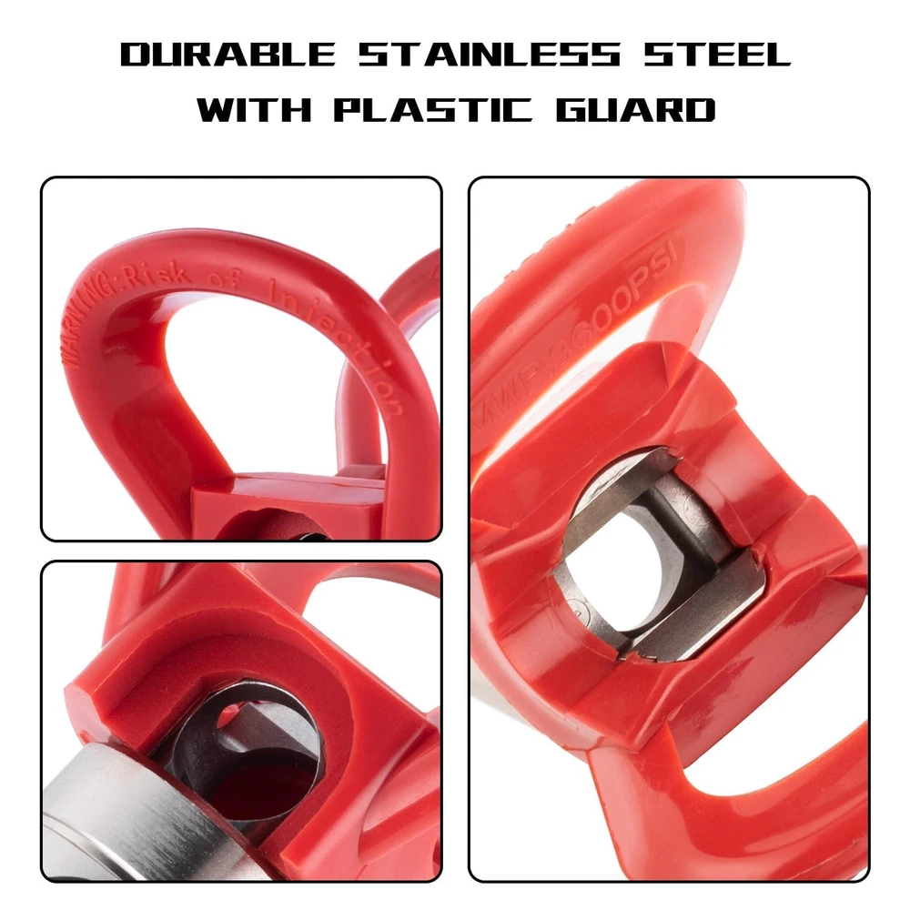Model:243611,Nozzle:517 Product Size: Approx. 2.6X 2.4 X 1.8 IN Package Weight: 0.23 IBS Material: brass, hard aluminum,strength plastic. 517 tip Composed of 304 stainless steel handle and tungsten carbide orifice. Color: red and yellow Suitable places:“Frac 5” spray tip is a wide pattern. Suitable for most mainstream airless spray guns and coatings,small to medium-sized and large residential, commercial buildings spraying works, sprayable interior and exterior paint, oil paint. It can be used for paint, furniture, fence, home decoration and industrial fine paint and decoration Strong Fogging & Cleaning Power:Perfect atomization and antiswitched from cleaning ability, depending on the size of the aperture, the range will be different. The sprayer tips make an easier preparation of the surface, painting, and other coatings as well as the cleaning after painting Easy to Install: The airless sprayer nozzle is designed for airless spraying machine,easy to install without tools, easy to operate in a few moments. Thread clear and easy removal. Tips :The first number represents the width of the spray stream the bigger the number,the larger the spray pattern. two followed numbers representing the amount of flow the larger the number the greater the flow 【Professional Precision Spraying】Clog-resistant tip for smooth, streak-free finishes with latex, oil paint, stains & primers. 【Heavy-Duty Metal & Plastic Guard Combo】Built to last with a corrosion-resistant metal nozzle and impact-resistant plastic guard. The sturdy design protects the tip from damage and extends the lifespan of your airless spray gun accessories 【Perfect Fit for 7/8" Thread Spray Guns】Note: Only compatible with spray guns featuring 7/8" threaded joints (check your model before purchase). 【Versatile Applications】- Ideal for interior walls, exterior fences, furniture refinishing, and decks. Works with stains (oil/water-based), primers, and epoxy coatings up to 0.021" viscosity." 【90-Day Satisfaction Guarantee】We focuses on providing high-quality products and first-class services at reasonable prices. If you are not satisfied with our products, you can return them within 90 days