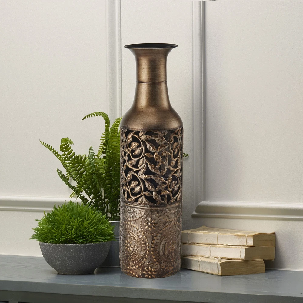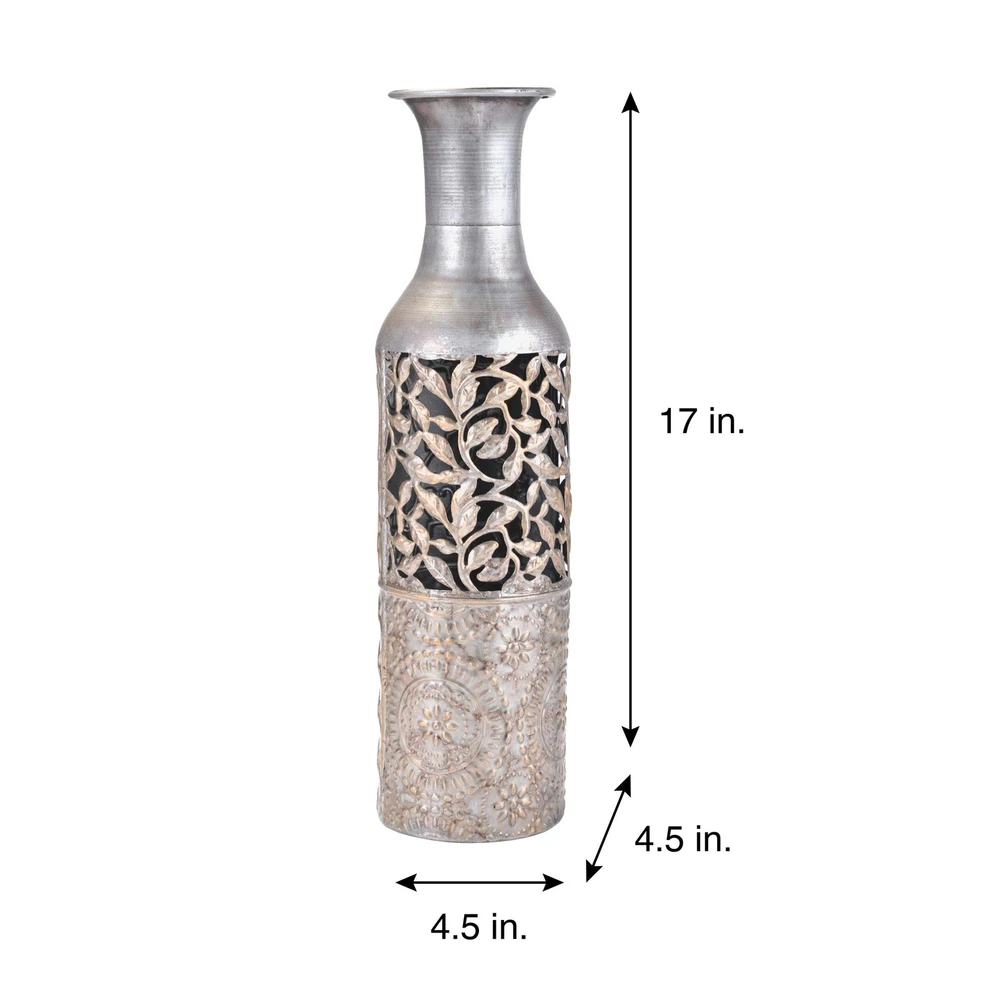 Timeless style meets a modern touch with this Silver embossed decorative vase. Beautifully crafted of metal, this vase features a patchwork embossment with filagree detail. This vase looks great styled alone and when displaying your favorite dried or artificial flowers. For decorative use only; vase should not be used with water. Measures 4.5x4.5x17 inches. INTRIGUING FINISH: This Silver vase features an elegant patchwork embossment with filagree detail DISTINCTIVE DISPLAY PIECE: Use this 17-inch vase for your favorite dried or faux blooms with casual elegance. USE AND CARE: Wipe clean with soft damp cloth, not for use with real flowers. Does not hold water. MEASURES: 4.5x4.5x17 inches METAL: Made of Metal