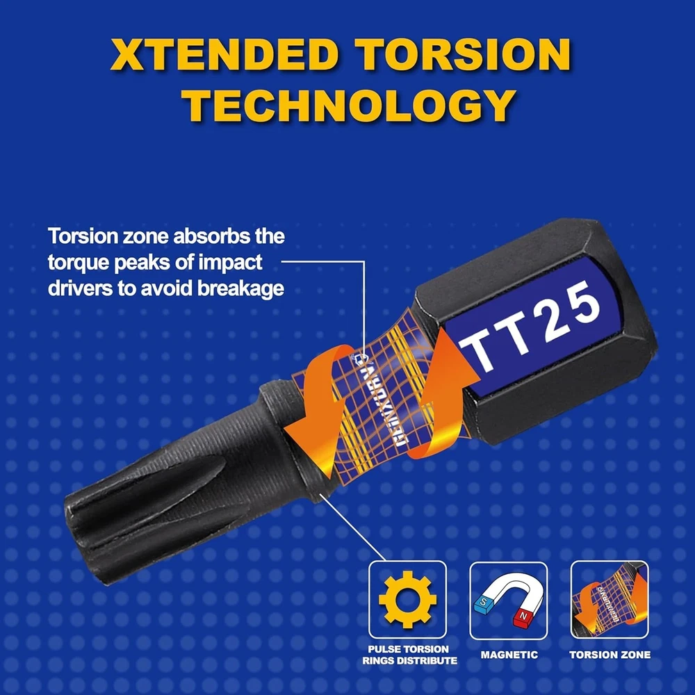51 Pieces Security T25 Impact Magnetic Screwdriver Bit Set, 1 In. #25 Torx Head Insert Bit Set, S2 Alloy Steel Hollow Star Bit Set with 1 Pcs Impact Bit Holder About this item 【Impact Tough Star Bits】50 Pieces 1 inches #25 Torx Head bits and 1 pieces Magnetic impact bit holder, Impact Shock Absorbent Zone stands up to punishment from high-torque impact driver 【Strong Magnetic Bit Set】Strong magnetic to pick up and hold screws easily with no slipping or stripping S2 Alloy Steel: it owns the features of high hardness and good toughness and resistance through strictly heat treatment, durable and suitable for any industrial use 【Precision Star Tips Head】 Precision-engineered bit tips, deliver a better fit and less cam-out, each edge can accurately lock the screw, stabilizes without slipping, and improves work efficiency. Avoid damaging the screw and screwdriver head Wide Range of Uses: Made to fit 1/4 In. hex impact drivers drill screw bit set is not only work with impact driver, but also magnetic screwdriver bit perfect for any regular drill, electric and hand screwdrivers and more