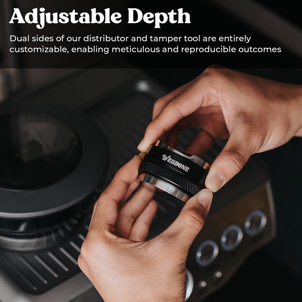 Crafted for Multi-brand Compatibility:The 51mm espresso tamper, designed with an adjustable distributor and base, is meticulously tailored to harmonize with various portafilters and espresso machines. Compatible brands include Delonghi pump machine series, Capresso PRO and Breville 800 Series and other espresso machines with 51mm portafilter Consistent Brewing Stability:assures a stable brewing experience by delivering uniform distribution and pressure every time. Pulling a perfect shot at home is effortless, thanks to the consistent tamp achieved by leveling the coffee grounds before tamping. Adjustable Depth and Comfortable Grip:With height adjustability catering to any portafilter basket depth, our 51mm espresso tamper ensures consistent tamping pressure, resulting in an exceptional cup every time. The diamond-patterned grip provides a non-slip, incredibly comfortable feel in your hand. Dual-Head Design for Unmatched Versatility:Experience unparalleled versatility with our dual-sided distributor/leveler and tamper. The ingeniously designed unit offers flexibility, making it a versatile tool for various coffee-making techniques. Pro Tips for Enhanced Enjoyment:shares professional insights to elevate your experience. Ensure the portafilter basket is fully dosed with coffee grinds for optimal tamper pressure, creating a tighter pack and richer flavor. Groom the basket's top with a finger or flat edge before leveling and tamping. Brew with high-quality, filtered water for an exceptional result.