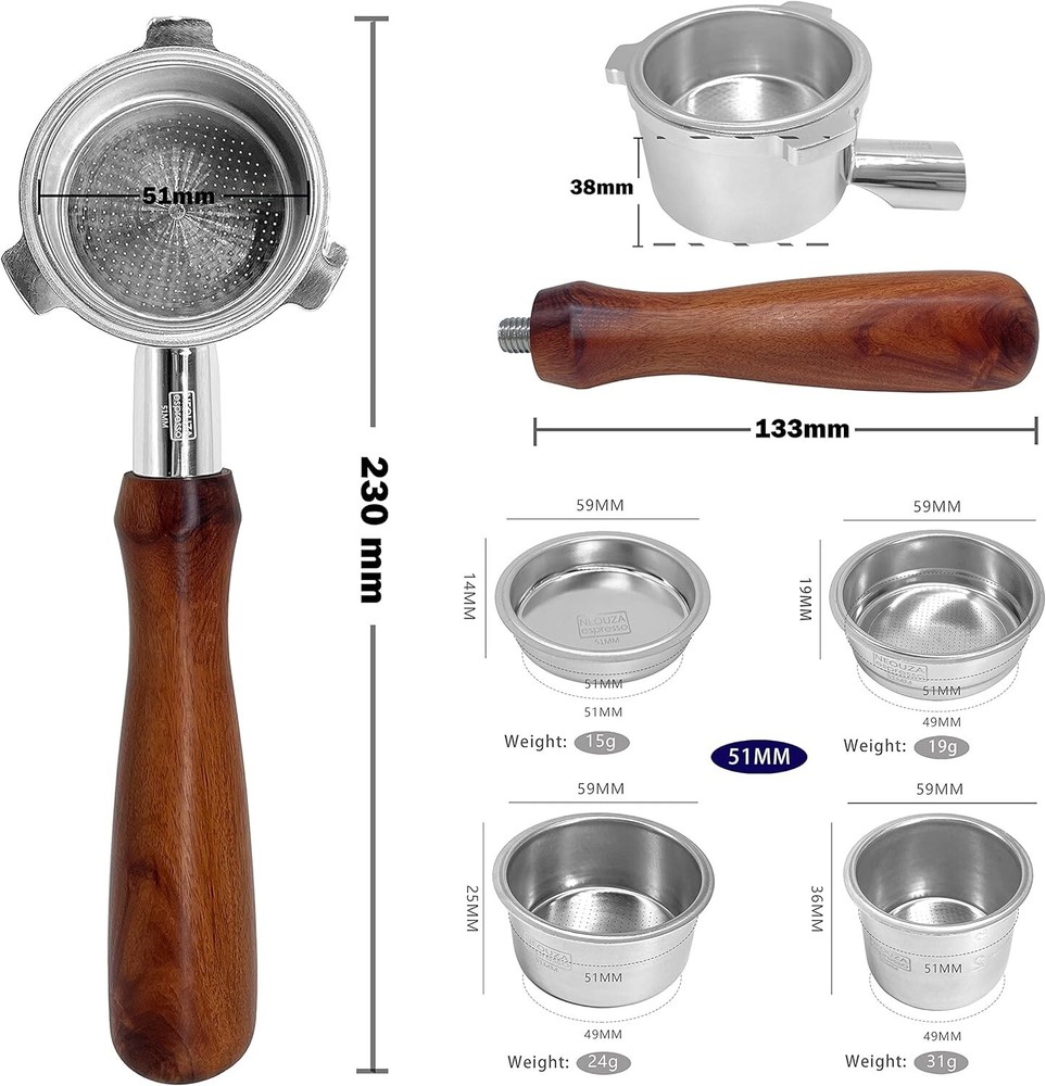 About this item High-Quality Material——Made of thick and food-grade 304 stainless steel, the 51mm bottomless portafillter is safe, hygienic and anti-corrosion. The handle is very comfortable to hold because of being made of high-quality natural rosewood, each of which has a unique color and grain. Adaptive Models——The bottomless portafillter is compatible with DeLonghi EC9155M EC9335M EC9355M EC9665M, which can be used compatibly with 51mm fillter basket, 51mm Distributor, and 51mm Tamper. Unique Advantages——The bottomless portafillter allows you to clearly observe the entire process of extraction, helping you find problems in the extraction process. It is very convenient for you to disassemble and clean the bottomless portafillter. Compared with standard portafillters, the bottomless portafillter is much more hygienic. Discount Package——The gift includes a 1-cup fillter basket,a 2-cup fillter basket, a 4-cup fillter basket,a backflush blind filter,a Scoop Clip,a PP brush and a special brush for cleaning the brewing head of coffee machine. If you have problems with the extraction liquid flowing too fast, splashing, or falling into multiple jets during use, you can adjust the grinding degree and use finer coffee powder for extraction.
