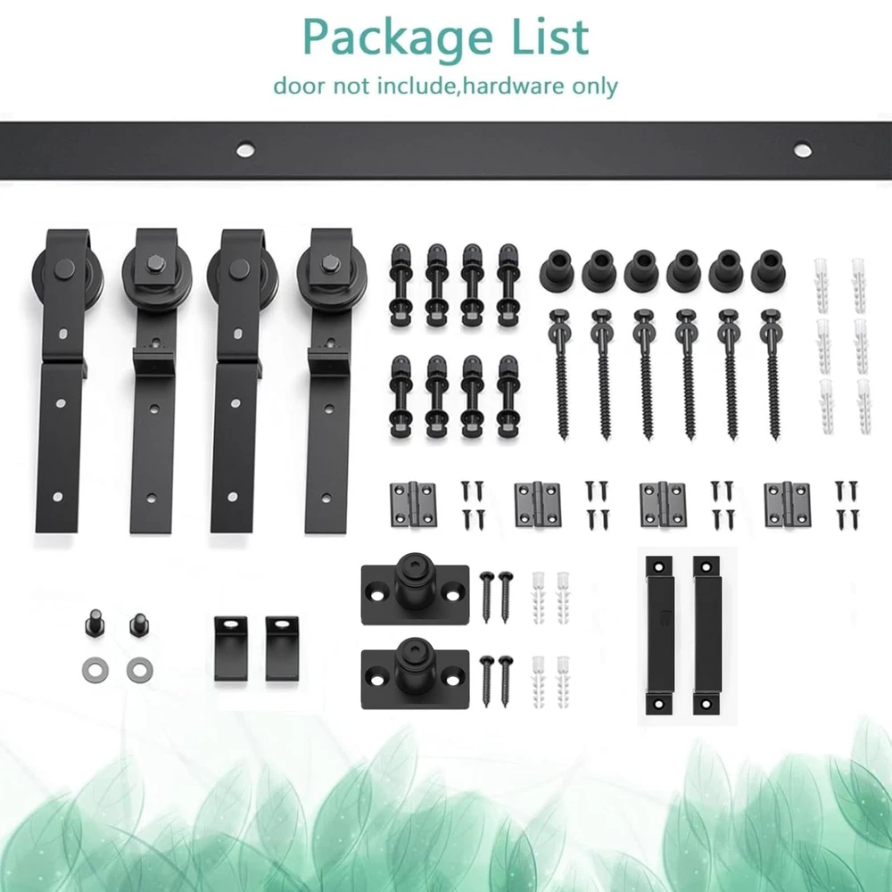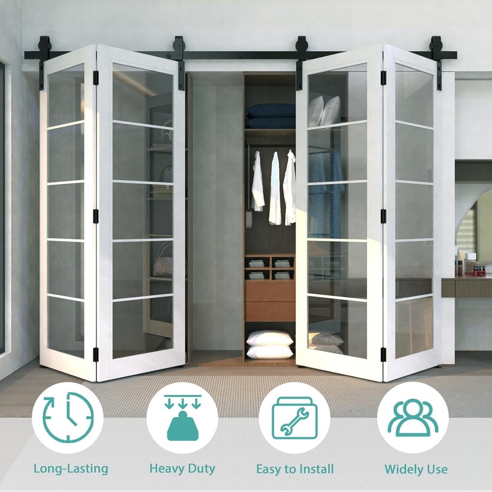 Bi-Folding Sliding Barn Door Hardware Kit 【Superior Quality】Made of black heavy-duty steel, it has the benefits of sturdy, durable, wear-resistant and corrosion-resiatant. The roller is a combination of high-quality bearings and nylon wheels, matched with 6mm thick track to improve the bearing capacity of the product. And it has undergone 120,000 tests to ensure quiet and smooth sliding. 【Unique Design】Different from the traditional hardware kit on the market, the folding door kit can greatly save you space. And the scope of application is wide, can be used in a variety of living occasions, such as living room, dining room, study, etc. 【Package List】Packing: 1x 4.3FT track, 2x roller, 2x roller rotating bracket, 1x roller fixator, 3x spacer, 3x hinge, 1x floor guide, 1x Sealing Strip. Fit Door Thickness: 1-3/8"~1-3/4"(35mm~45mm). [Friendly reminder: DOOR NOT INCLUDED] 【Easy to Install】The total width of the door panel plus 4" is the length of the track. We provide detailed Bi-Fold sliding barn door kit instructions with pictures and text, which can be intuitively installed by yourselves, saving the time and cost of finding an installation team for you. 【Easy Install & 24 Hours Stand By】We have a professional customer service team 24 hours online to help you. If there is any problem about our products, please let us know and we will try our best to solve your problem.