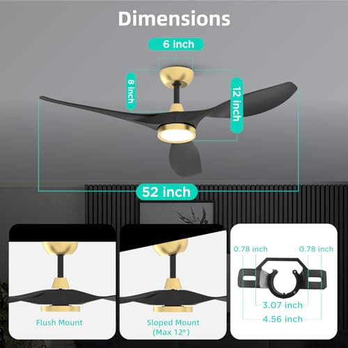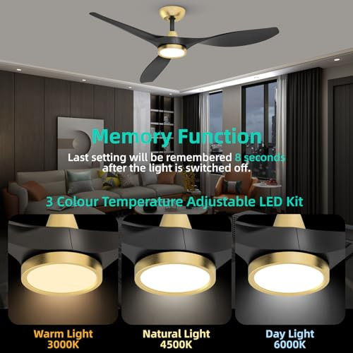 Return Policy Fast Delivery Trusted seller Ceiling Fans with Lights and Remote, Ceiling Fan 52 Inch Black Gold Color Quiet DC Motor 3 CCT Memory Modern Large Airflow Noiseless Reversible 6 Speeds 3 Timers Indoor for Living Room Product Description Three Color Temperature Lighting and Memory Function: This 52 inch ceiling fan with light features LED lighting with three color temperature options; easily switch between them using the remote control; the built-in memory function recalls your last setting for added convenience Quiet and Efficient DC Motor: Equipped with a dependable DC motor, this black ceiling fan with light operates quietly and efficiently; the motor’s slower speed minimizes electricity use and wear, improving energy efficiency and durability Multi Function Remote Control: The included remote control offers full functionality, allowing you to adjust six fan speeds and set one, four, or eight-hour timers; designed for easy use by all ages; ideal for ceiling fans with light and remote Reversible Motor for Year Round Comfort: Enjoy comfort in every season with the reversible motor; switch between upward and downward rotation to stay cool in summer and warm in winter, maintaining an ideal room temperature; perfect for any ceiling fan Simple Installation with Video Guide: Designed for ease of installation, this ceiling fan includes a specialized hanging rod supporting slopes up to 12 degrees; all necessary accessories are included, along with a detailed video tutorial for a straightforward setup in ceiling fans with light Shipping Returns Payment Shipping Shipping is FREE to all addresses other than APO/PO boxes in the lower 48 states. All our stock ships from US-based warehouses. Shipped via USPS or UPS (depending on location and package weight) Unless stated otherwise, all orders will ship within 24-72 hours of your payment being processed. Check our feedback to see the great reviews of FAST shipping we offer. Returns Seller does not accept returns Payment We currently accept payment via eBay managed payments only. Once payment is cleared, we will dispatch your shipment within 1-3 business days. Please refer to the "Shipping" tab for more information regarding shipping speed to your destination.