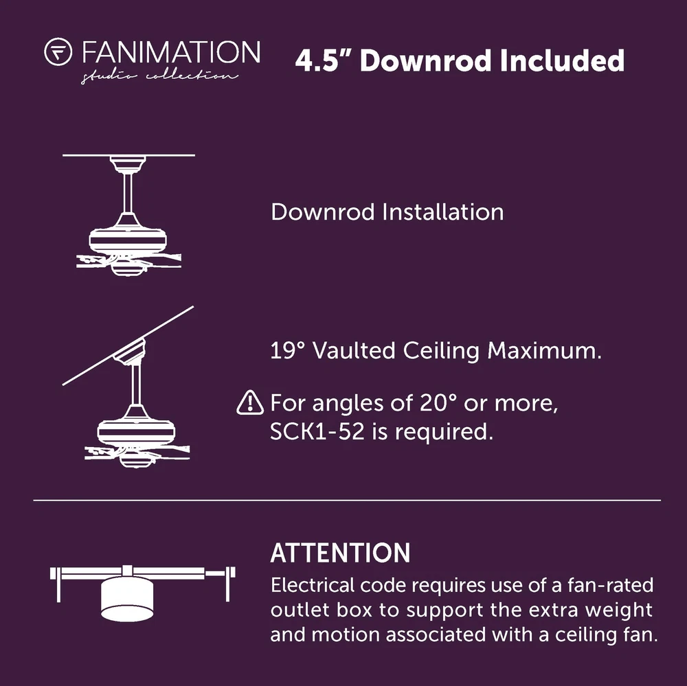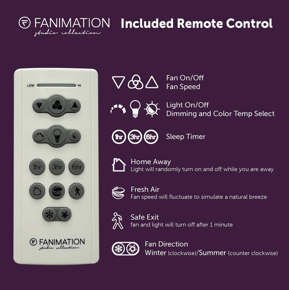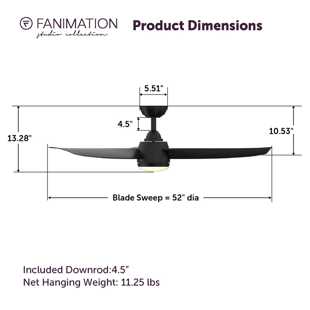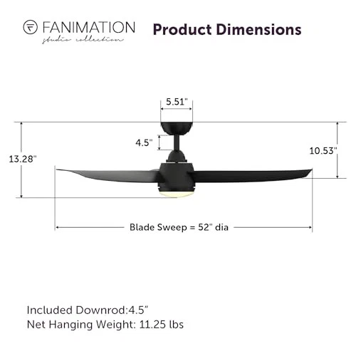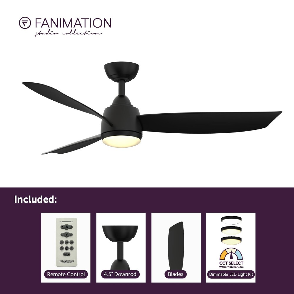 The 52 inch Fanimation Studio Collection AireFlex ceiling fan features a black finish and 3 blades to bring exciting sophistication to your home. This versatile fan has 16 speed settings, so you can maintain the ideal comfort level with ease. Mounts to flat or sloped ceilings with 4.5-in downrod included. An integrated 18W LED light with frosted glass brings overhead illumination, while featuring a Correlated Color Temperature (CCT) Select Technology which allows you to choose the CCT of your fans light kit - 3,000, 4,000 or 5,000K. Reverse airflow feature allows you to change the fan's direction setting seasonally, so cool air is pushed down or warm air is distributed evenly. 16-Speed, Reversible DC Motor provides airflow up to 5,910 CFM. Compatible with most smart home devices (required control sold separately) Black finish ceiling fan from the AireFlex Collection features 2 blades in a Black finish with an 18-watt LED light kit with frosted glass shade. TR305S hand-held remote control is included. Push button remote control with 16 fan speeds, fresh air, reverse, ON/OFF dimmer light levels, color temperature, fan/light timer, home away, safe exit and off button Fan comes with an 1" diameter x 4.5" length threaded downrod. Optional downrods are available in lengths up to 72 inches. For installations requiring a longer downrod, a downrod coupler is available. Fan can be mounted on a sloped ceiling up to 19°. Optional close-to-ceiling kit is available as well - sold separately. Optional sloped ceiling kits (SCK1-52) are available for up to 42°. Damp Rated for indoor and outdoor use